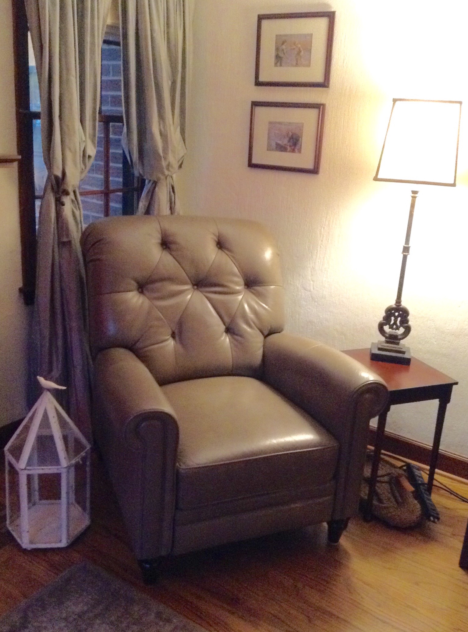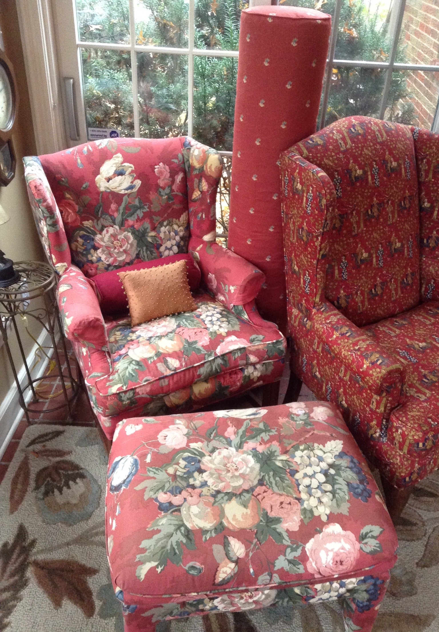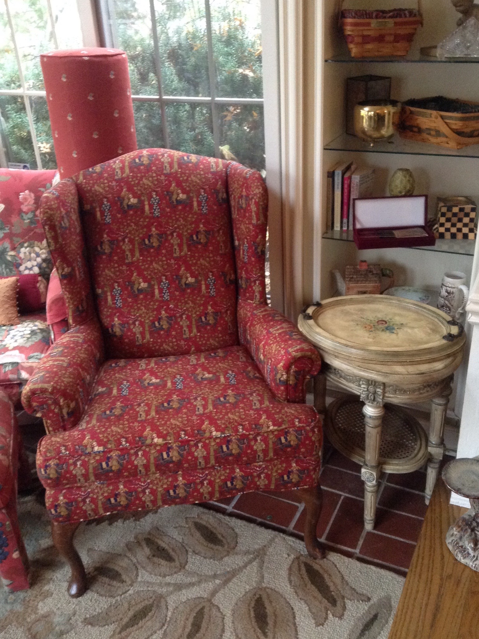 Matching deep red w oriental print wingback chairs, Waverly print wingback w otto, upholstered cane-side loveseat, cream sectional sofa, weathered-look dark brown leather recliner …