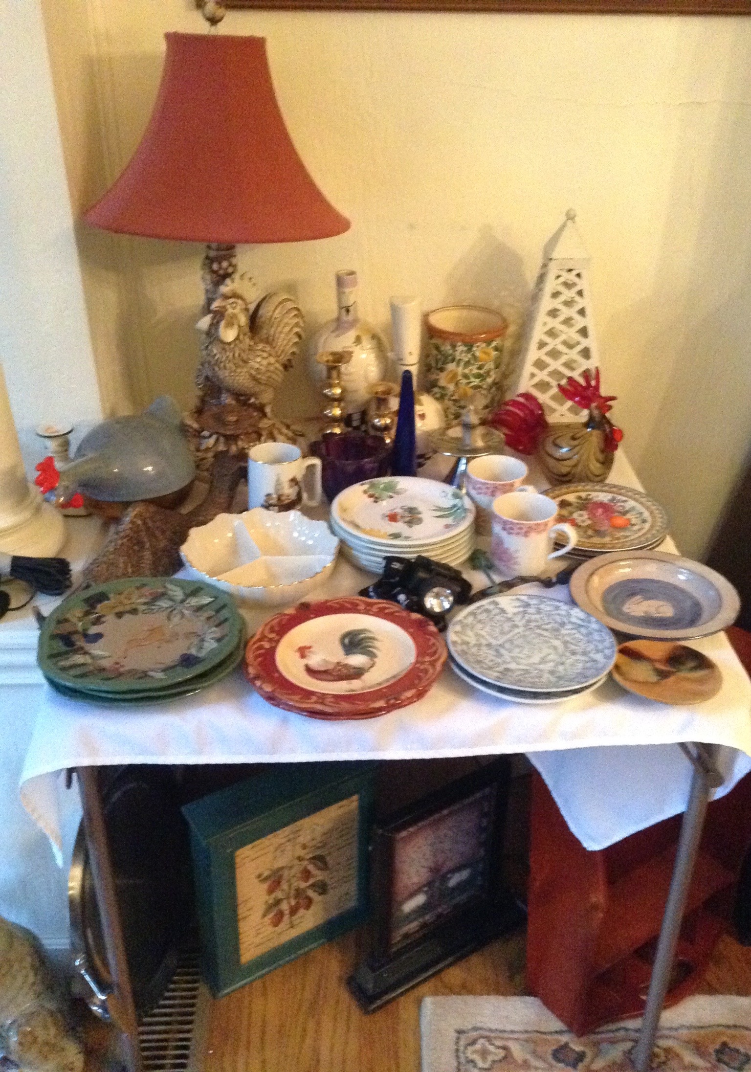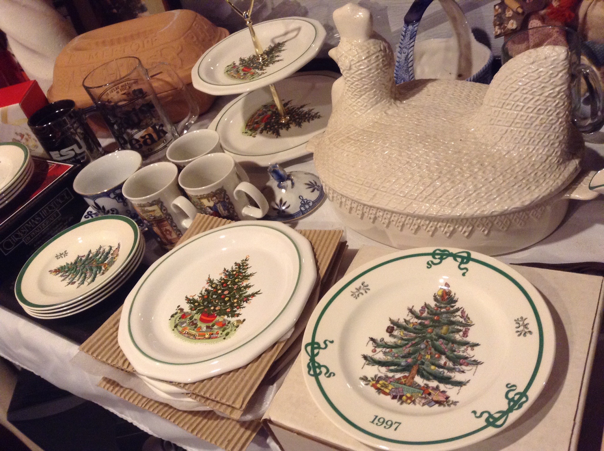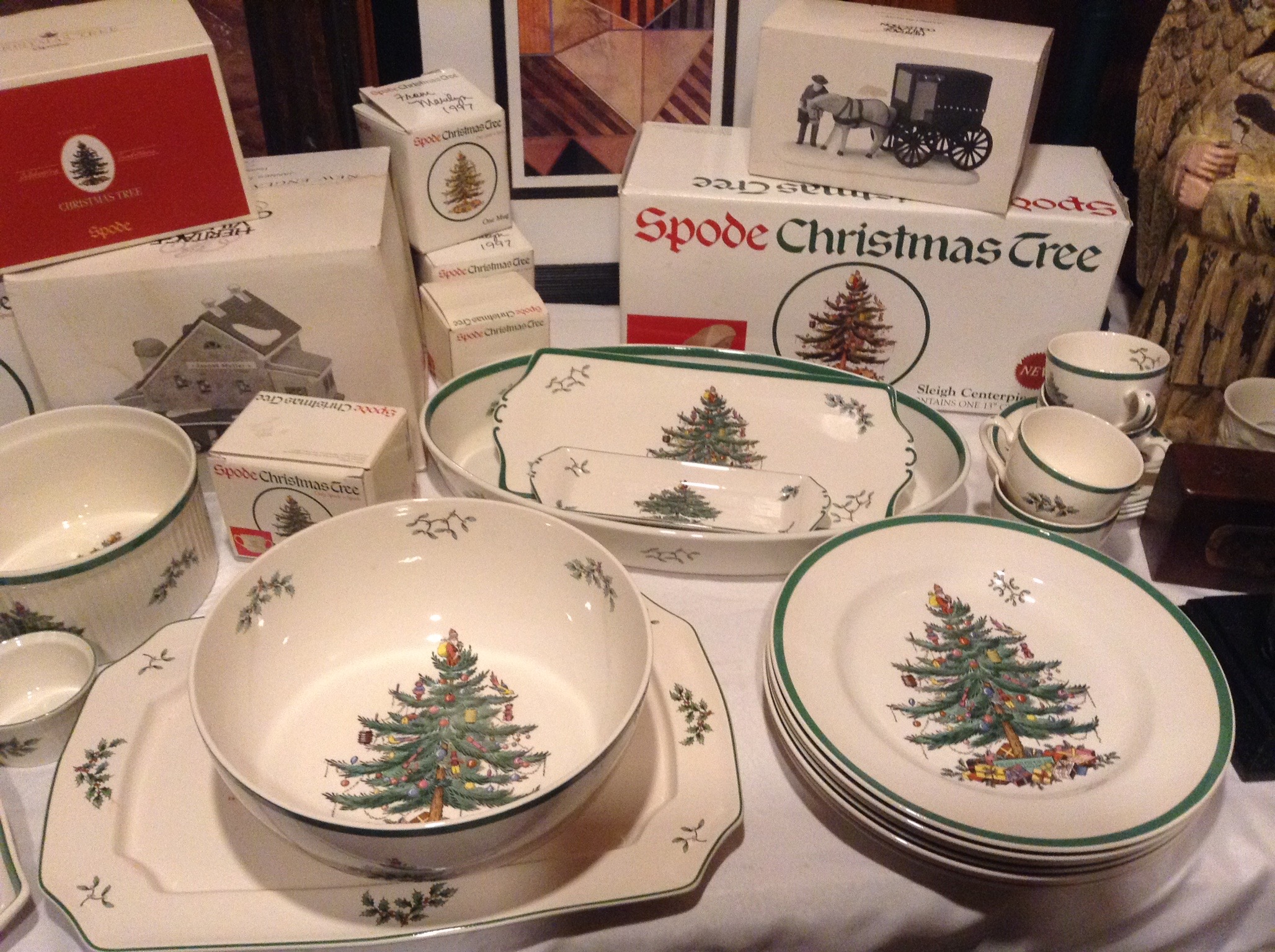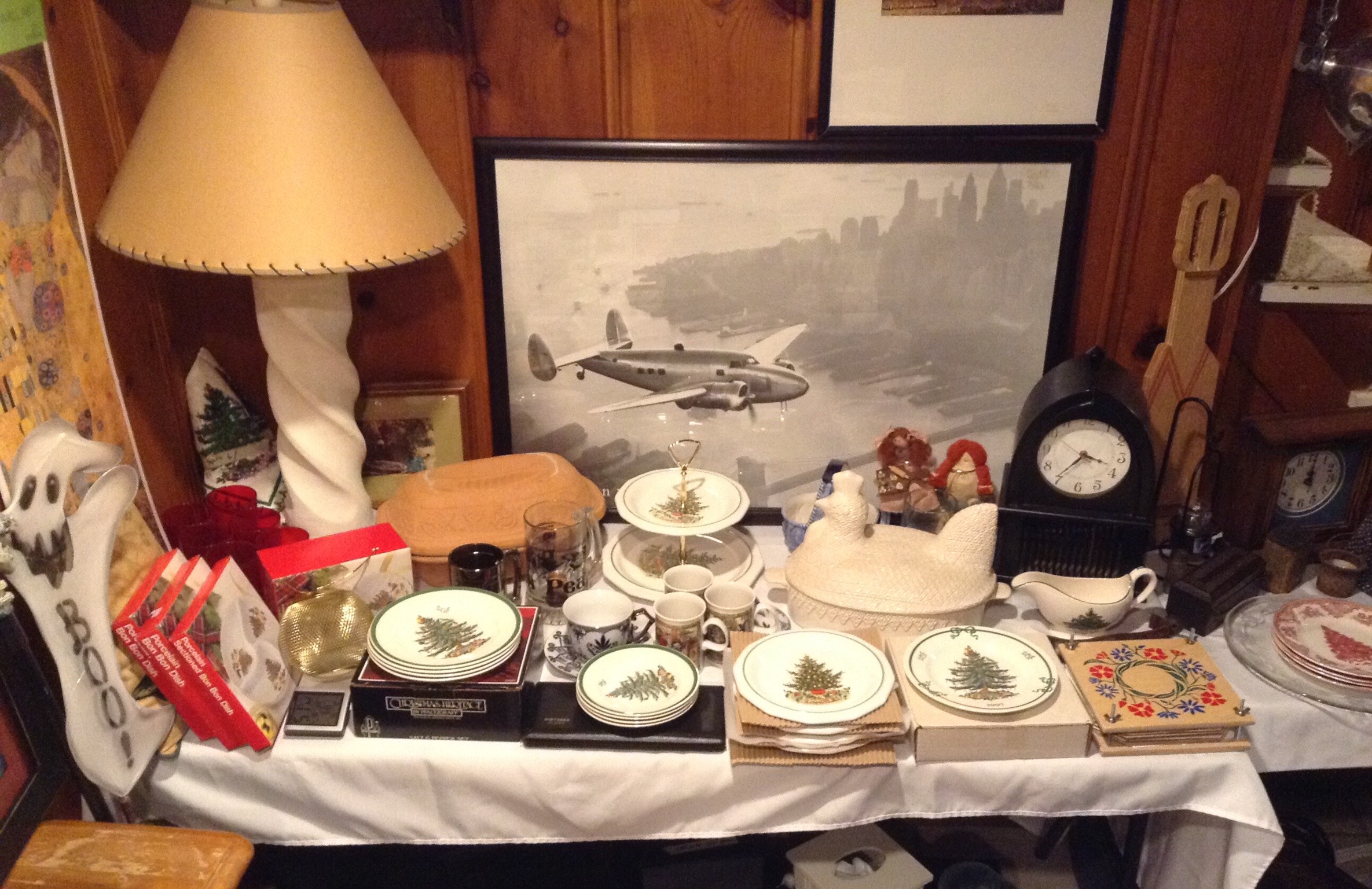 Several tables full of Christmas Spode dishes/serv pcs, framed artwork, Cedar chest, terrific selection of nice lamps, decorative Holiday Houses …