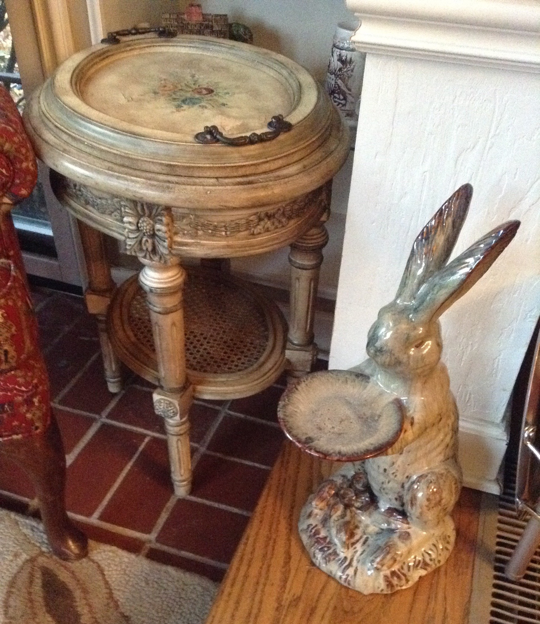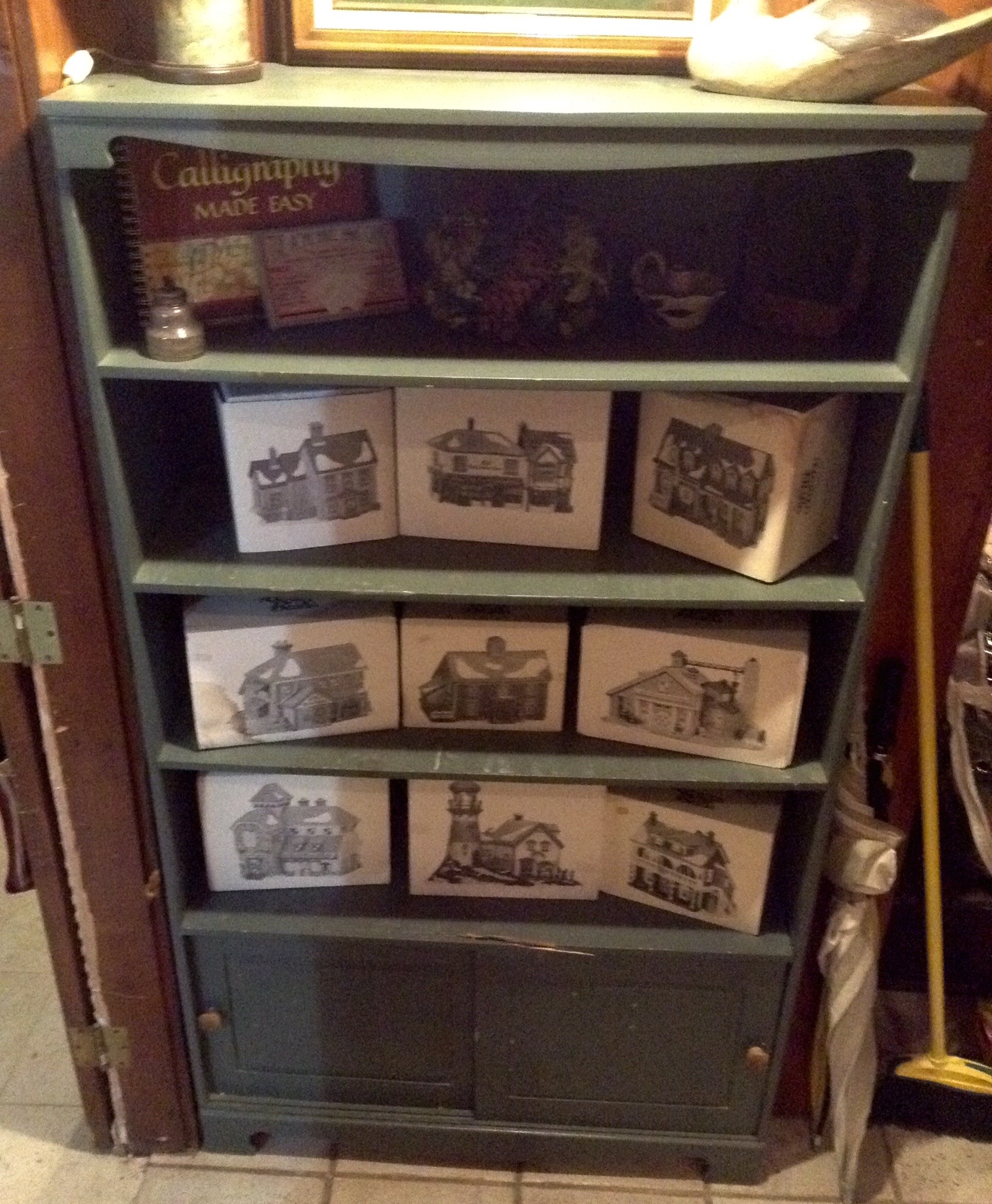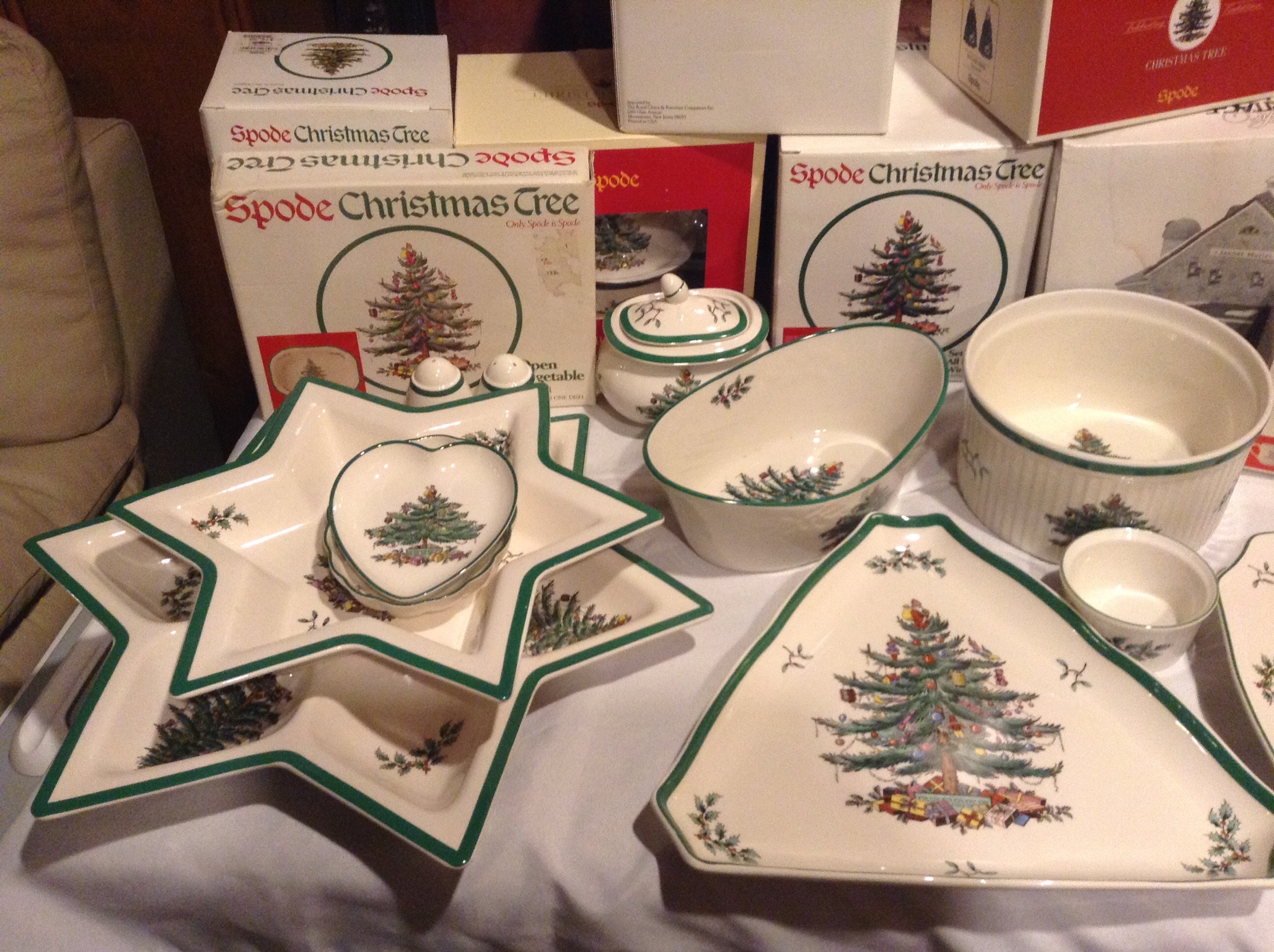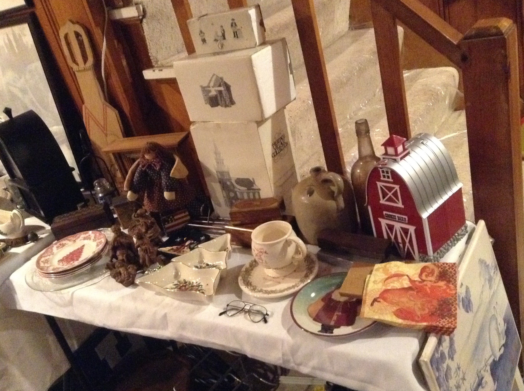 Several tables full of Christmas Spode dishes/serv pcs, framed artwork, Cedar chest, terrific selection of nice lamps, decorative Holiday Houses …