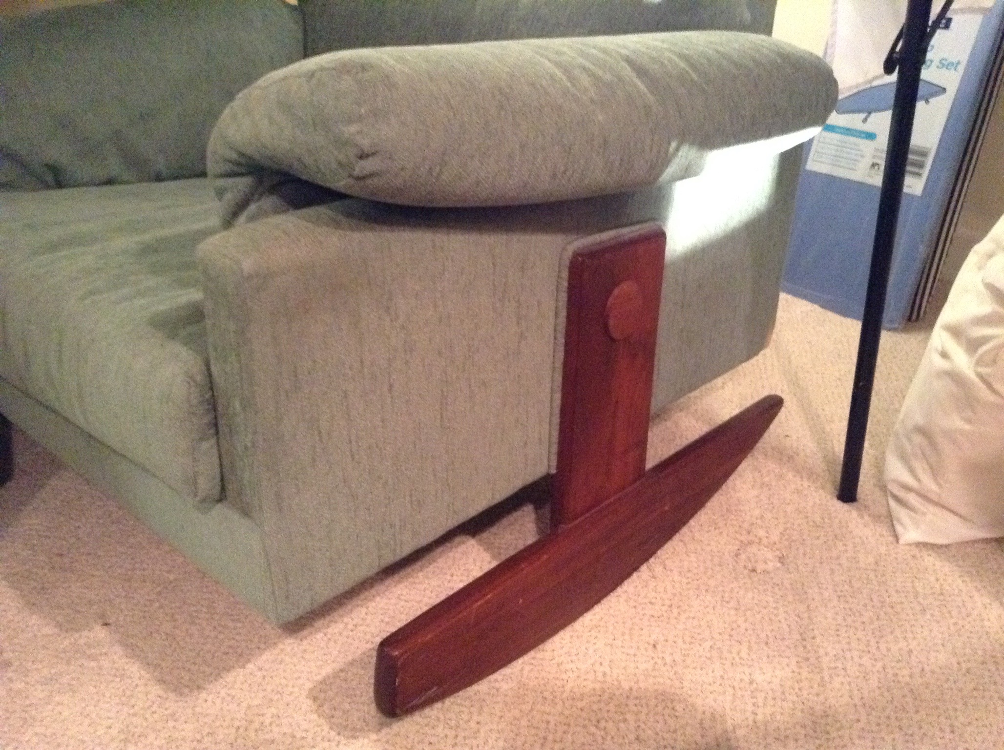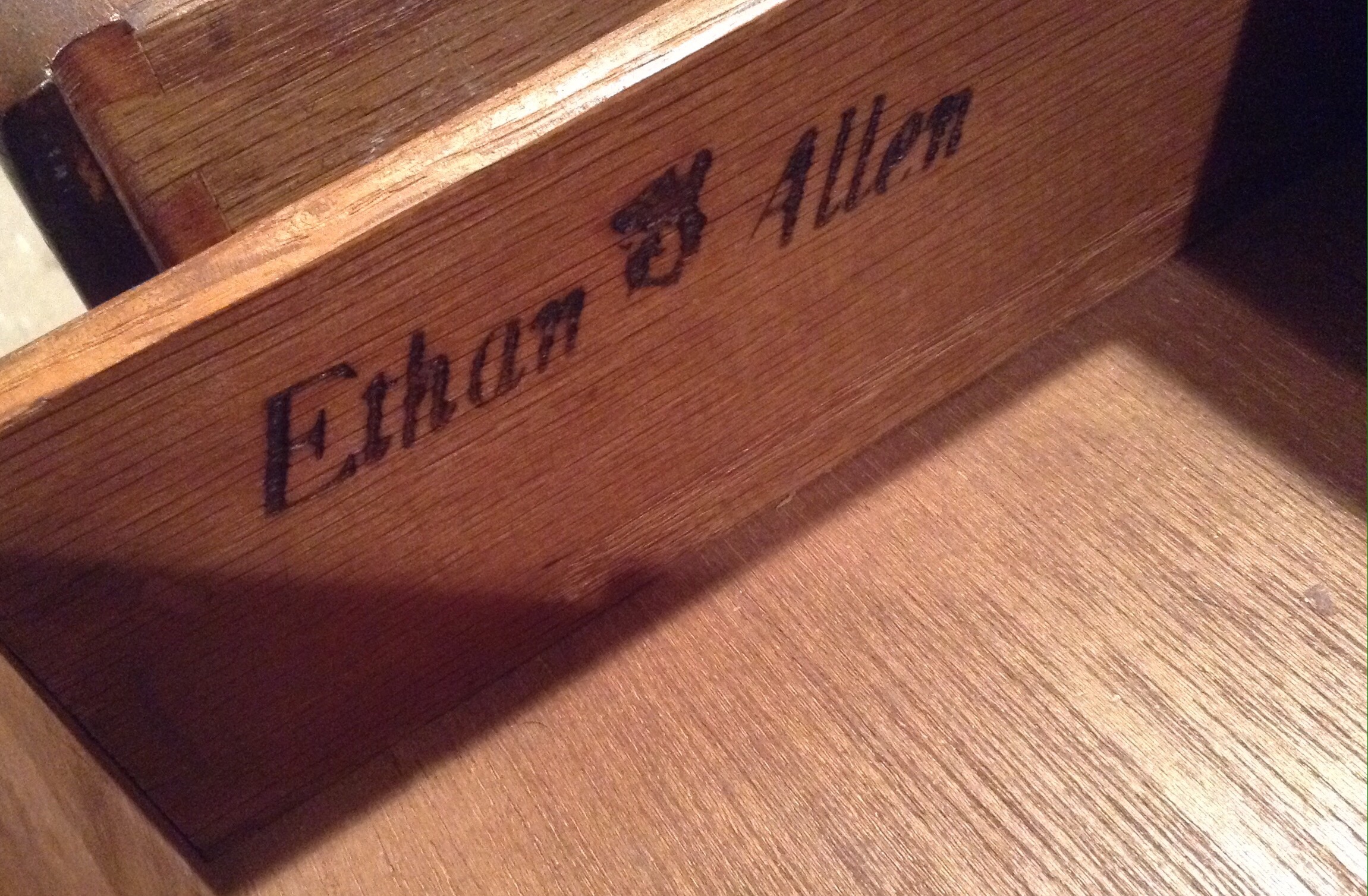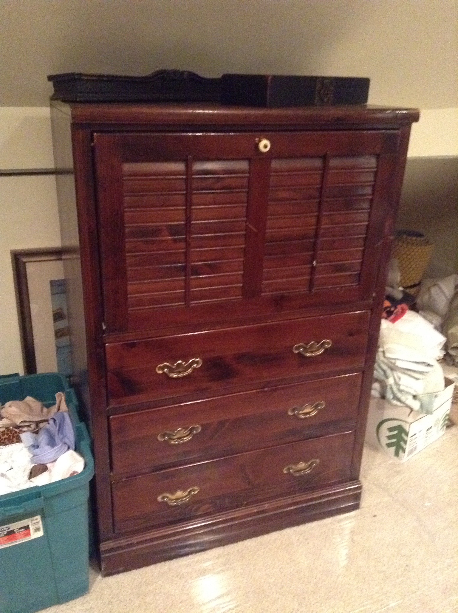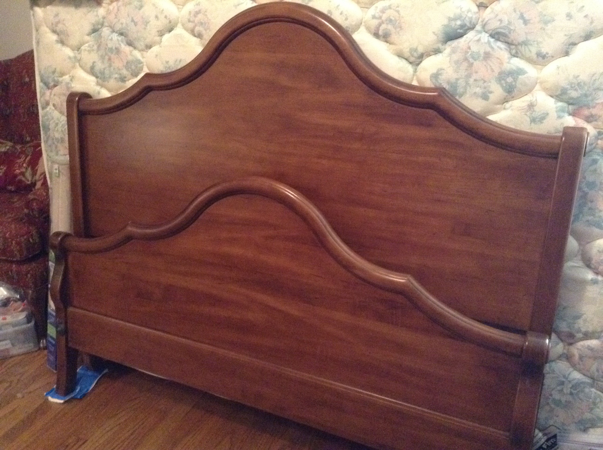 A totally unique mid-cent look sage upholstered rocker, older dark wood Ethan Allen dresser/high-boy and 2 chests … 2 full and 1 Queen mattress sets, 5’ wood storage bench …