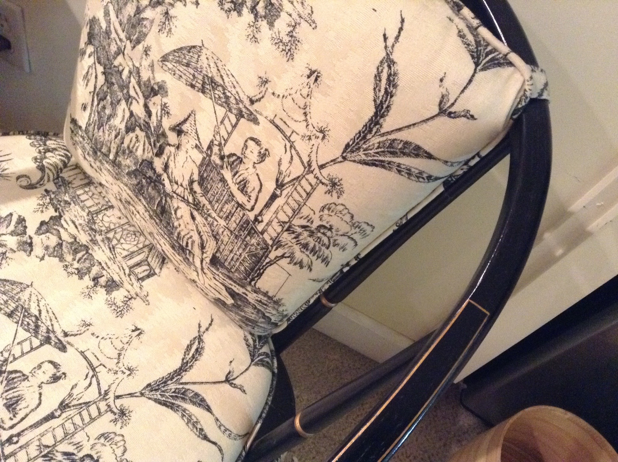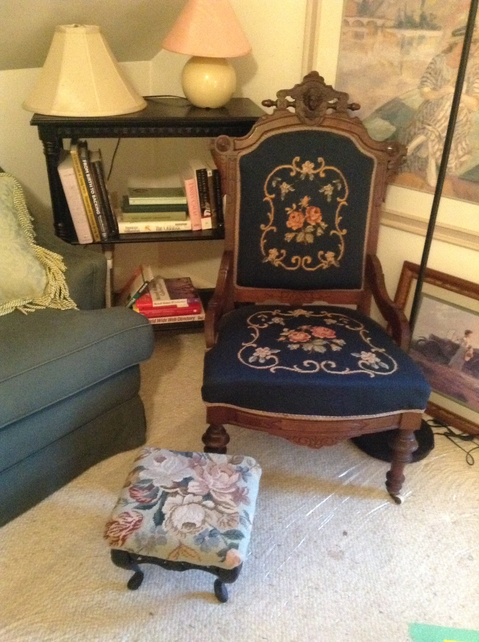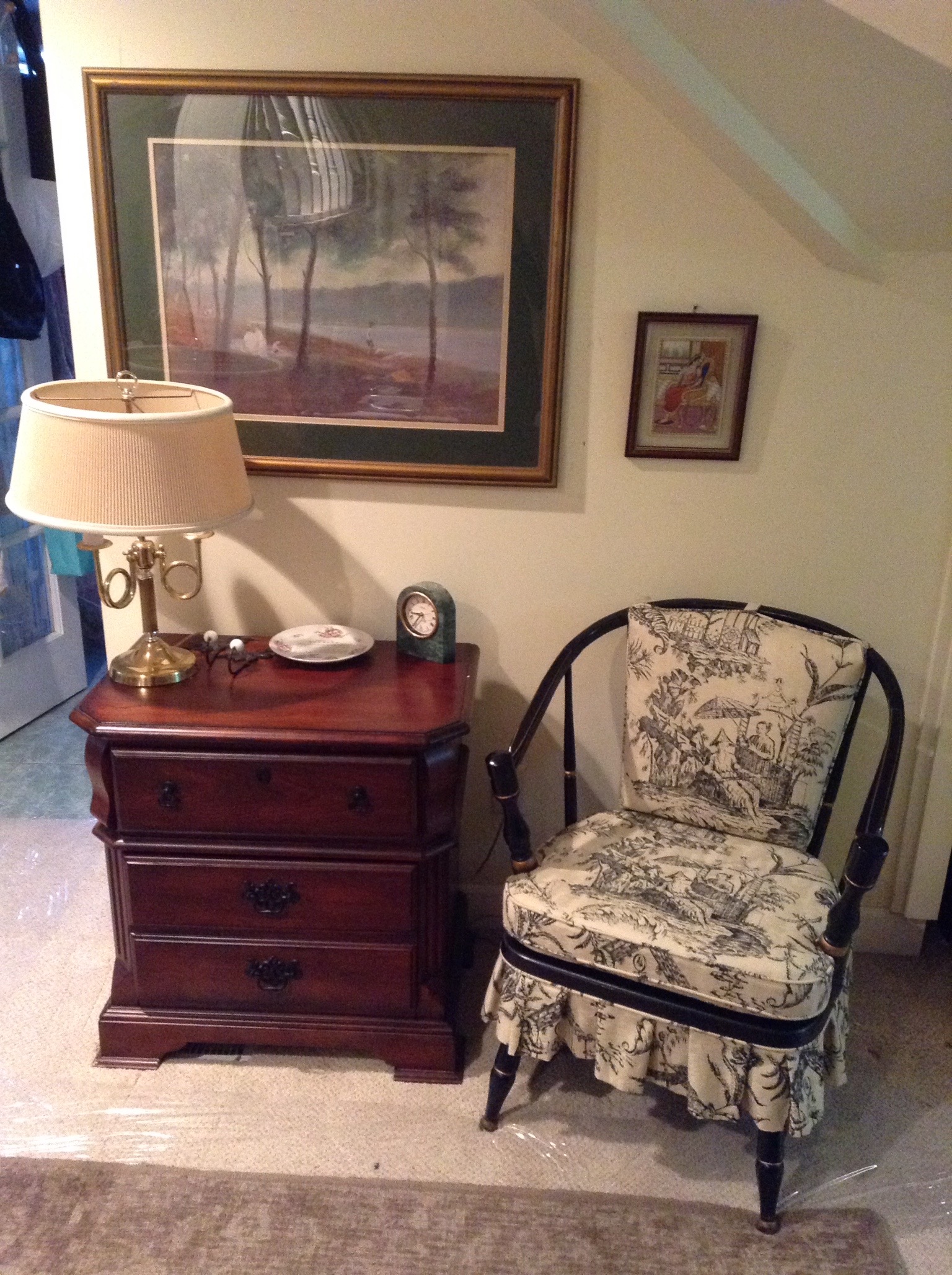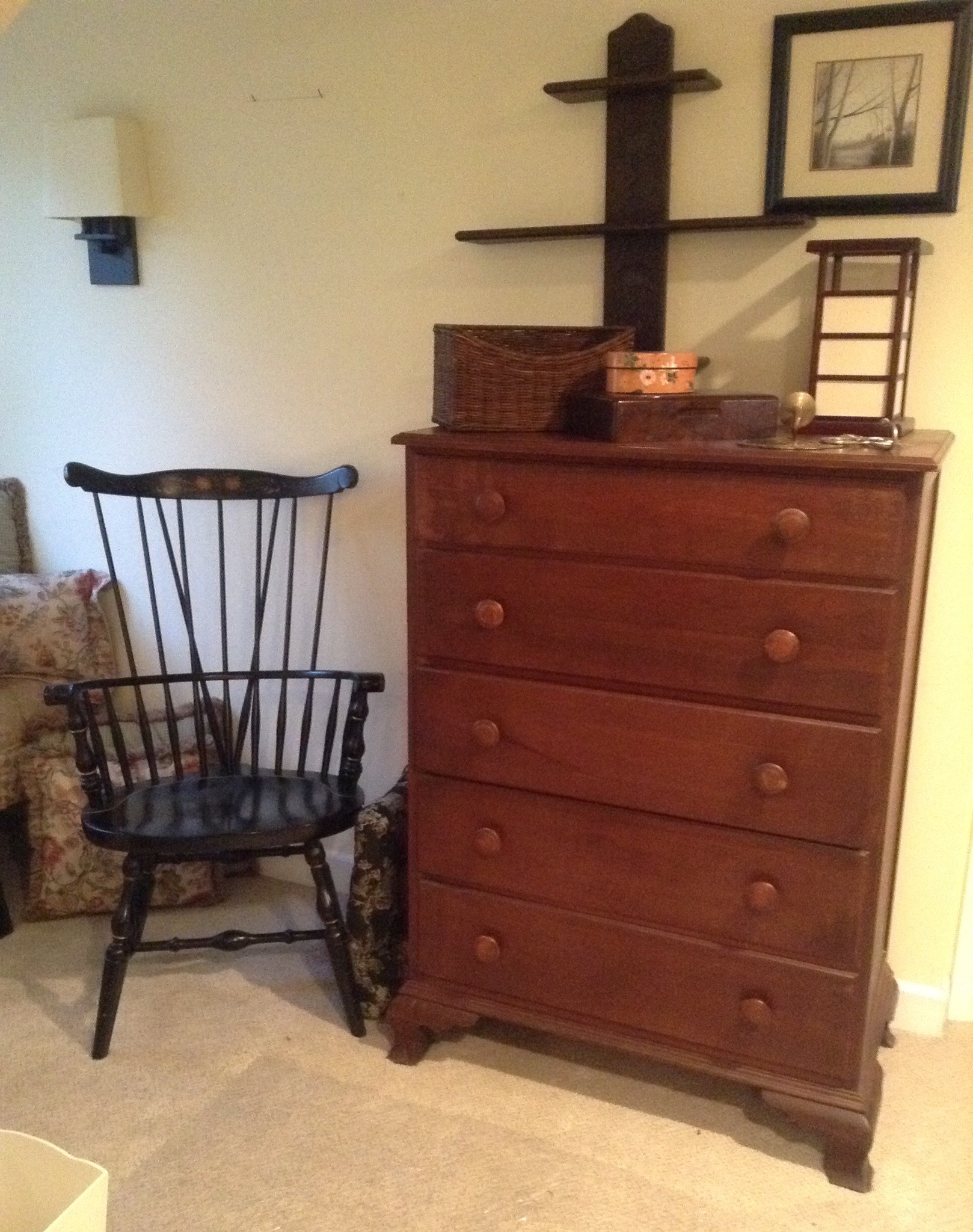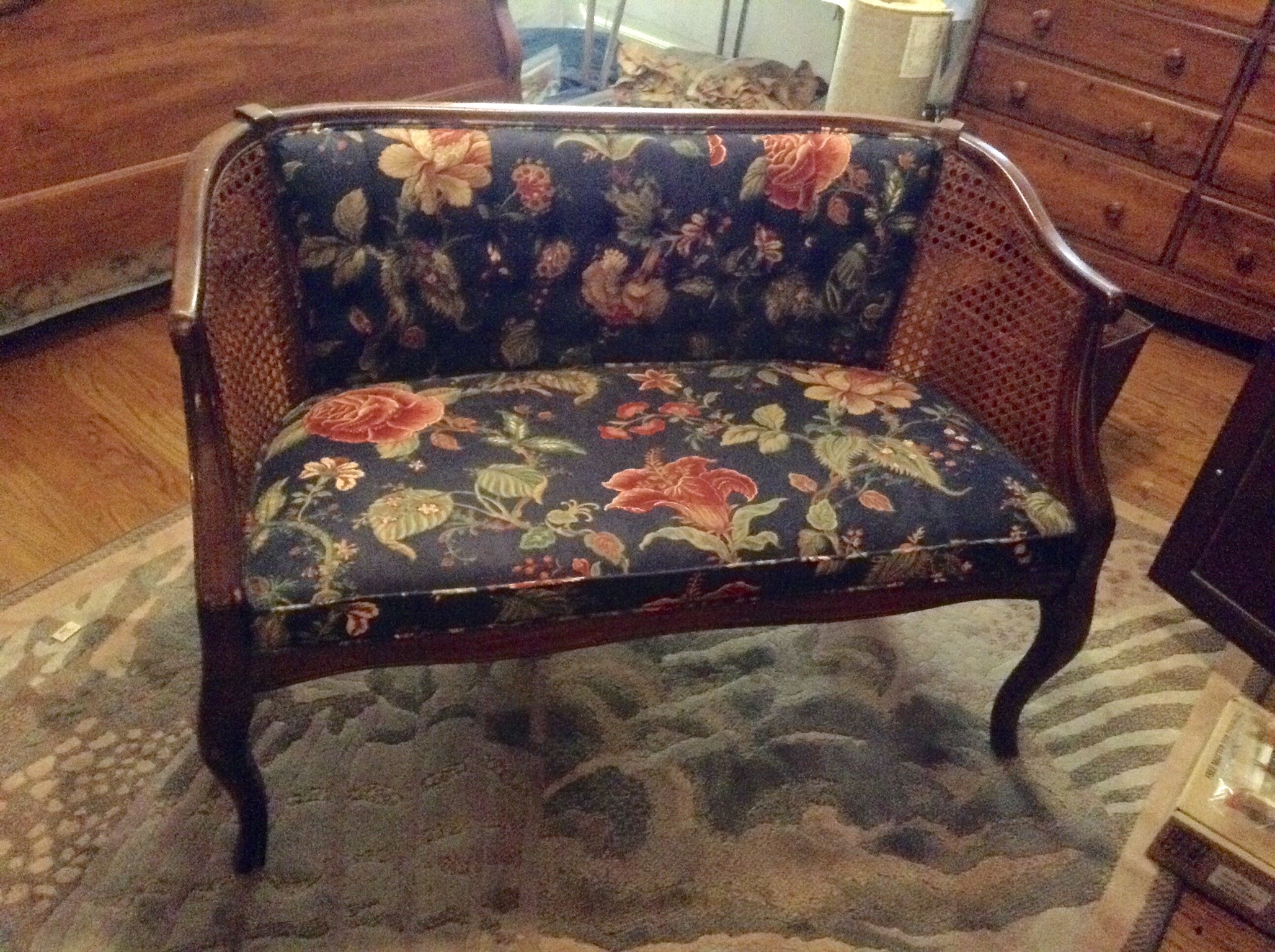A cute blue-grey button-back loveseat, antique needlepoint chair, S. Bent Bros Windsor chair, a sweet upholstered bench, black/white toile skirted chair, tall jewelry chest …