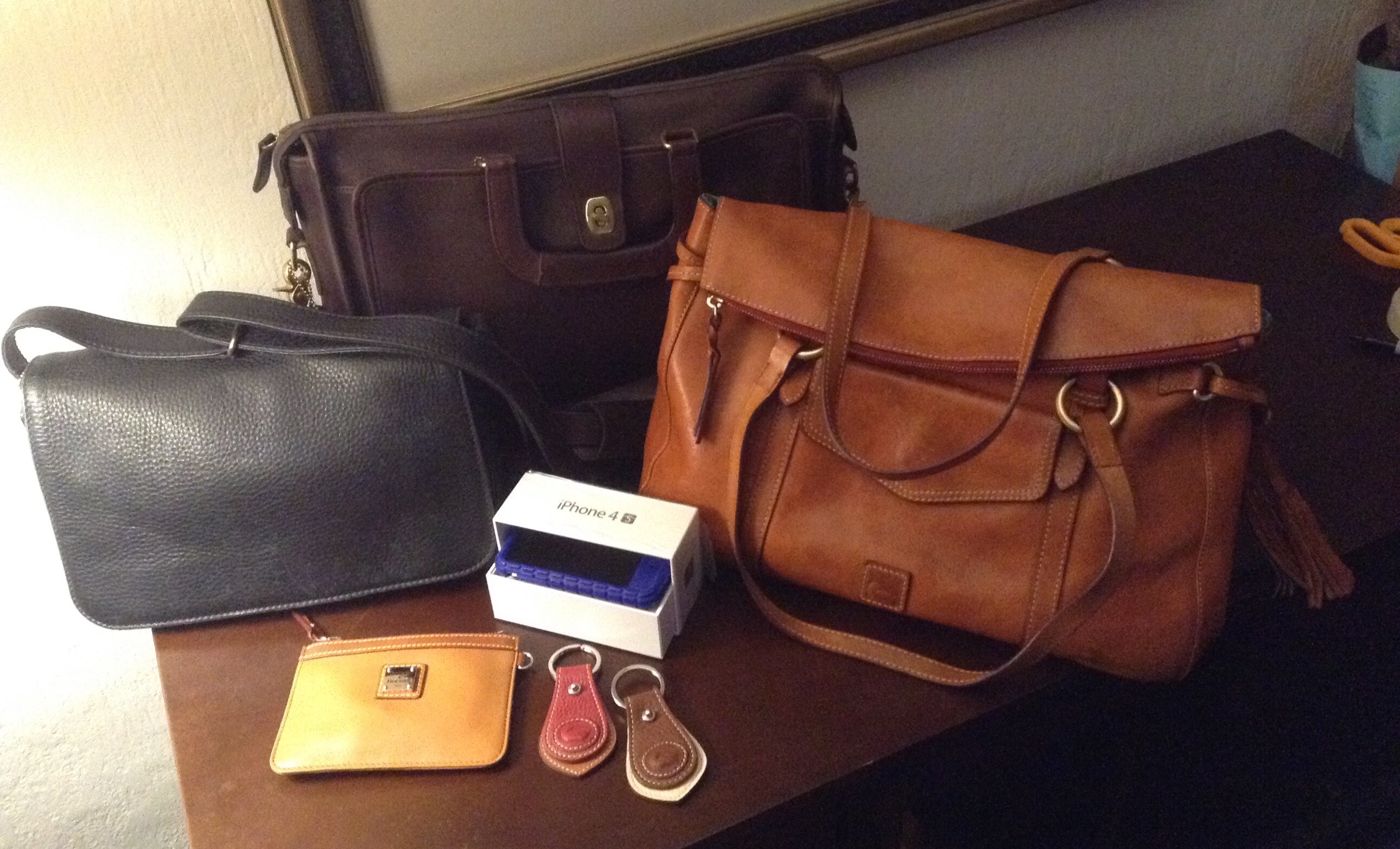Many nice handbags including a tan Dooney & Bourke, Dooney wristlet, TUMI briefcase, and Coach Executive bag …