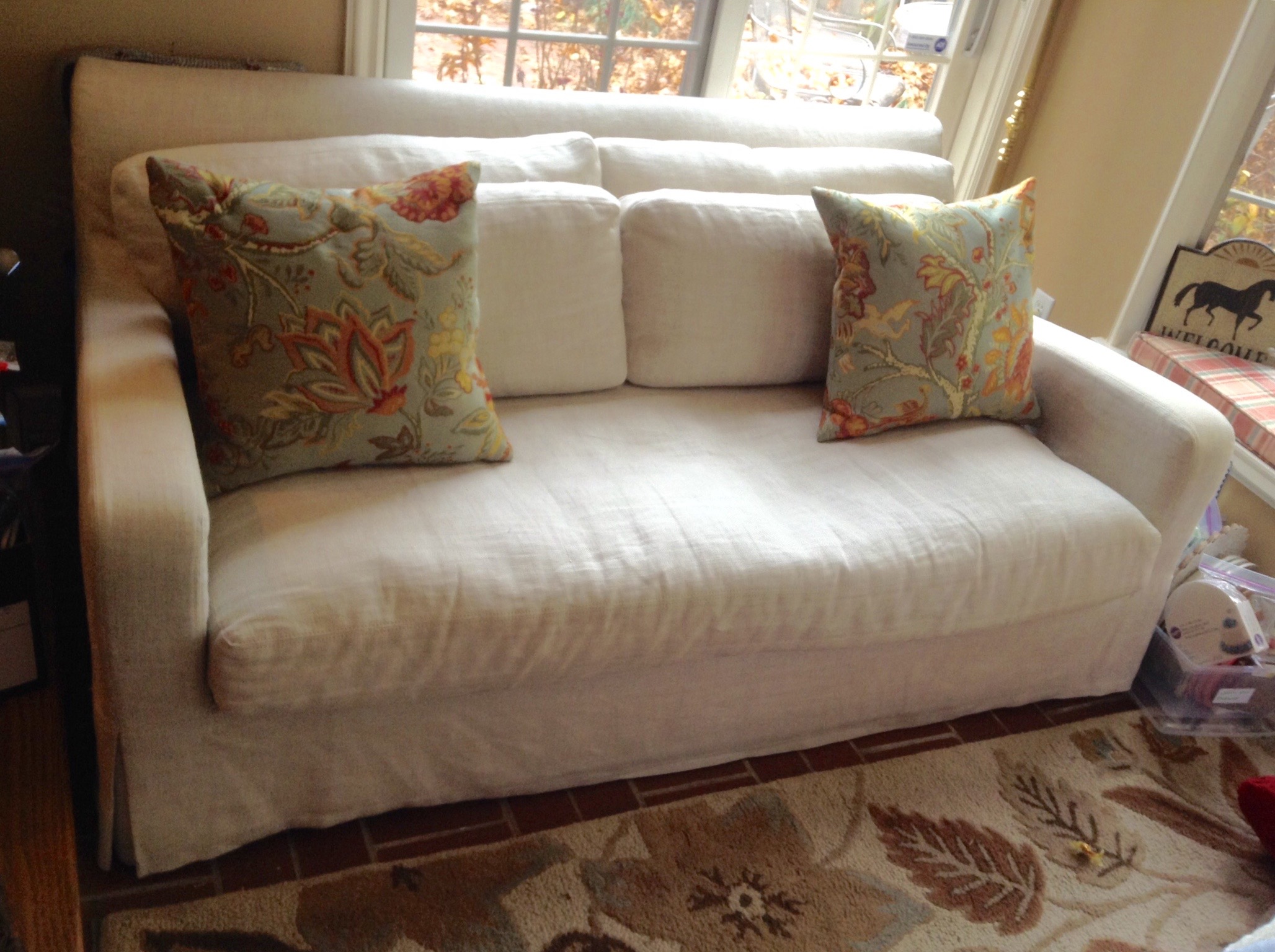 Several nice rugs incl a 9 x 11 hand woven beauty and Pottery Barn, mannnny decorative pillows (many down filled) …
