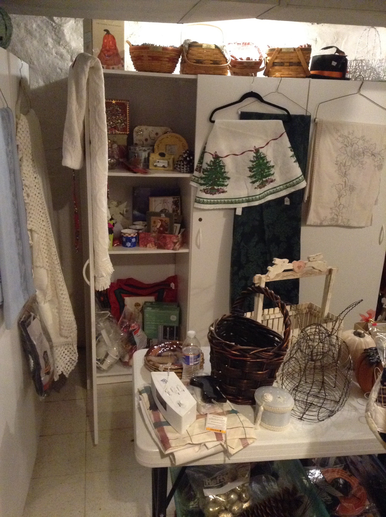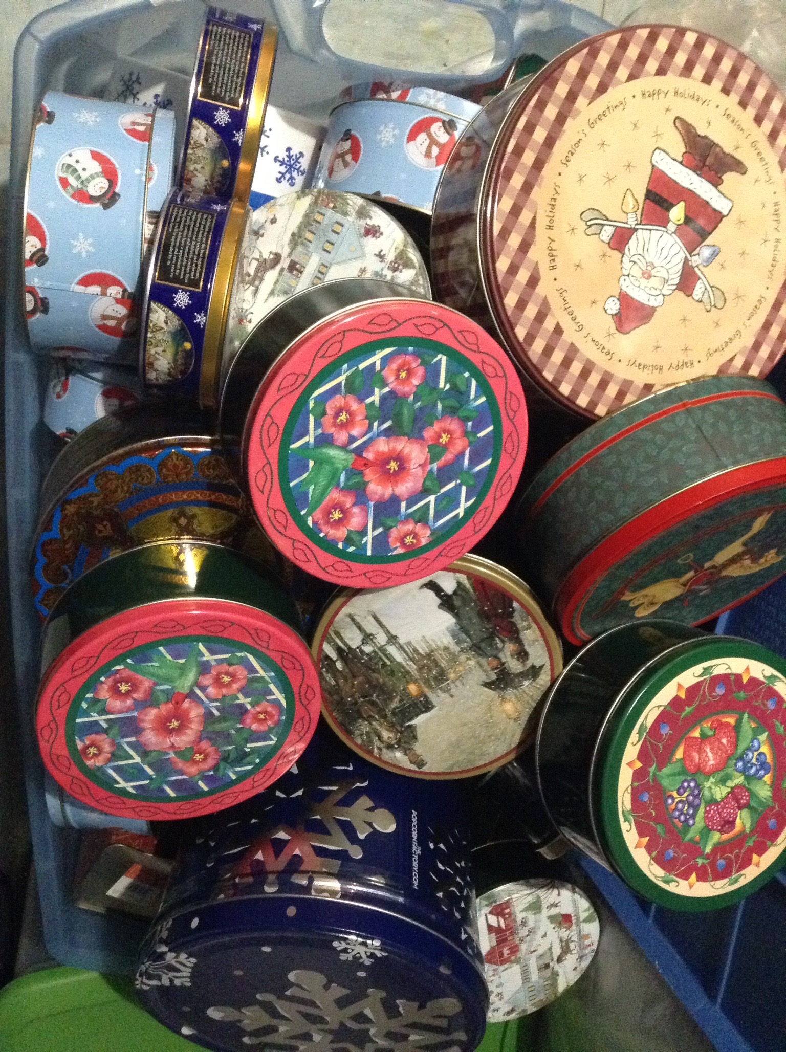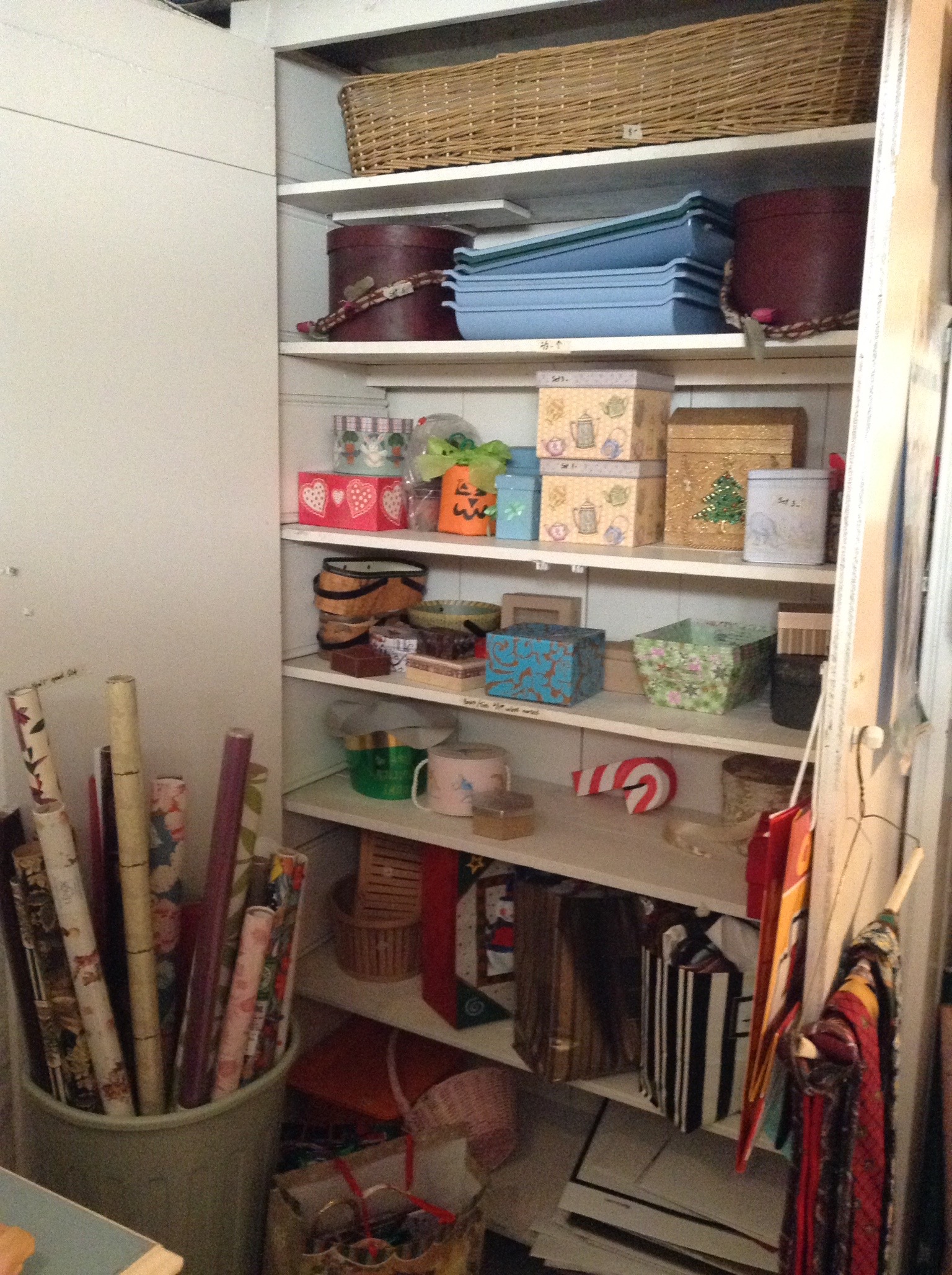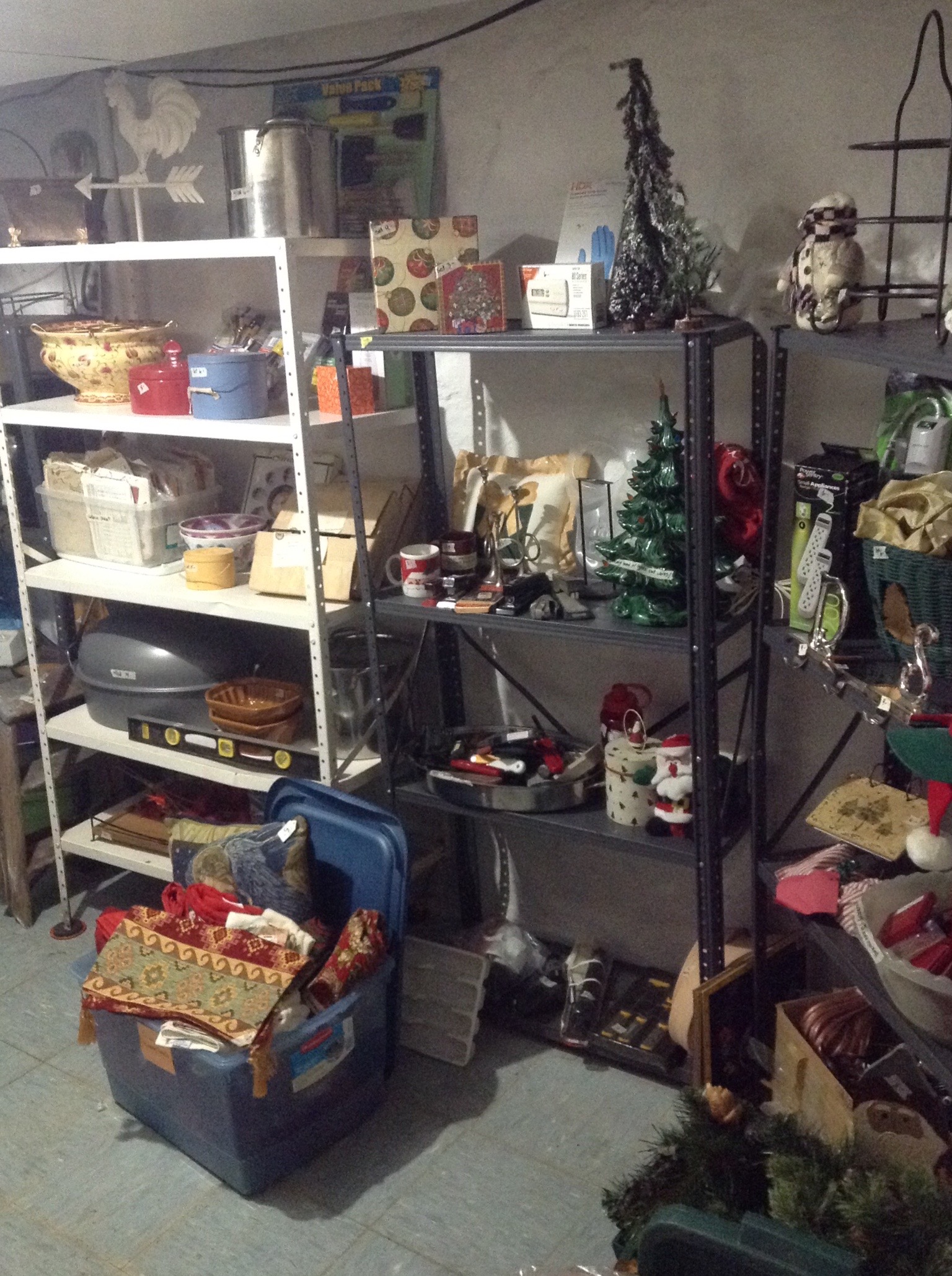 Bags of gift bags and ribbon etc,, ornaments and candles galore, garland and Santas and holiday everything including those tins you bakers like to fill with neighbor goodies …
