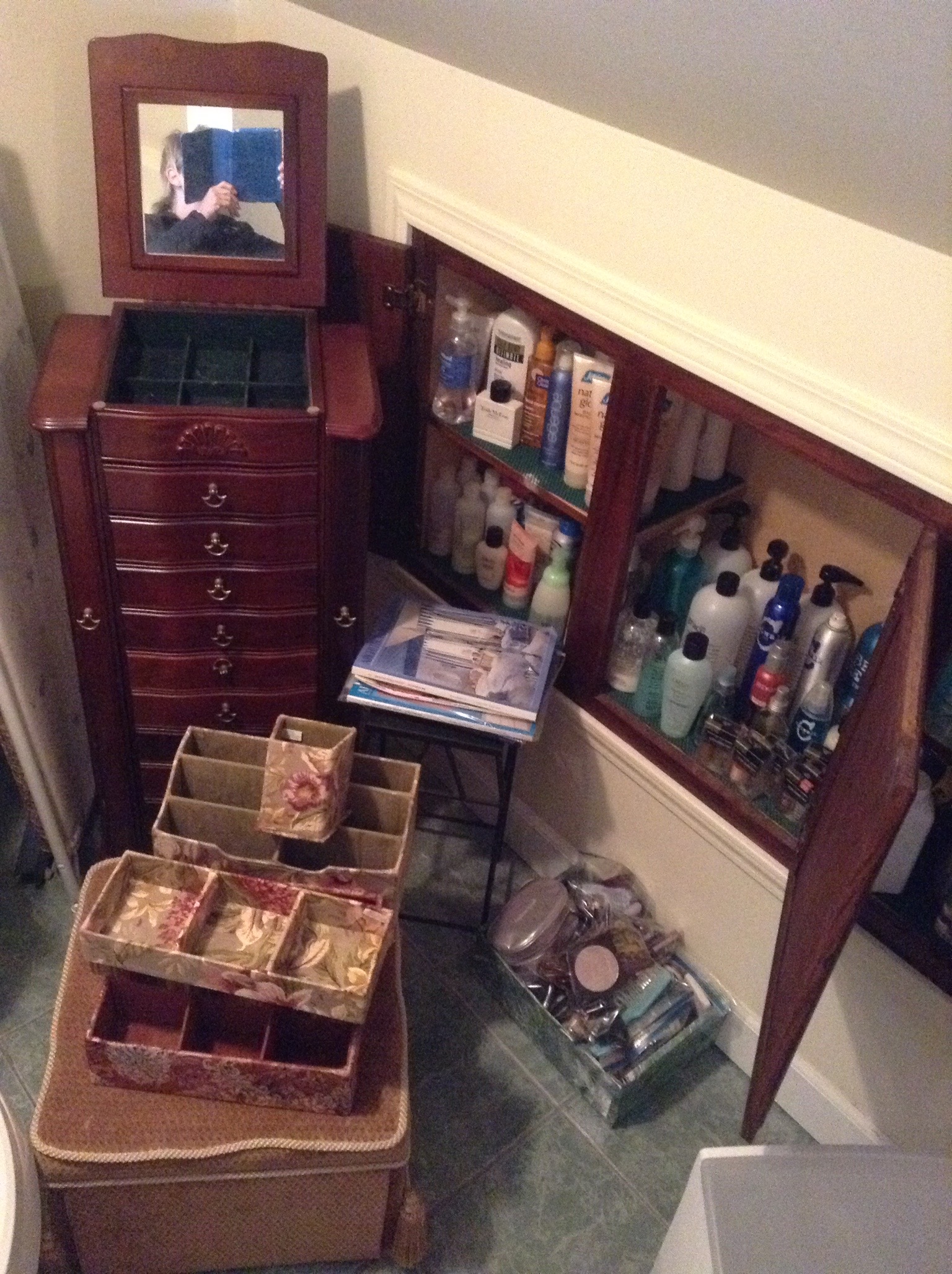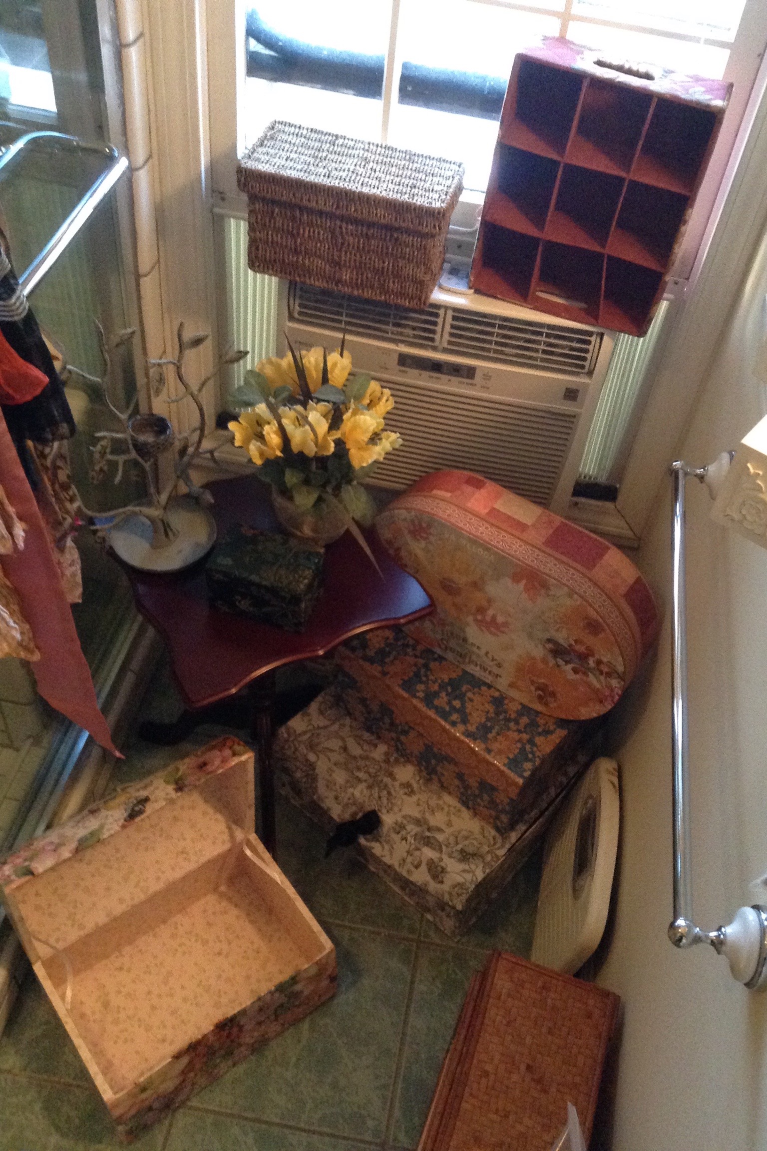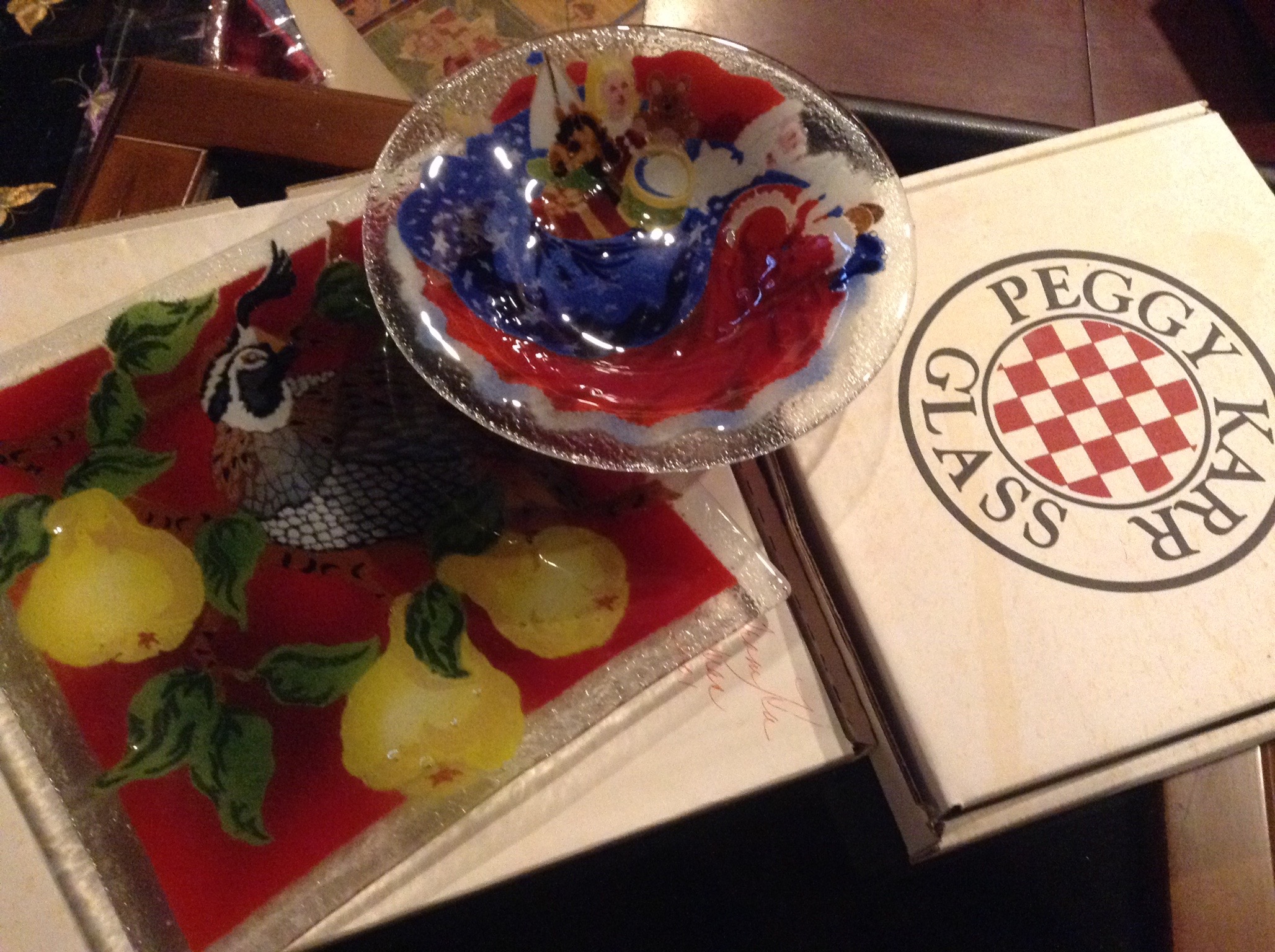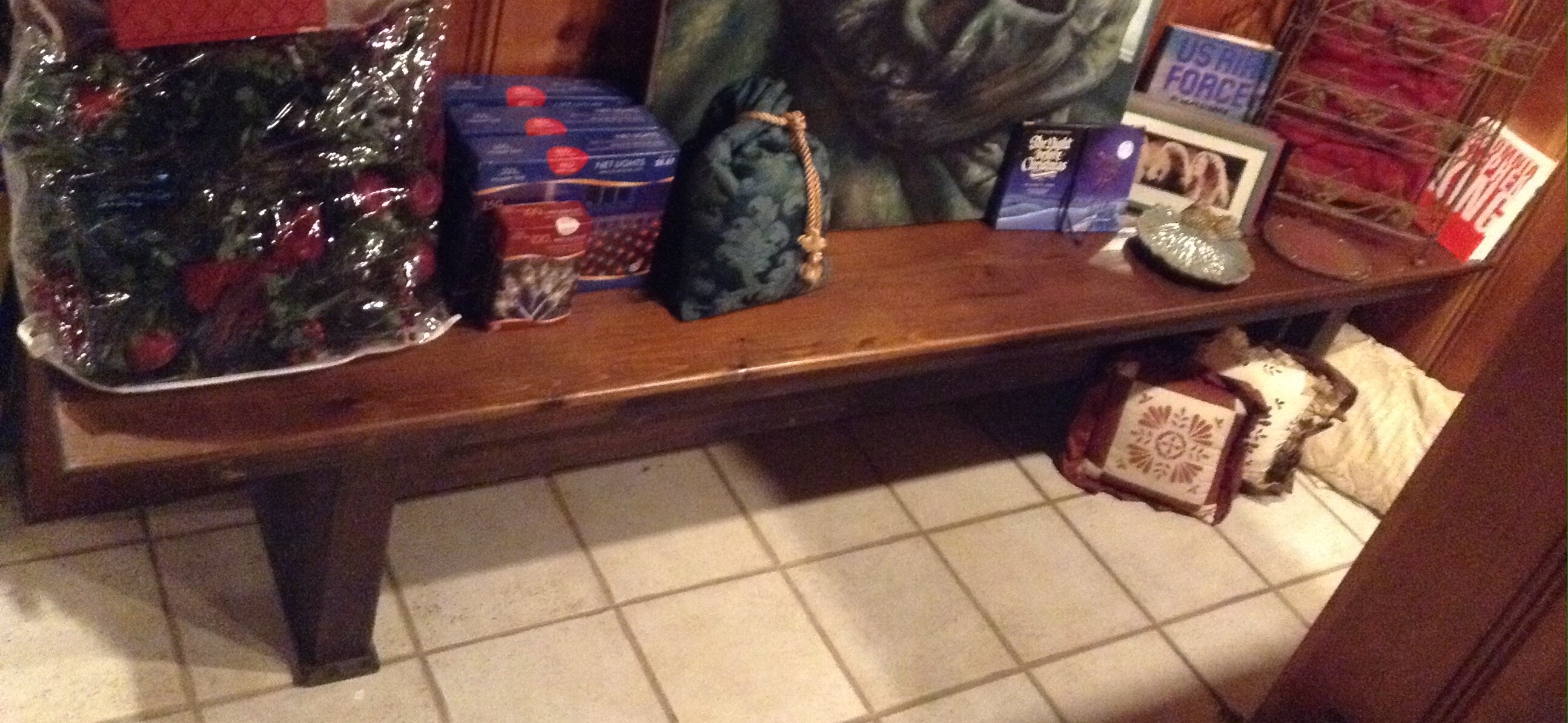 Bags of gift bags and ribbon etc,, ornaments and candles galore, garland and Santas and holiday everything including those tins you bakers like to fill with neighbor goodies …