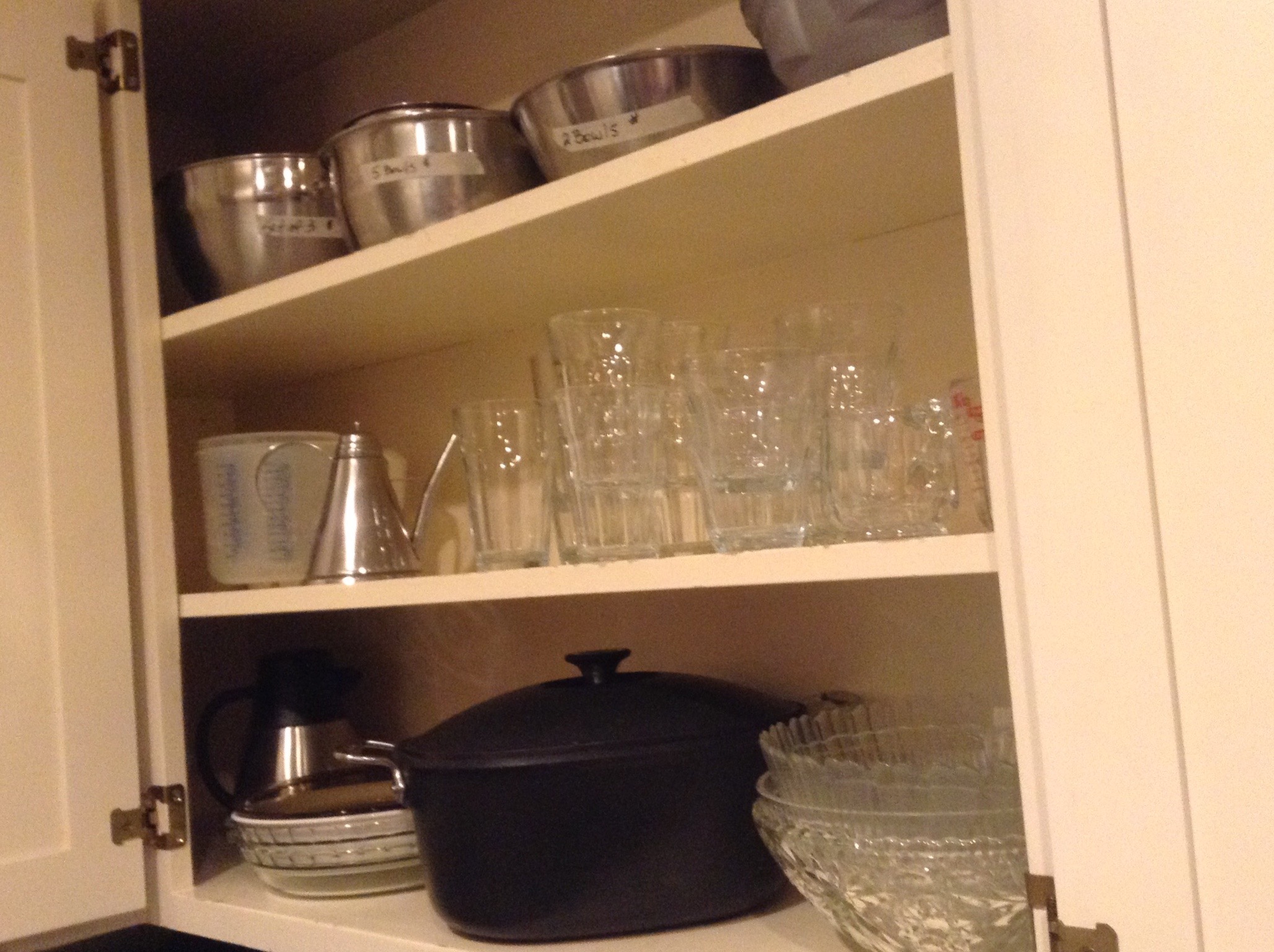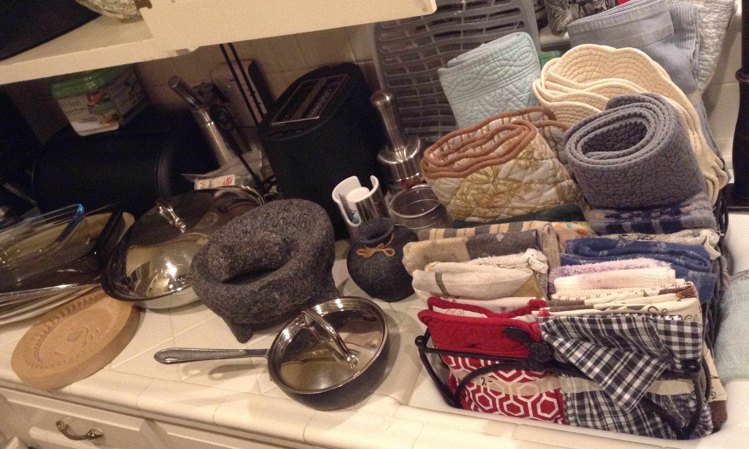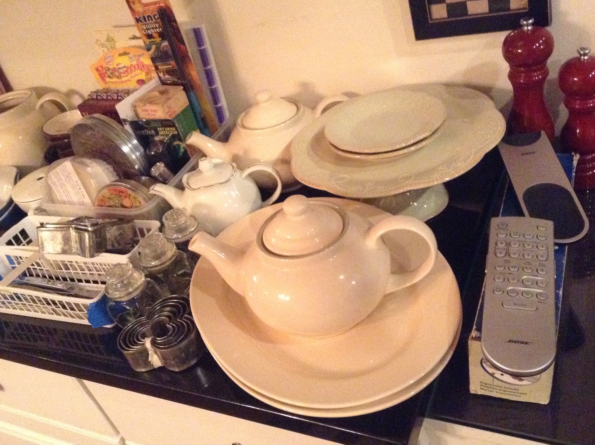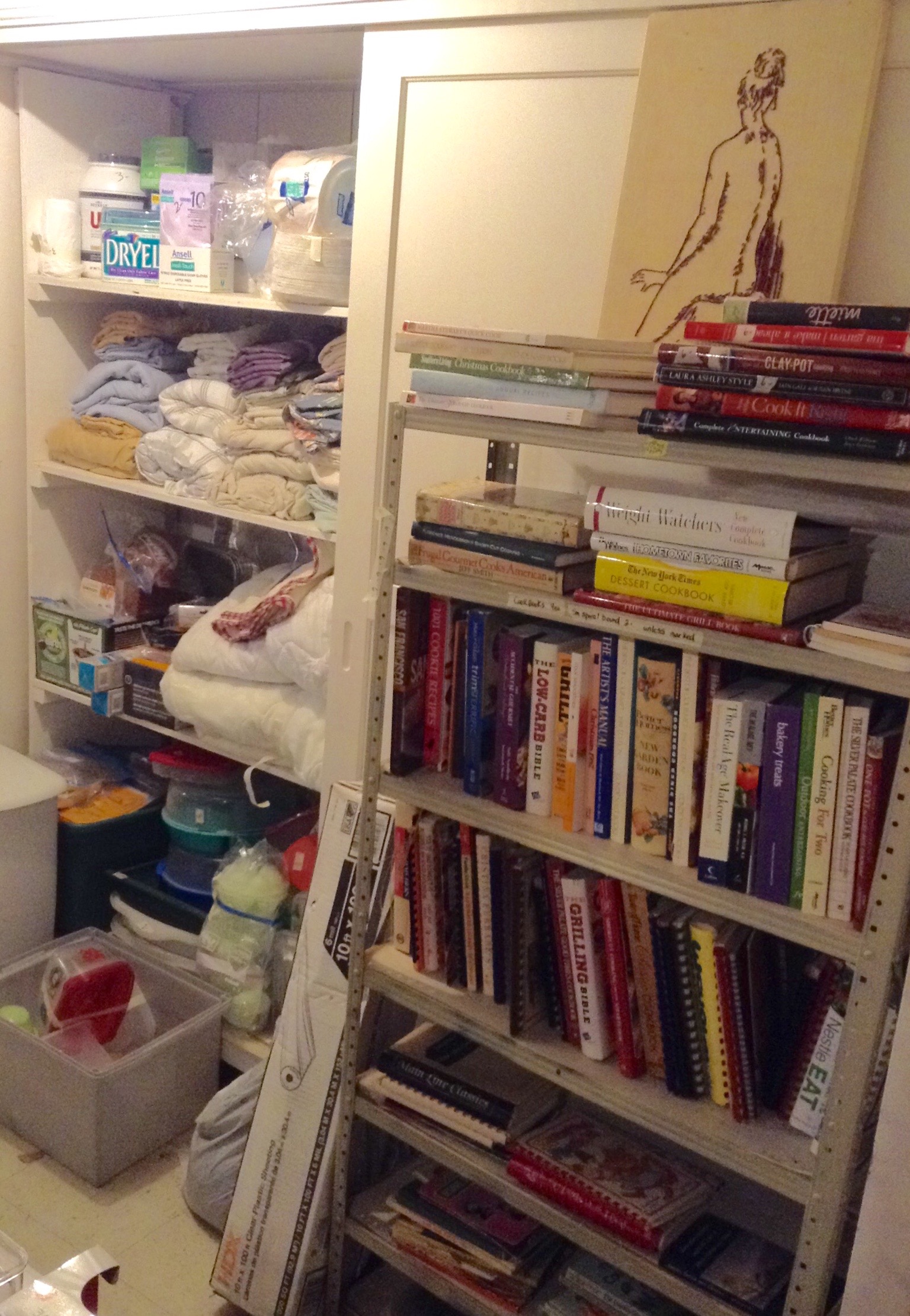 Many La Crueset pans and casserole, BOXes of muffin tins and cookie sheets and other kitchen-y things I don’t understand …