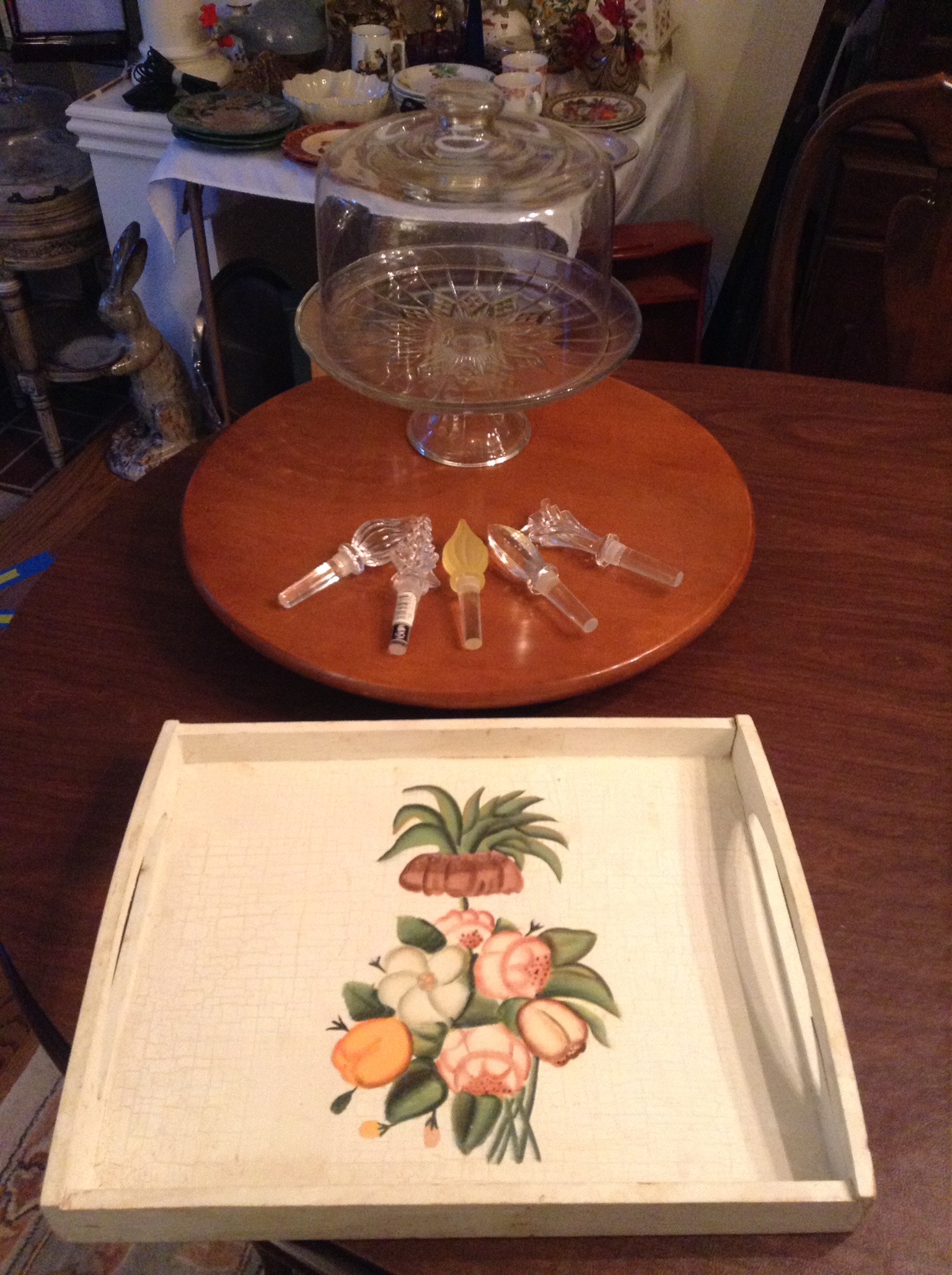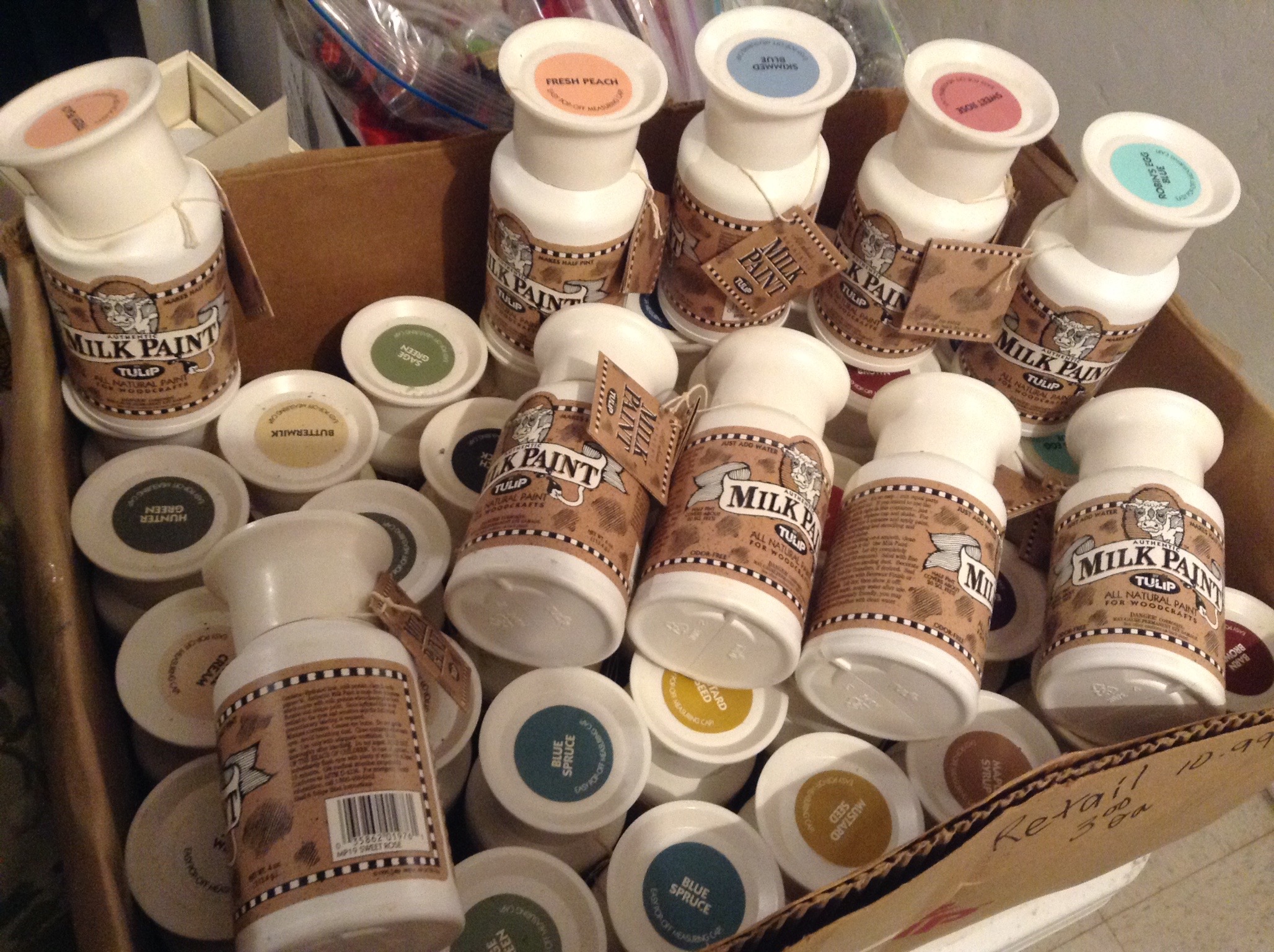 a large box of new Authentic Milk Paint, crystal wine bottle toppers, several wall clocks, 2 guitars …