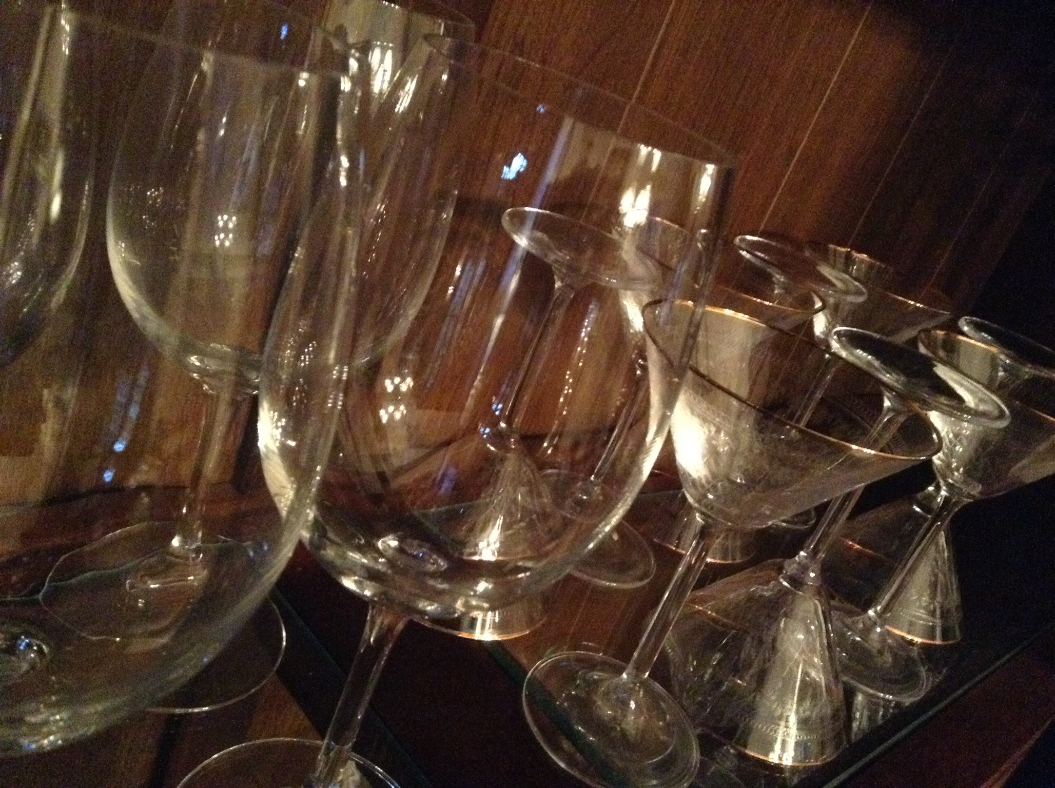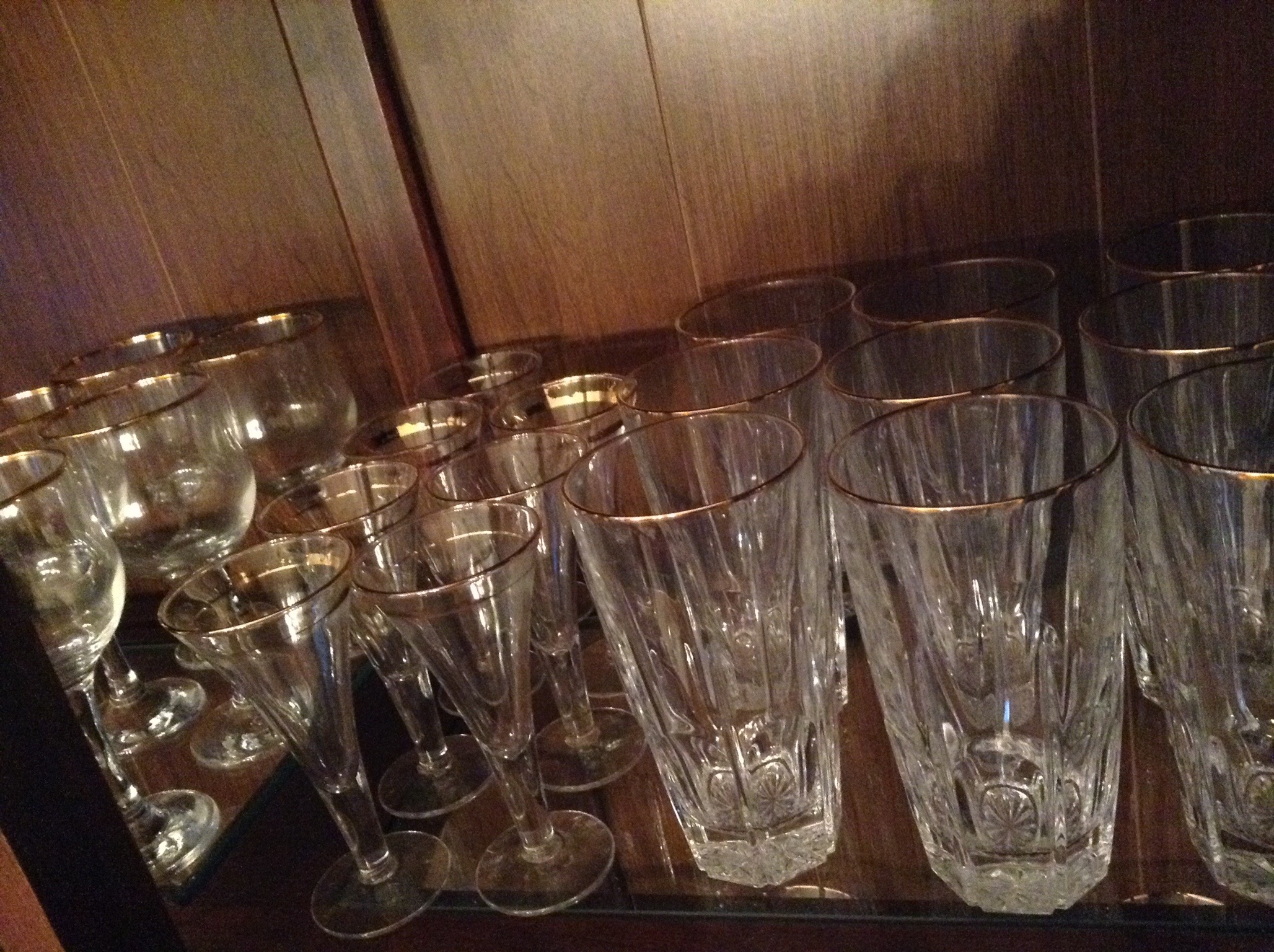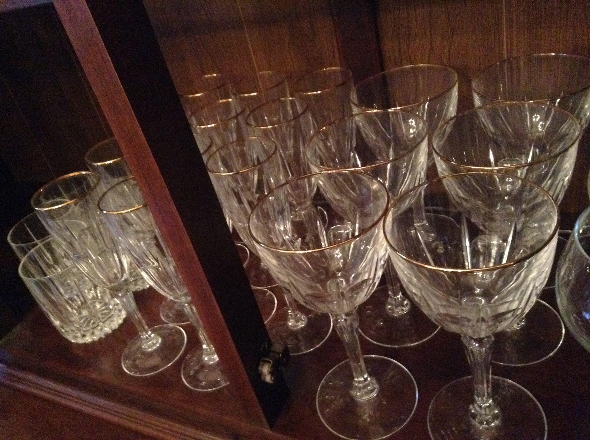 Wine, water, champagne and hi-ball glasses, several flatware sets including a goldtone set …