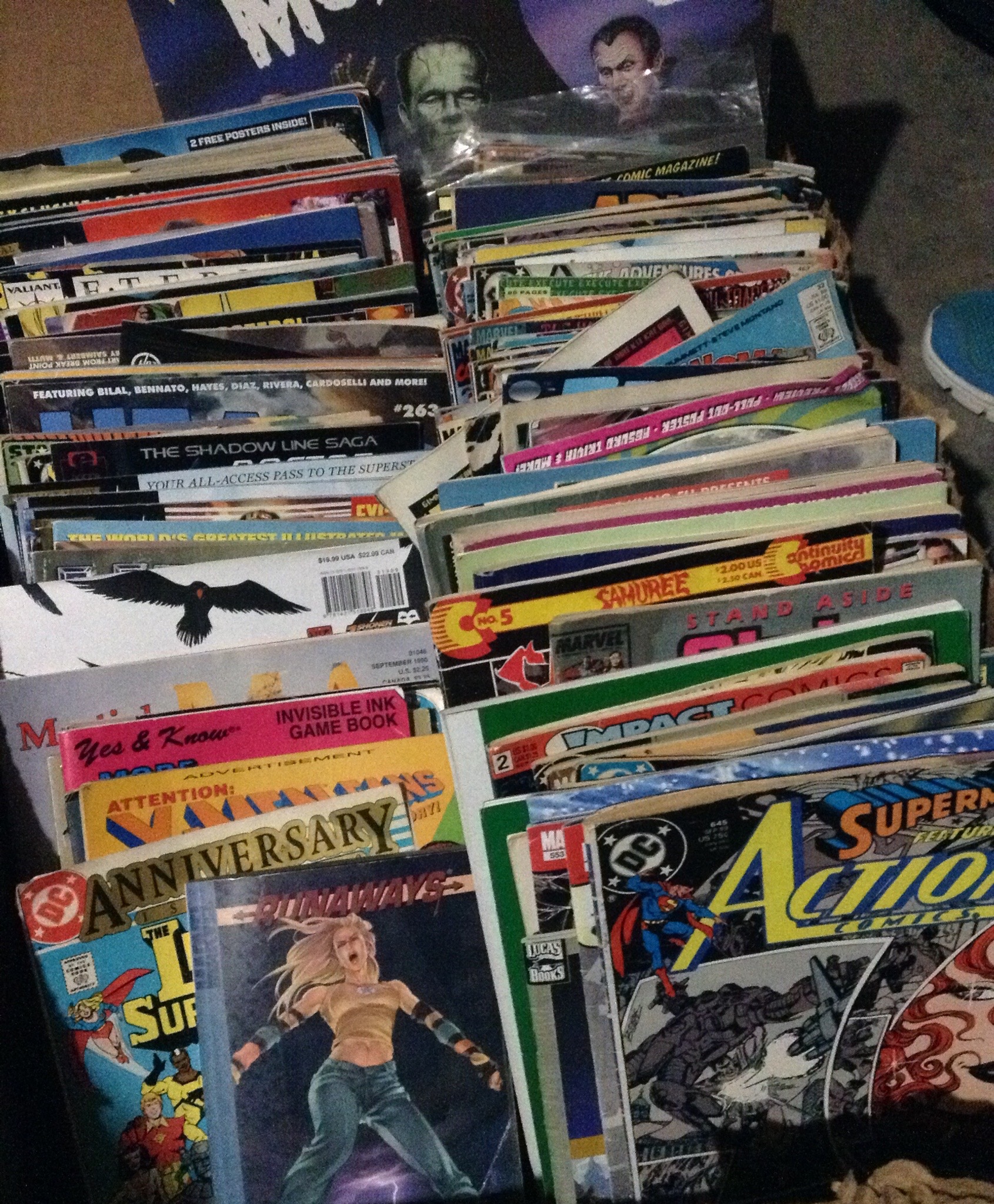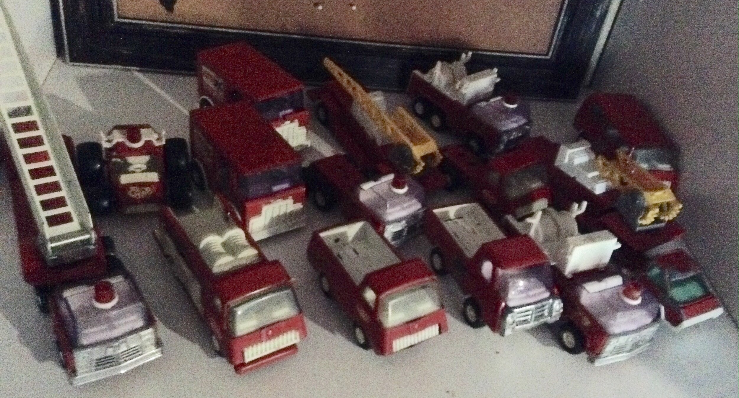 Many vintage Tonka and Buddy L small trucks, board games, comic books, large stuffed fish and snake, 3 trunks, vintage children clothing