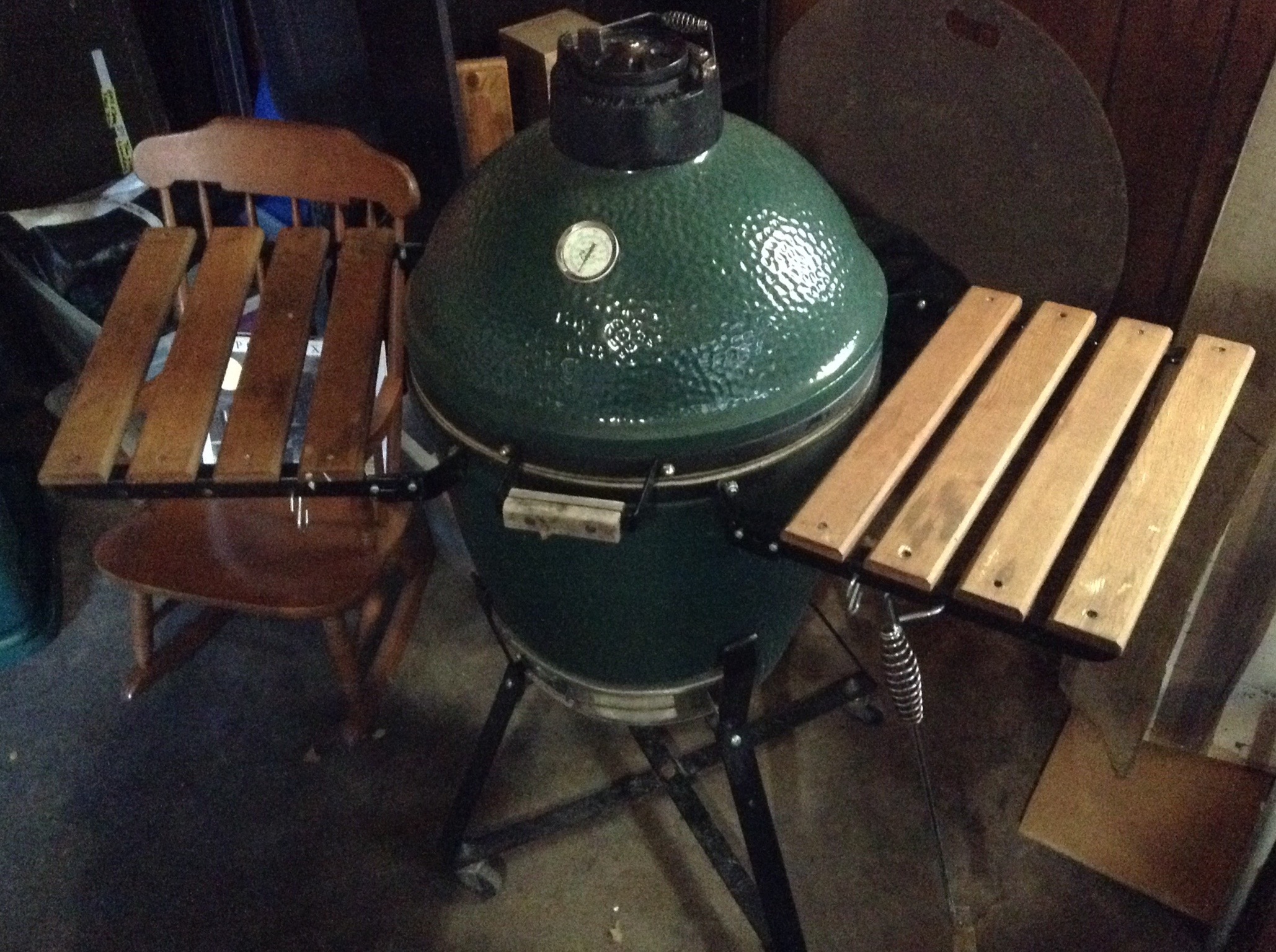 Big Green Egg smoker with cover, Weber grill and cover, outdoor wrought iron table/4 chairs and 2 rockers, concrete bench, pair of Adirondack chairs …