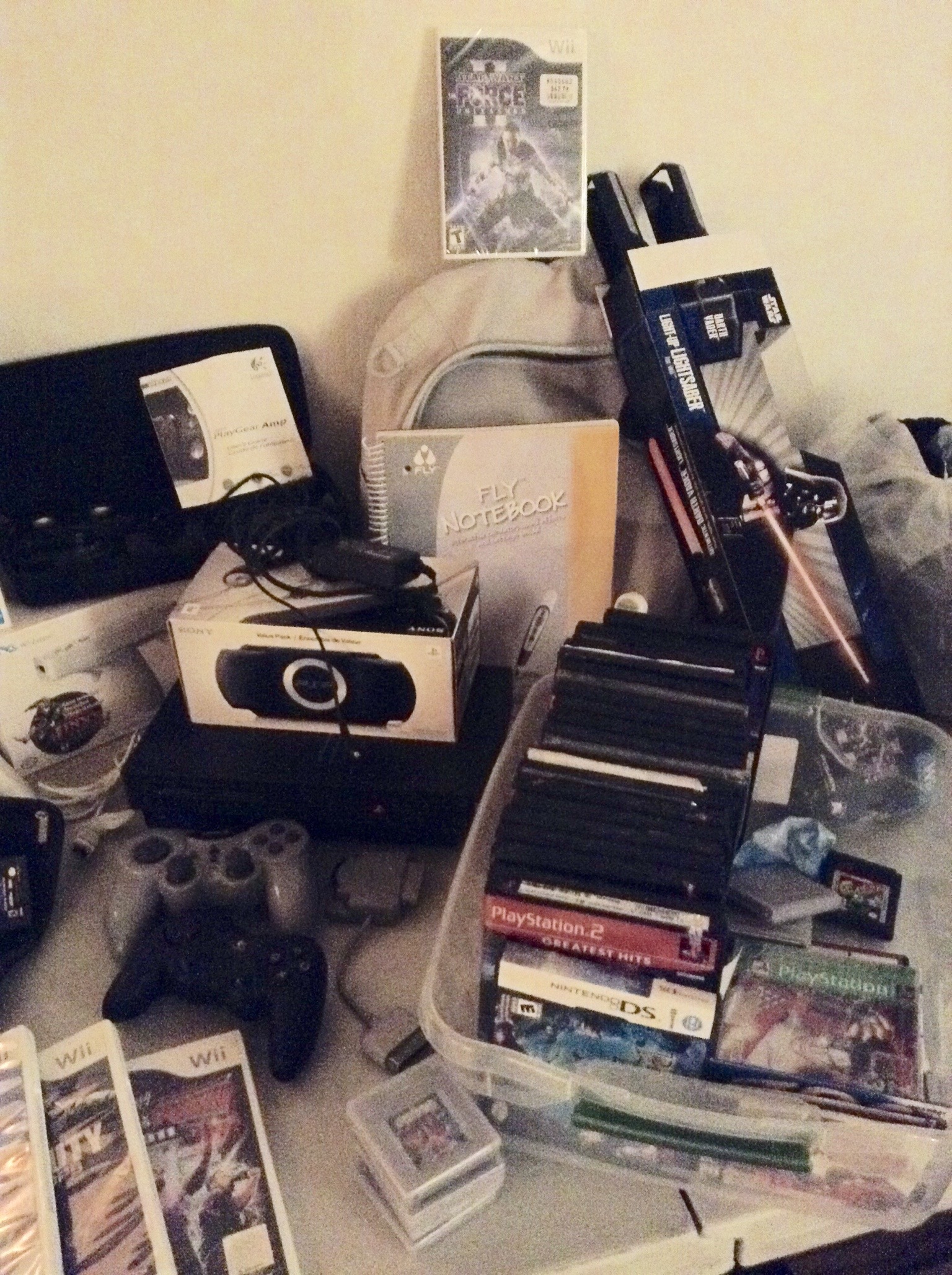 Wii Game Sytem in box, Wii controller and games, Nintendo DS (and games), grey Gameboy (and games), GameBoy Advance, PS2 (no cord – that we can find), Wii Star Wars Force with light saber in box) …
