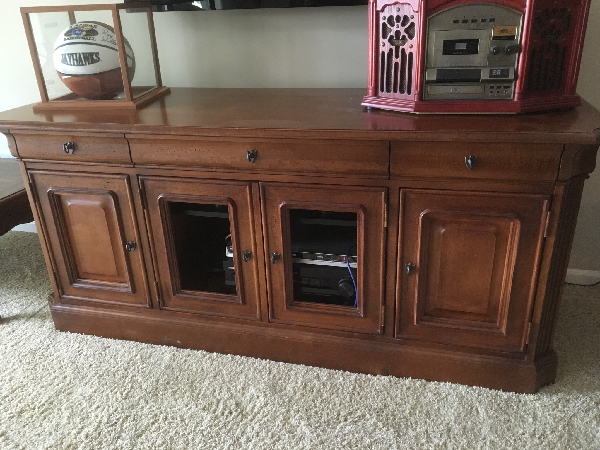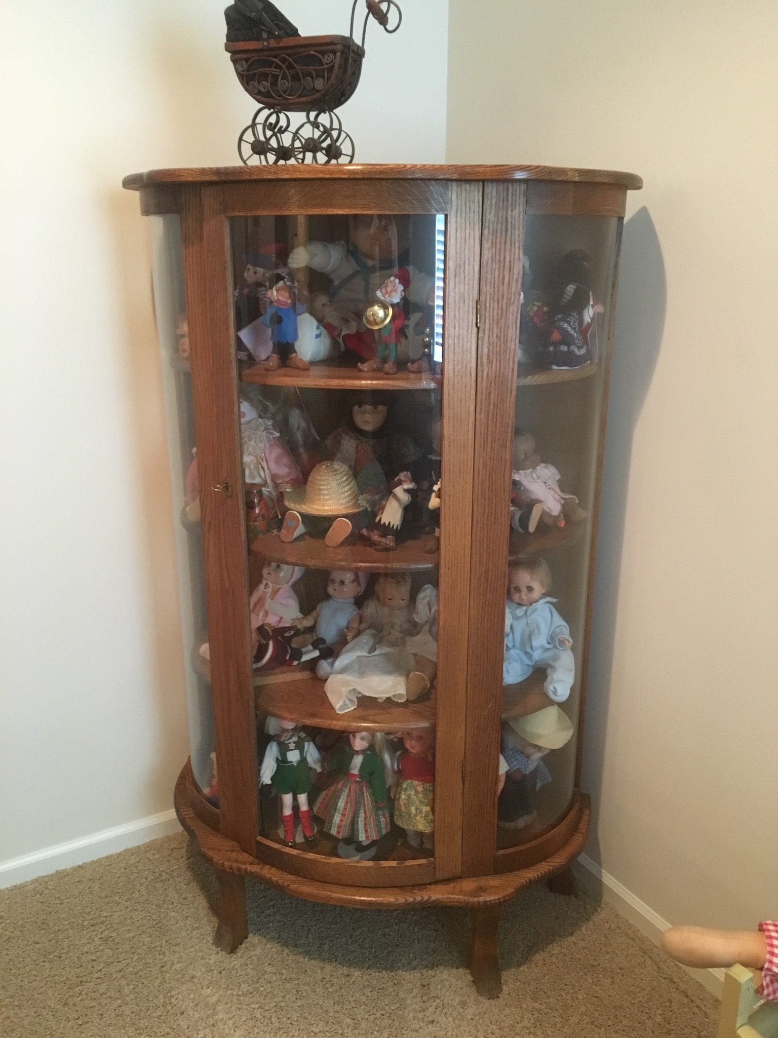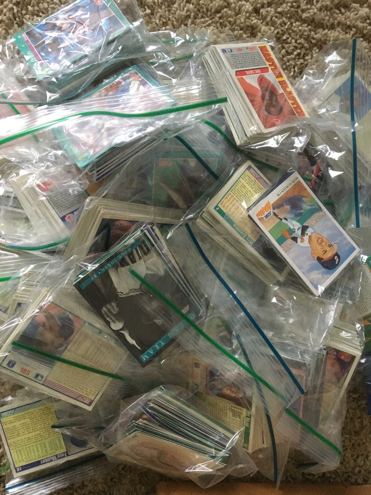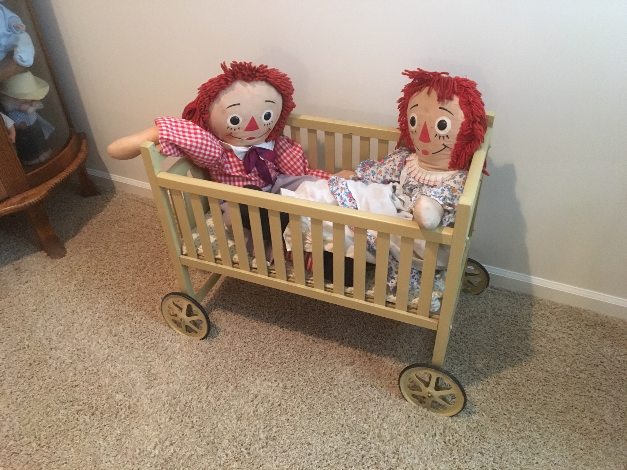 Baggies of baseball cards, Memorex record player/radio/CD player, yellow vintage baby doll crib on wheels …