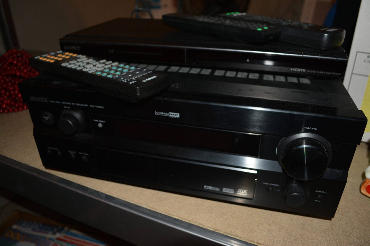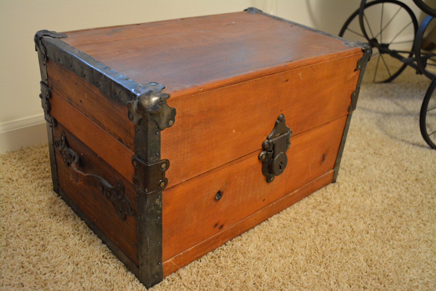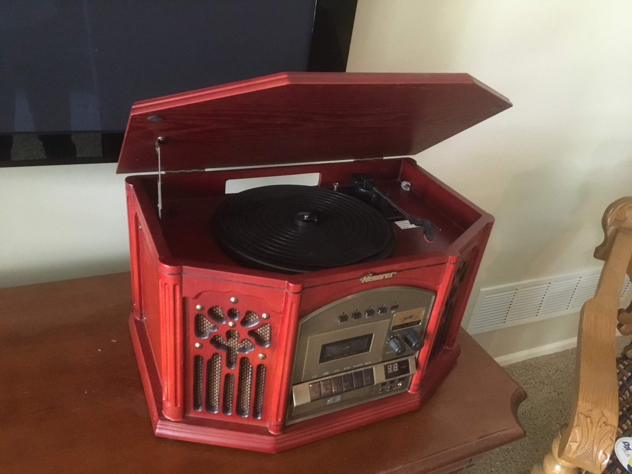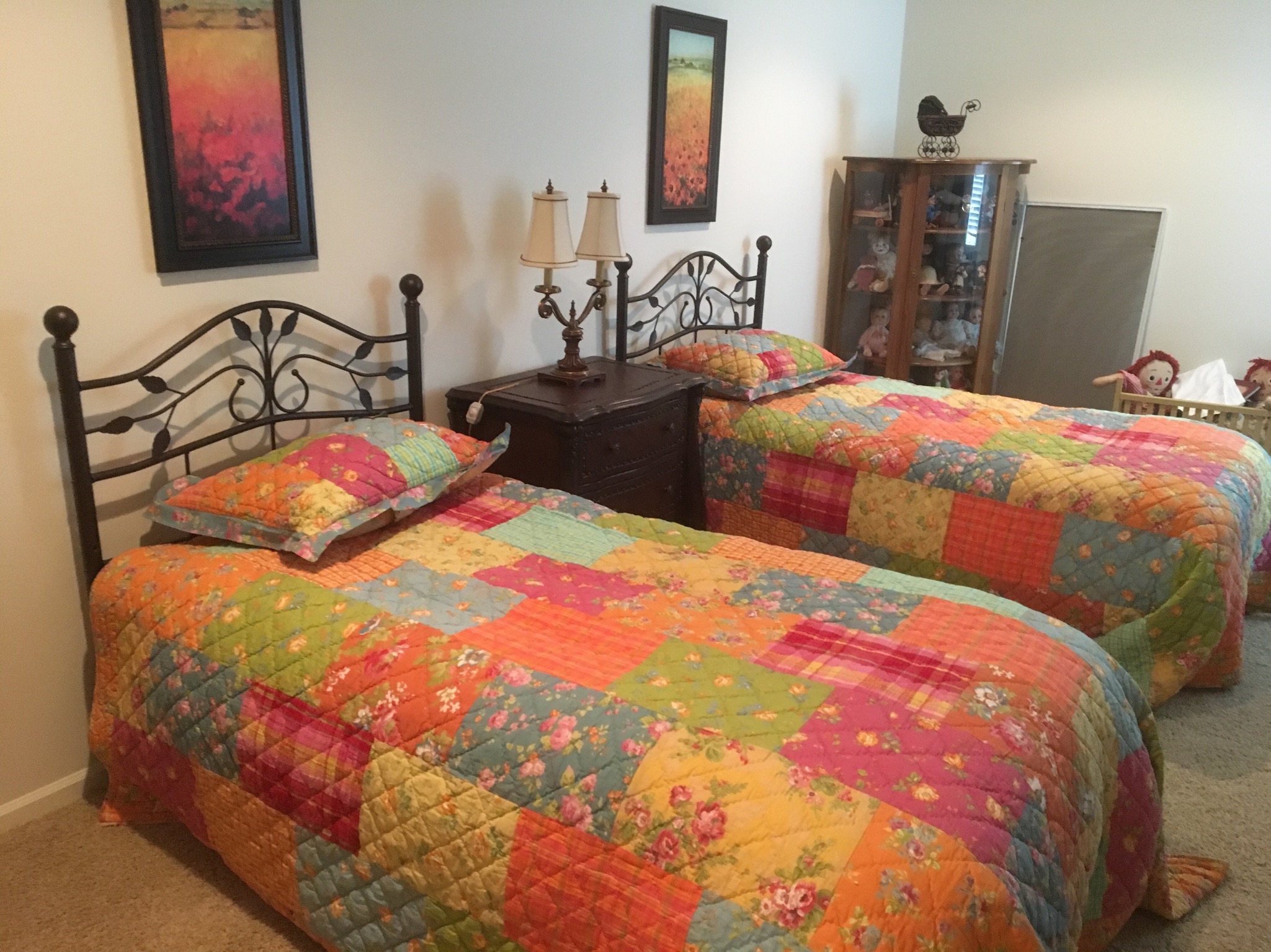 Baggies of baseball cards, Memorex record player/radio/CD player, yellow vintage baby doll crib on wheels …