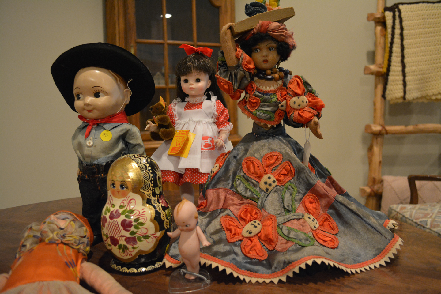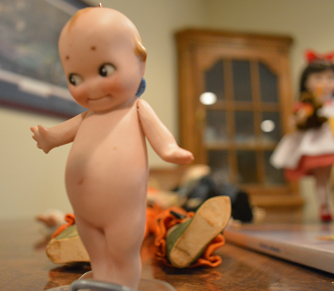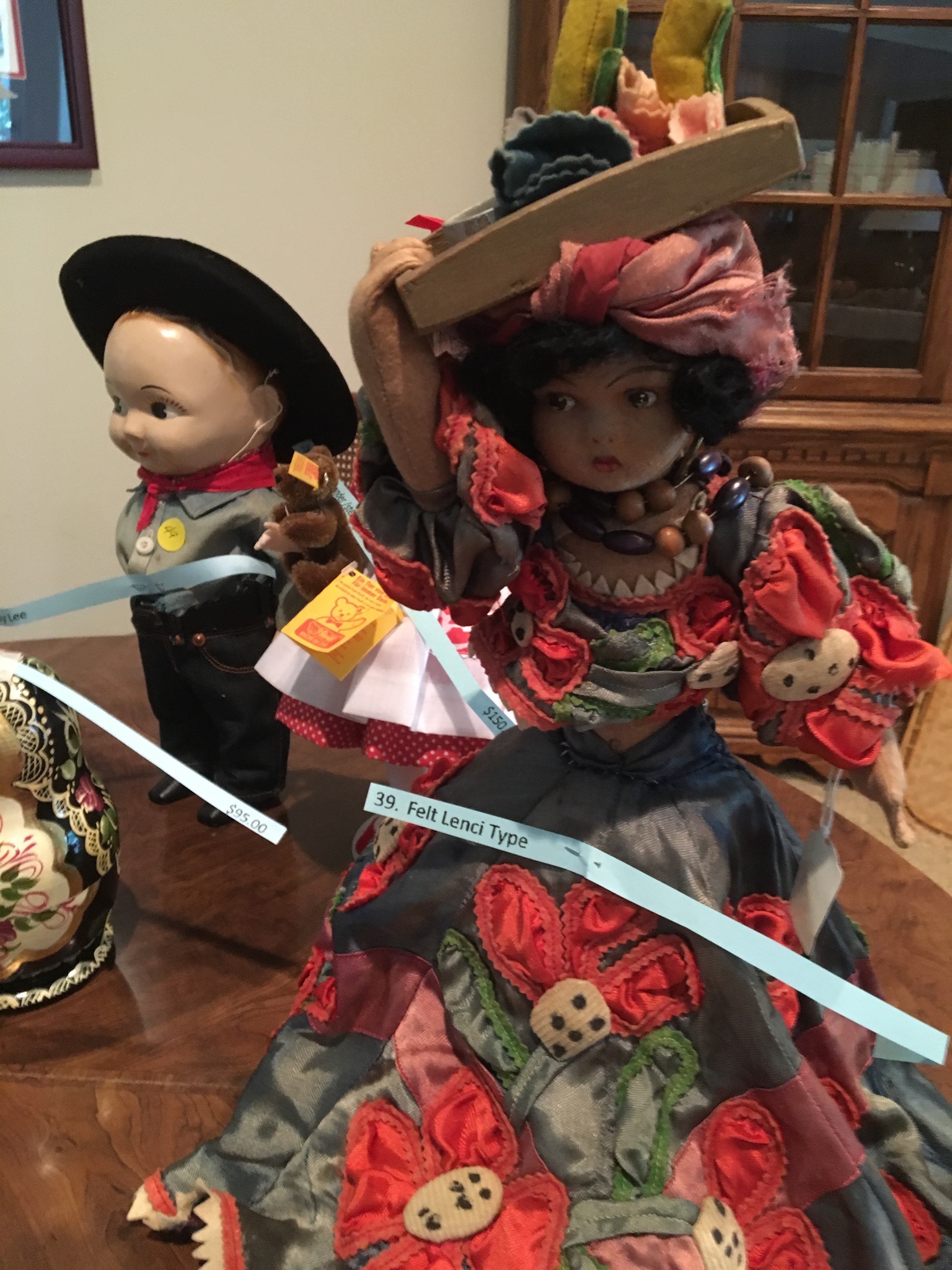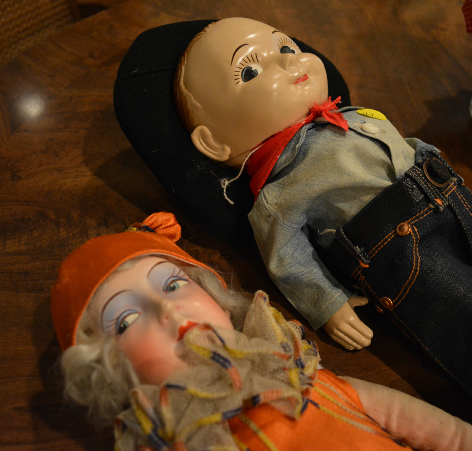 DOLLLLLLS — yowza, what a fun collection! Just a sampling: Madame Alexander, Kewpies, celluloid souvenir dolls, Effanbee, large Compo doll, 1957 Ideal Shirley Temple, wig head Barbie, 1963 Ken, German boy, Madame Alexander Steiff, porcelain Dolly Dingle, Buddy Lee, Zapf, Nancy Anns (wait, that’s me!), Russian Matryoshka, Ideal Tonis, large Raggedy Ann and Andy, Simpich elves, Hummel, Betsy Wetsys (quite the concept), porcelain Betty Boop, Stupsi, Lenci … well over 150 to add to your collection or spark a memory!