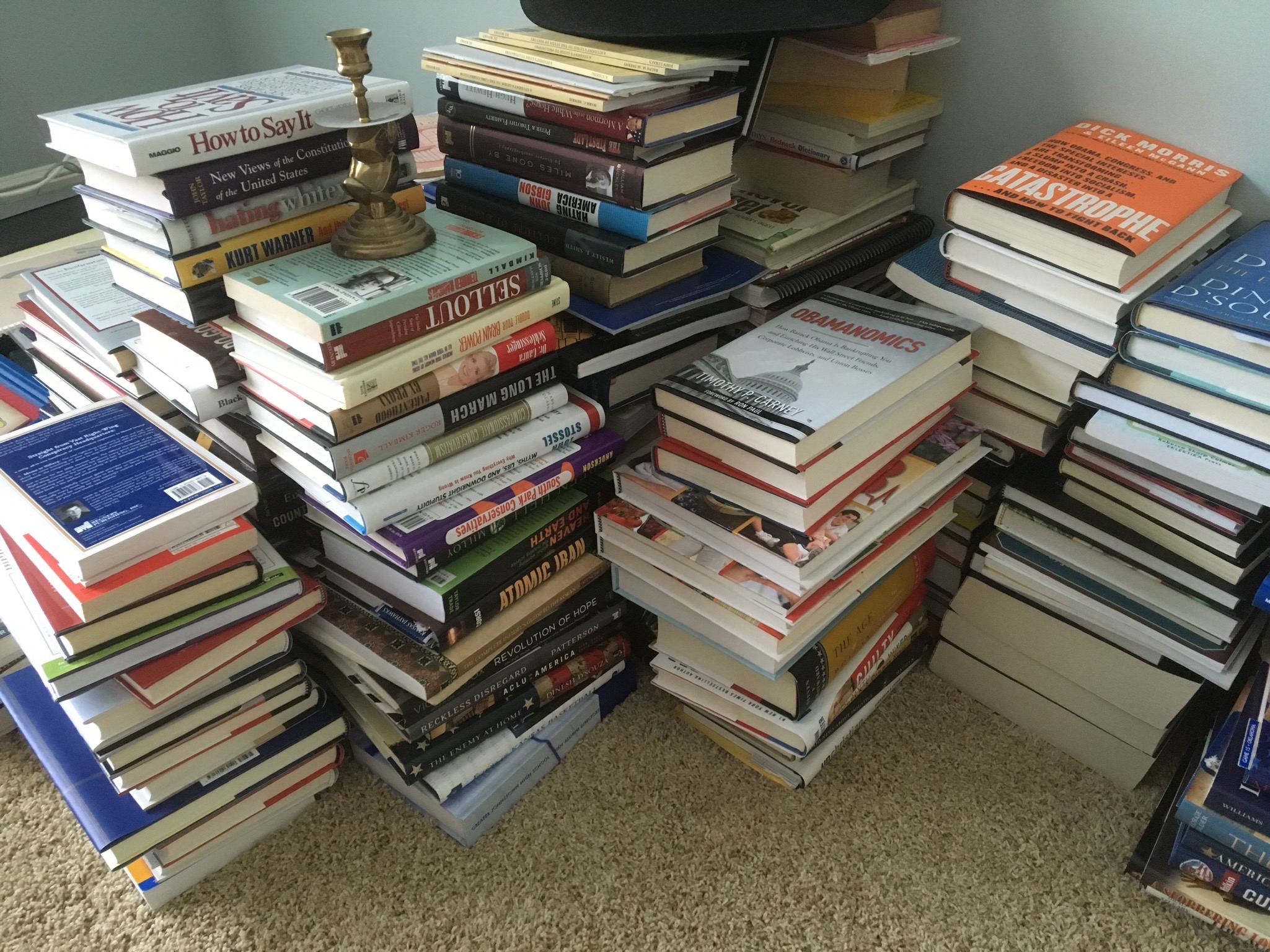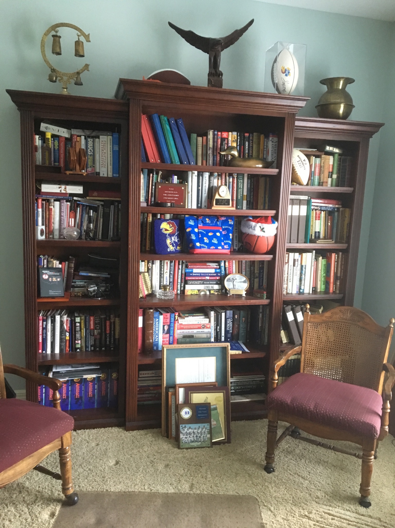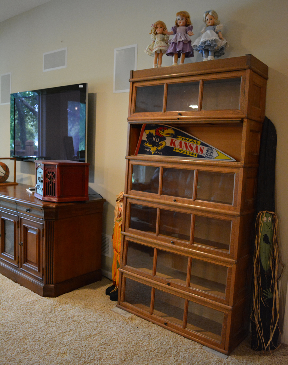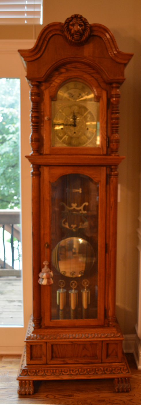 Law library stacking bookcases, and oh-so-many BOOKS (and cookbooks!), oak wood corner cabinet, 3-pc darkwood 7 foot bookcases, Ridgeway Grandfather clock …