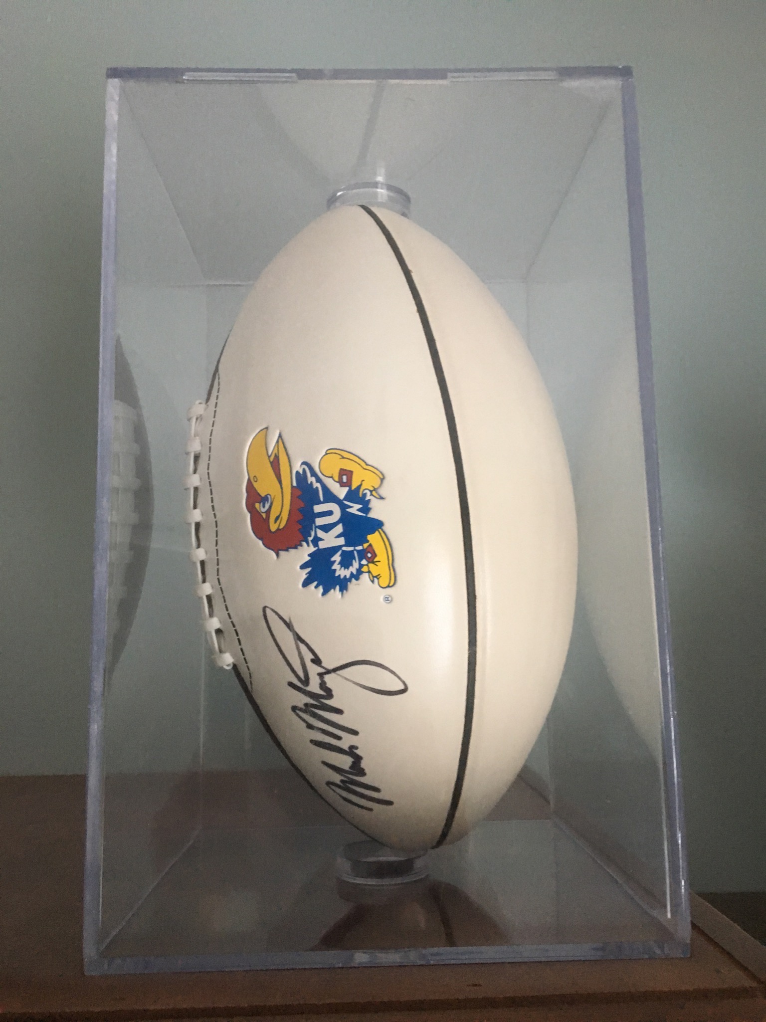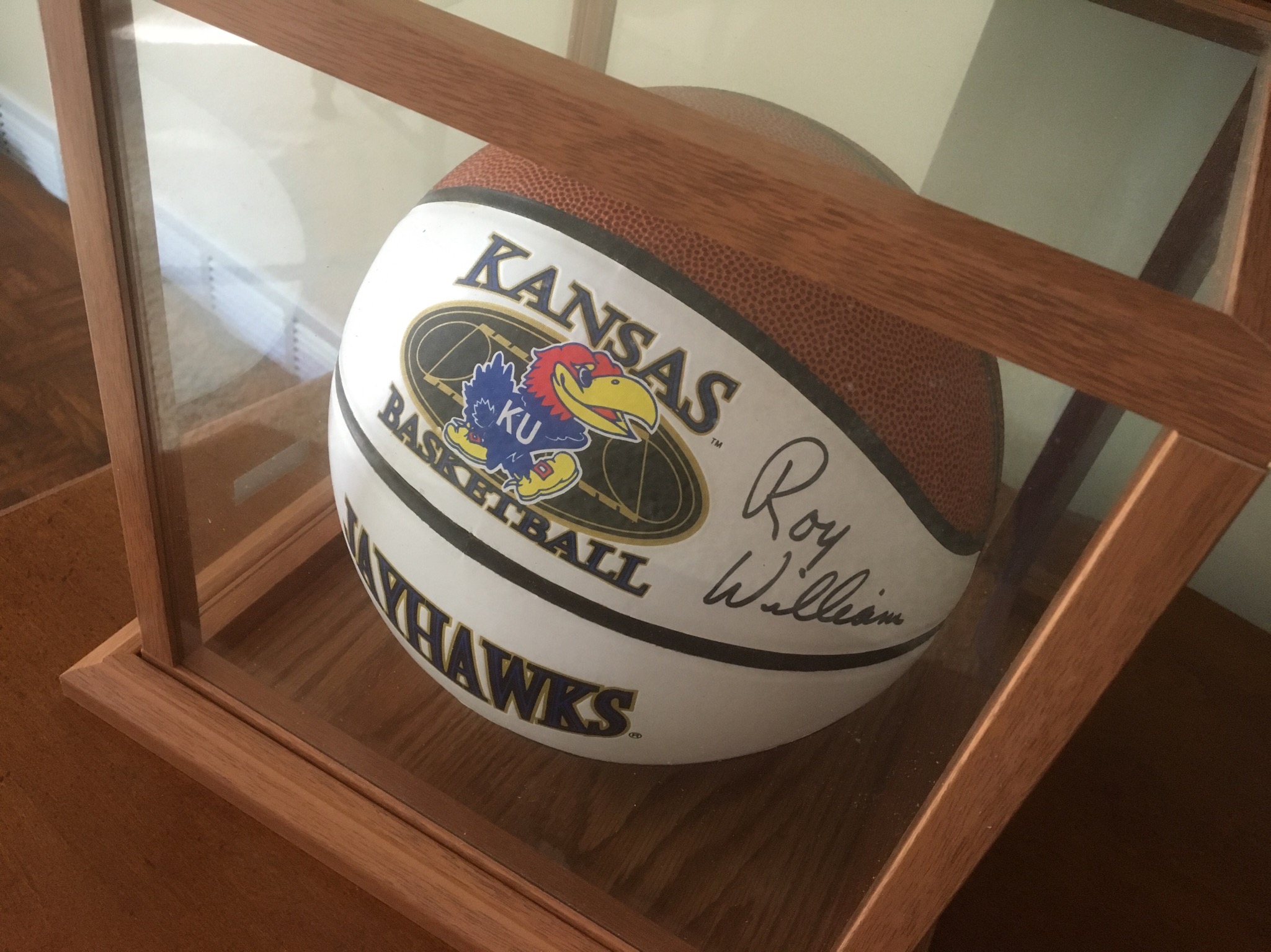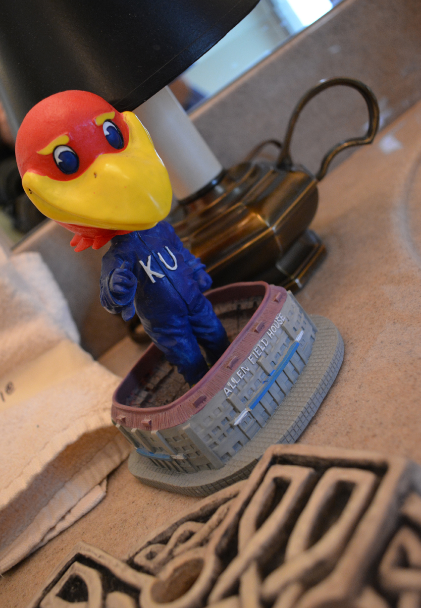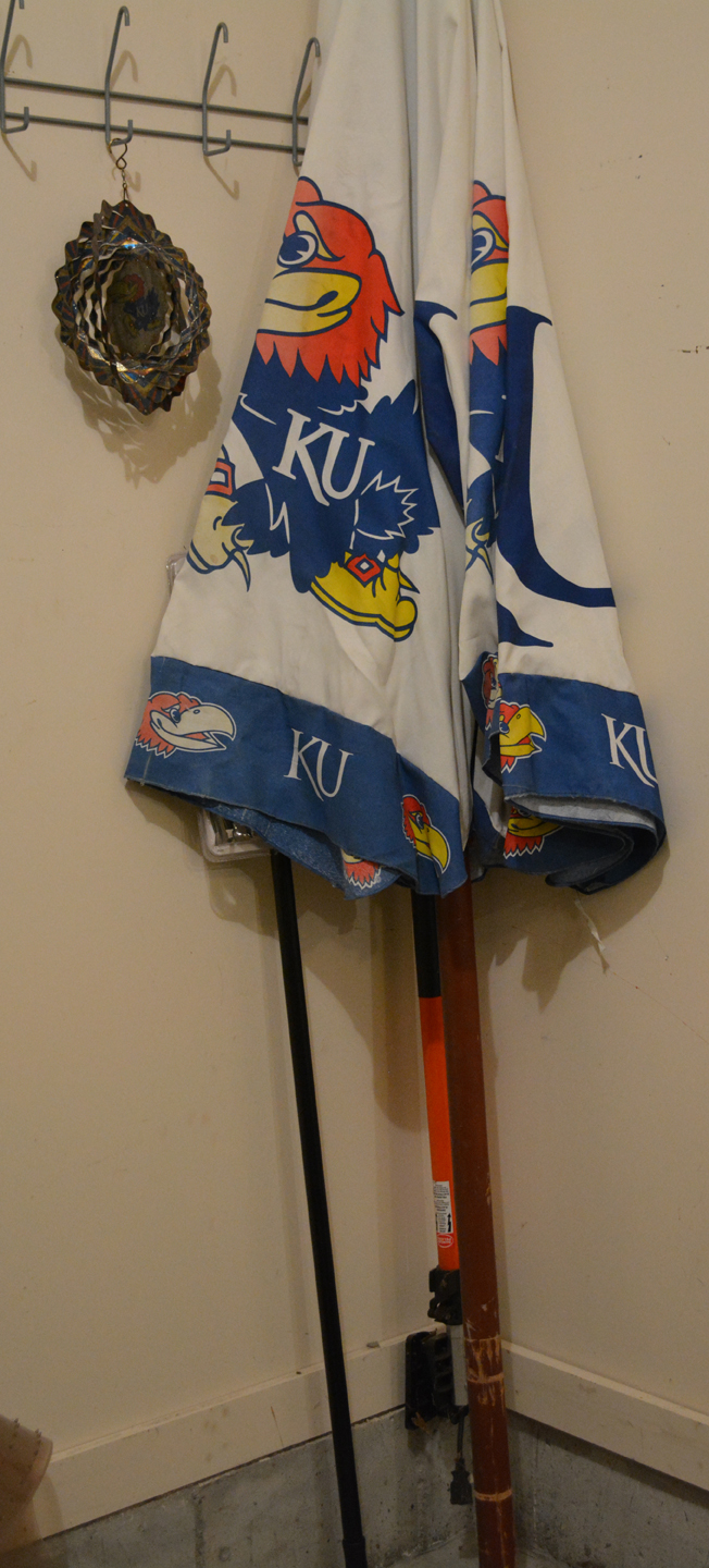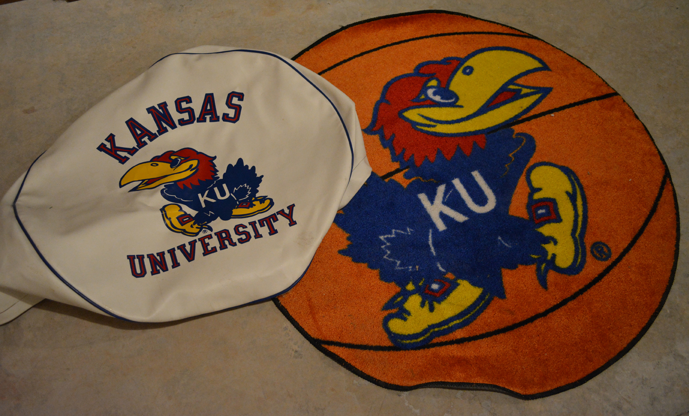 Rock-Chalker alert: a limited edition print of Game Day On The Hill by Jon Onion, an outdoor Jayhawk patio umbrella, a signed Roy Williams KU basketball in case (did y’all know that Roy was one of only 8 Basketball Coaches in the 112-ish year history of KU BBall – now THAT is impressive! Also have a signed KU football by Orange Bowl winning Head Coach Mark Mangino in case, KU handbags and other KU miscellany you Jayhawkers collect o’er the years …