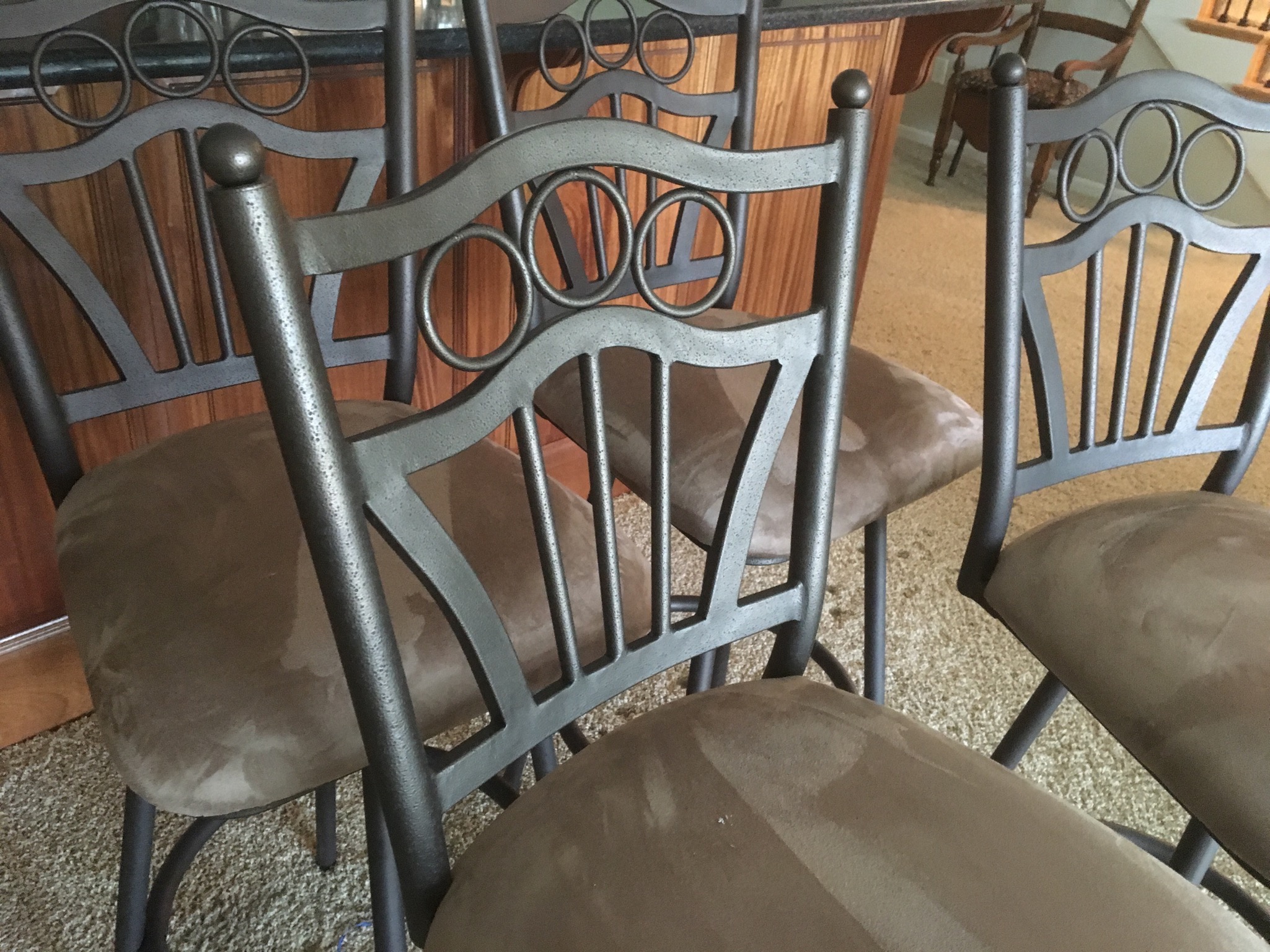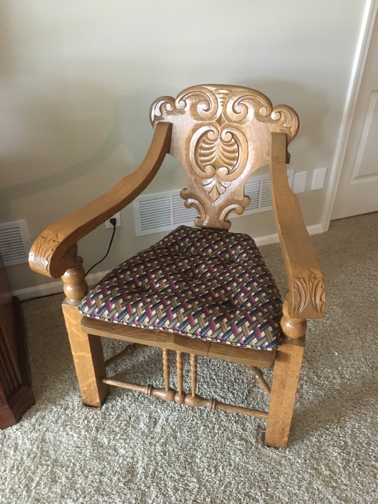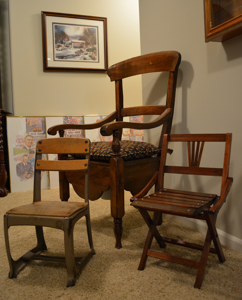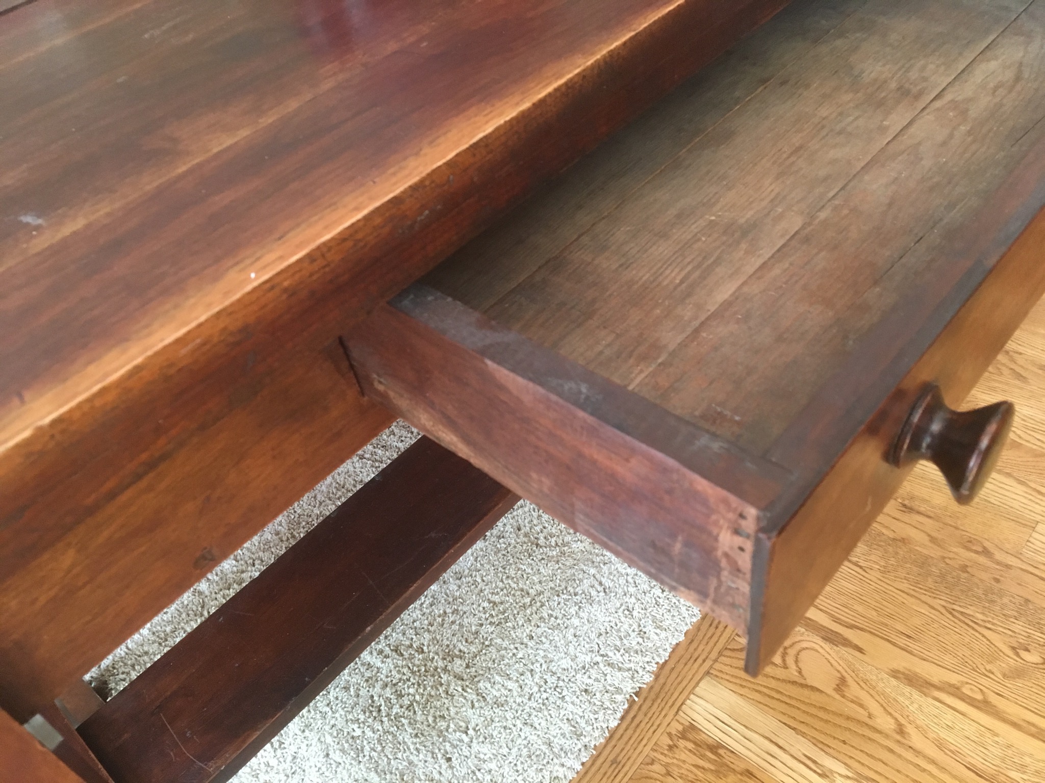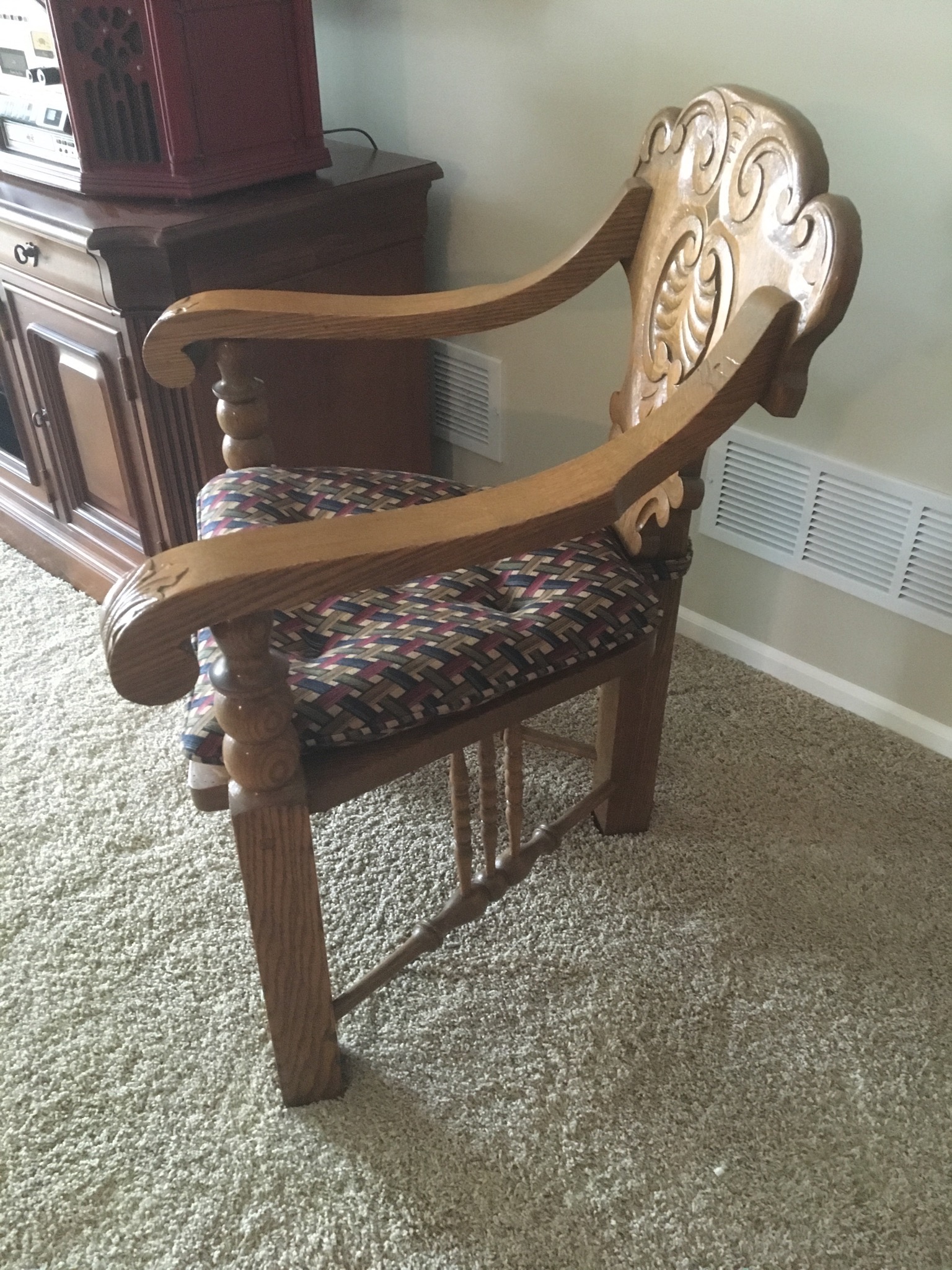 Darling cherry 2-drawer desk, tapestry chair, round game table w 4 matching cane-back chairs, square game table with matching chairs, 5’ long TV credenza w storage, a coolio 3-leg oak corner chair and 2 basic kitchen tables …