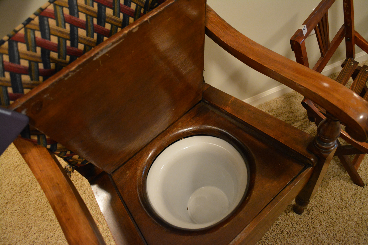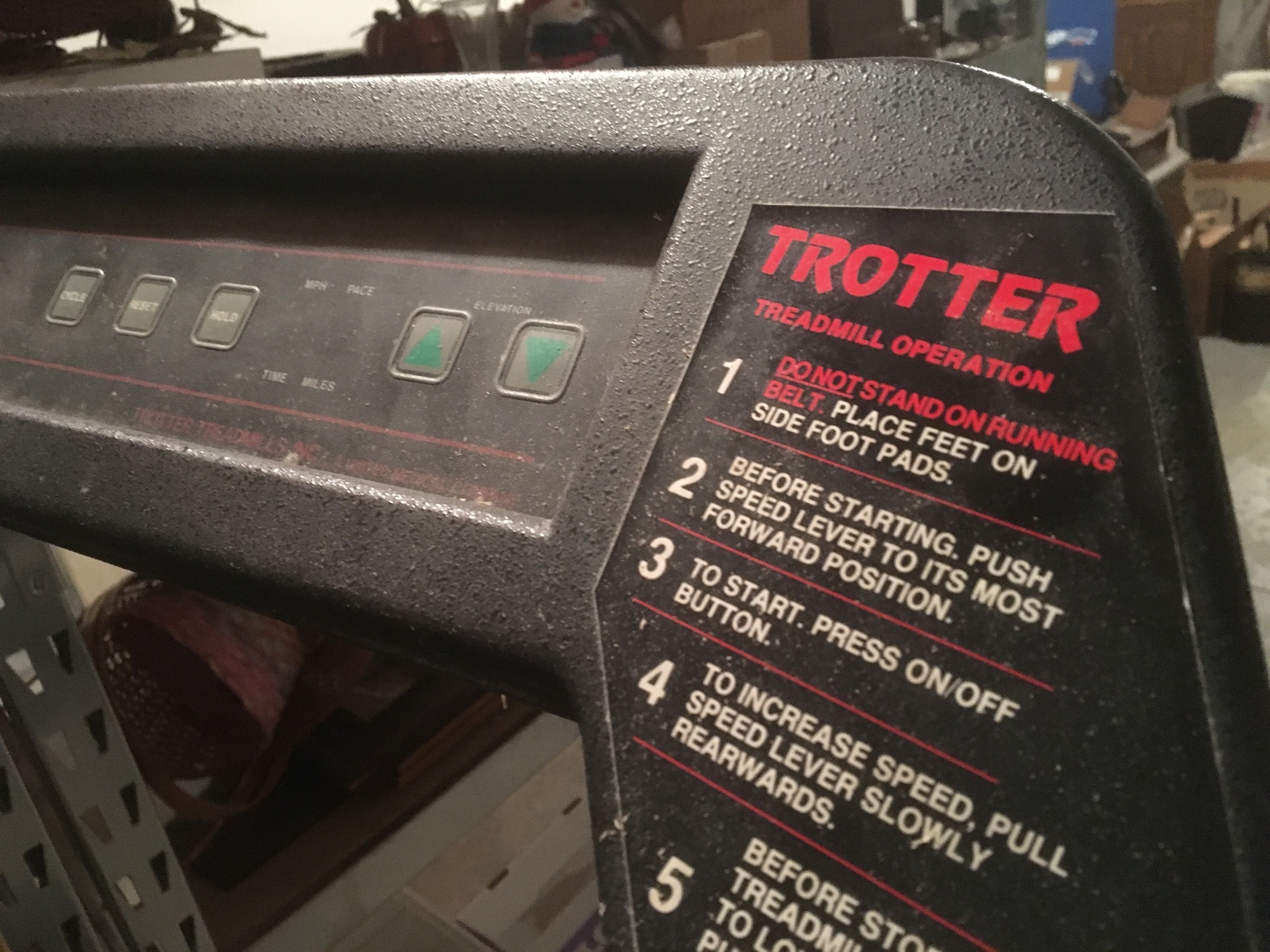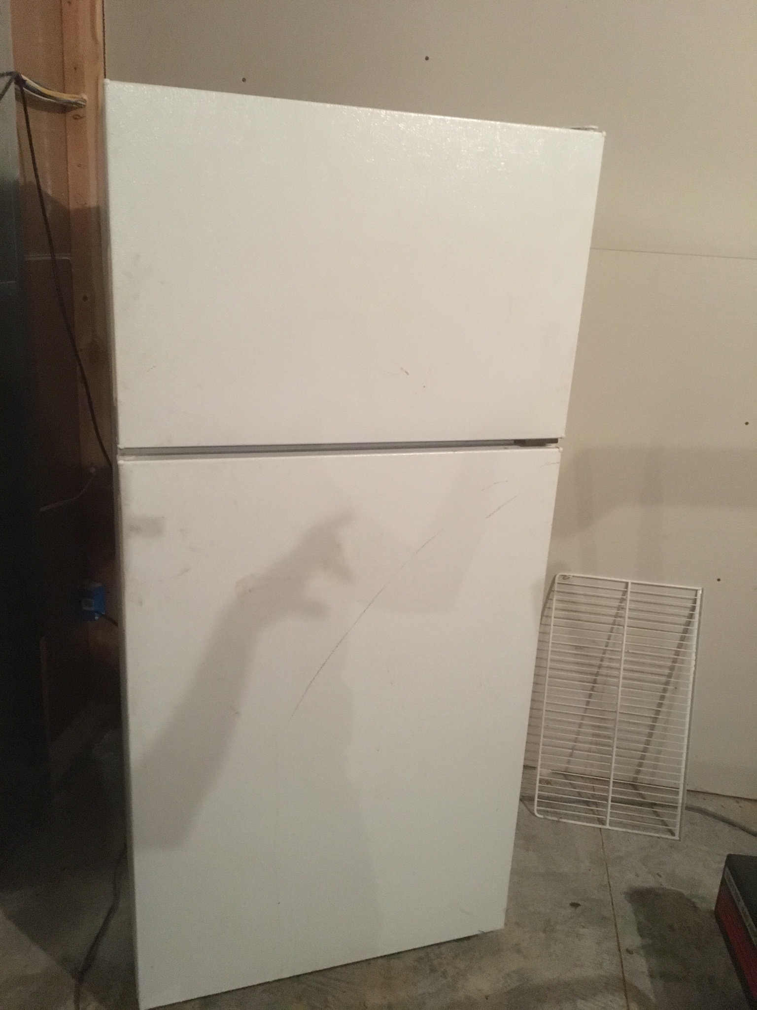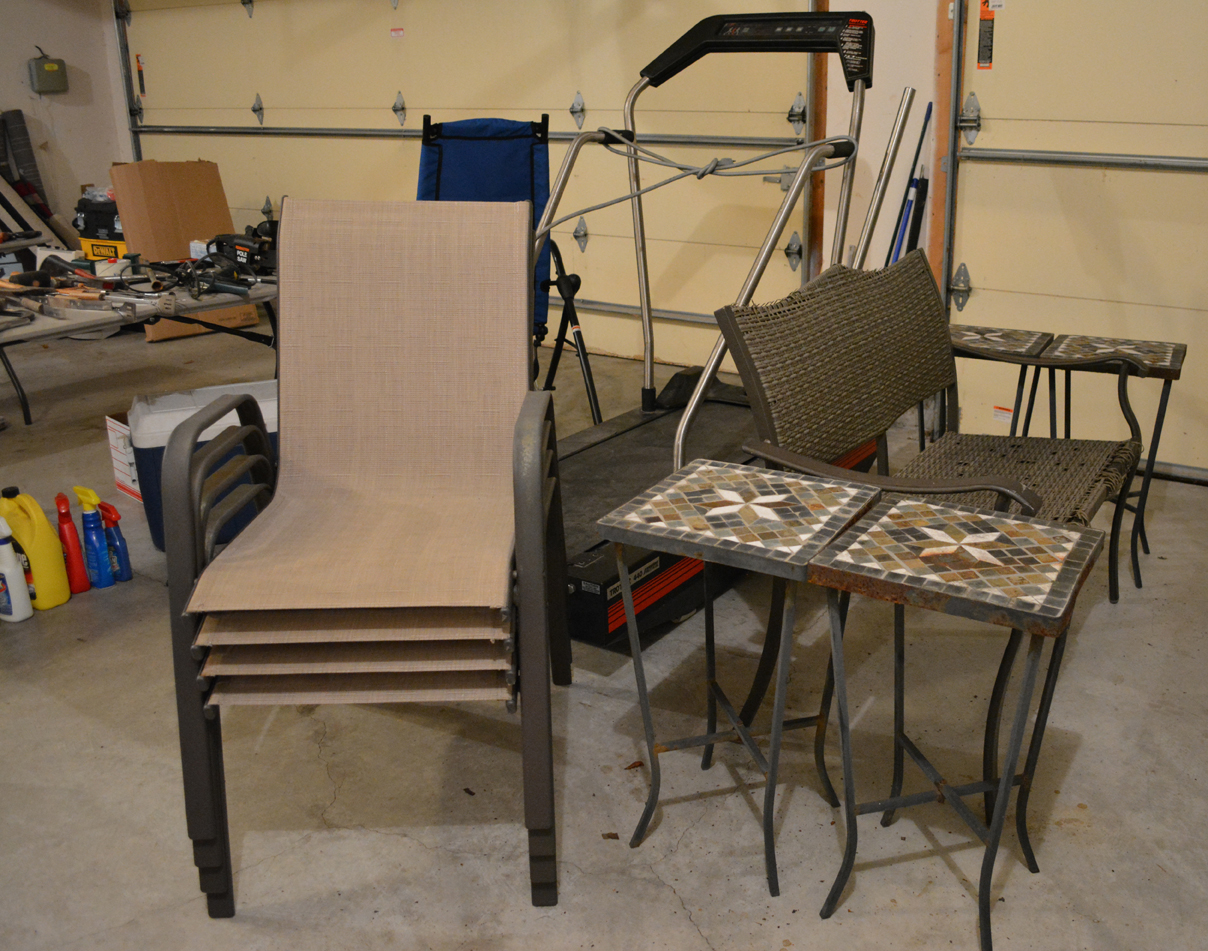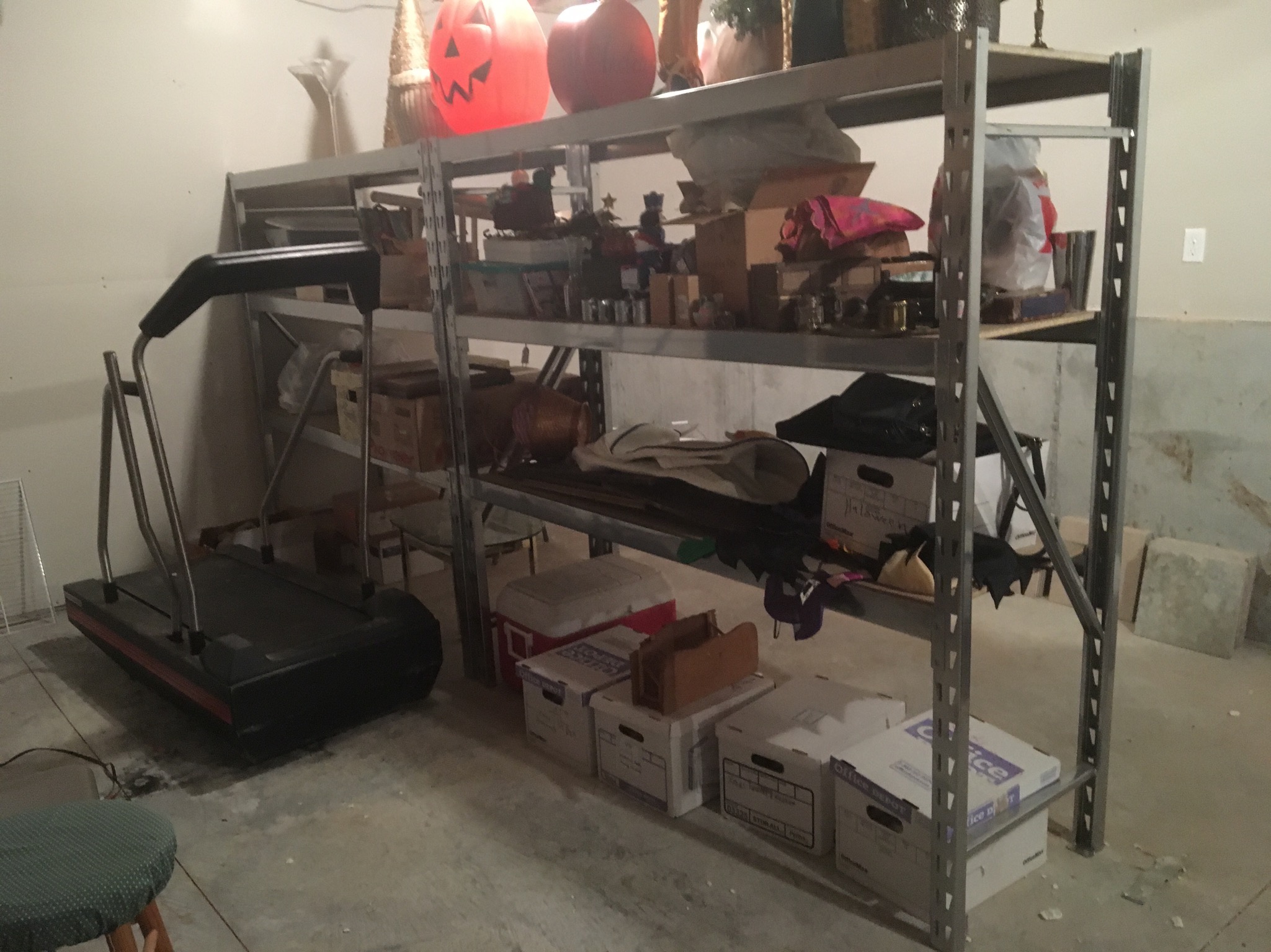 Flatscreen TV, antique wicker baby buggy, luggage, AB Lounger Max 2, 2 heavy-duty garage/basement storage shelf units, treadmill, basic white refrigerator, nice wheelchair …