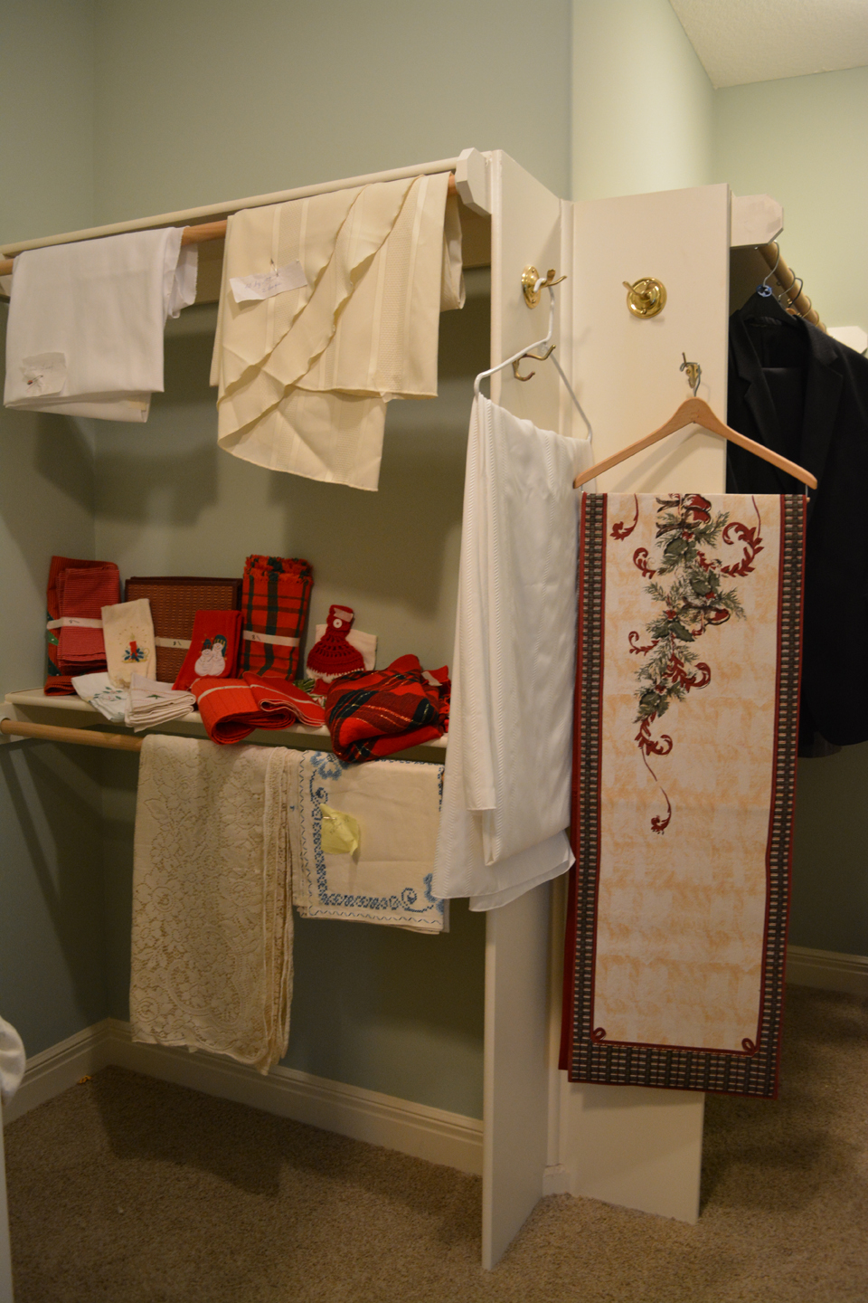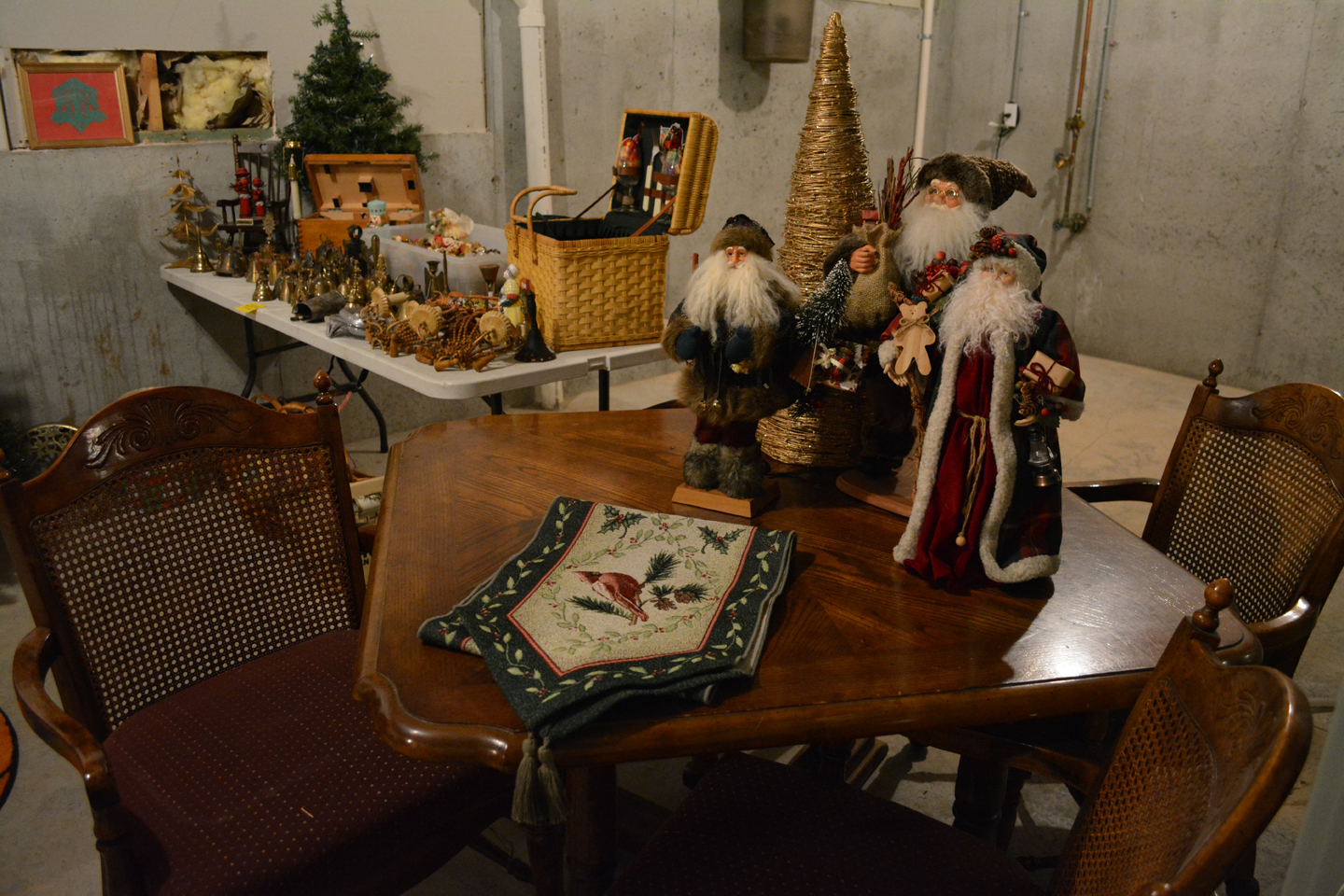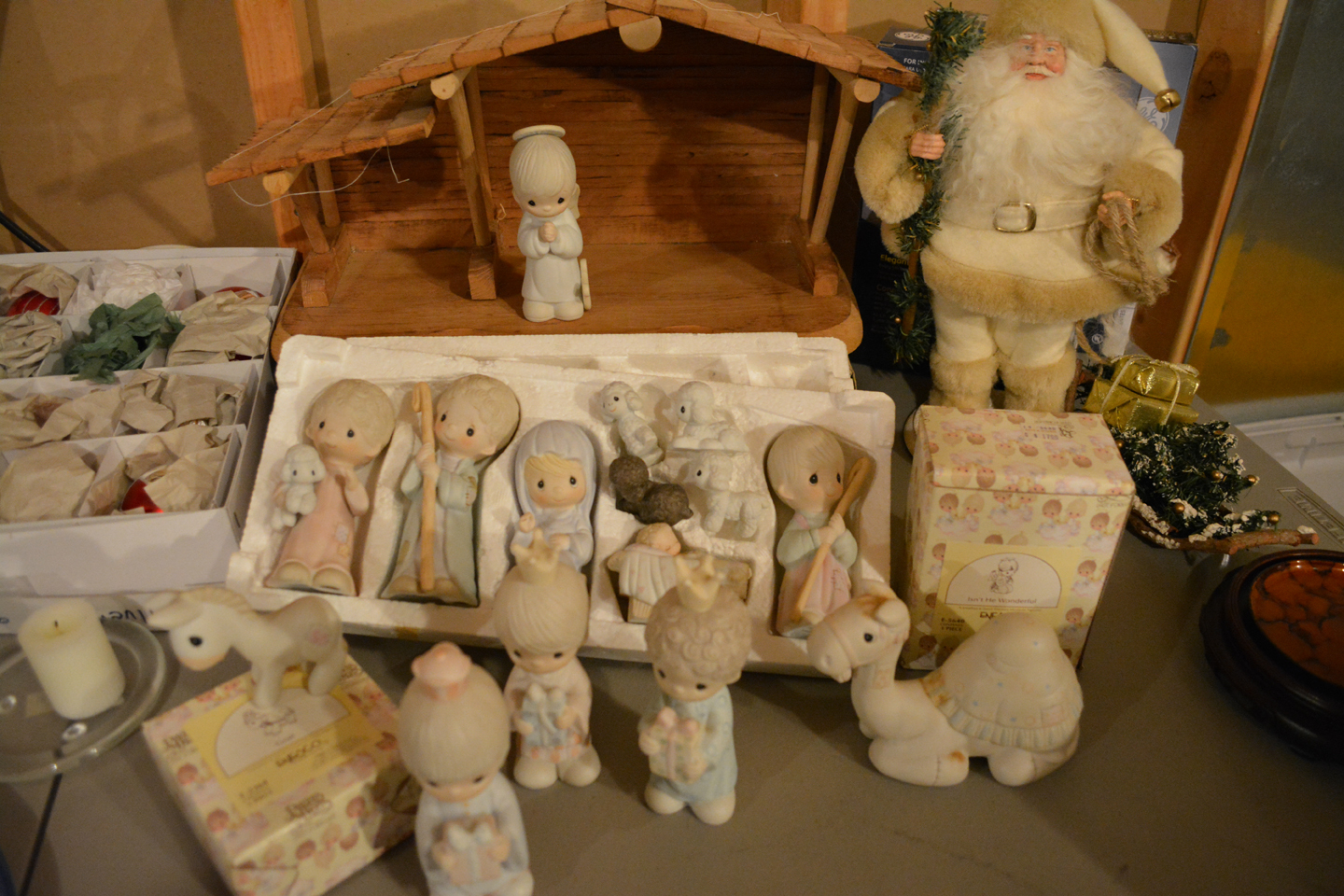 Tables full of those smalls that we all love to peruse, primitive ladder, glass insulators, bell collection, Precious Moments Nativity scene, nice Santas, antique wall phone, Queen Posturepedic mattress . ..