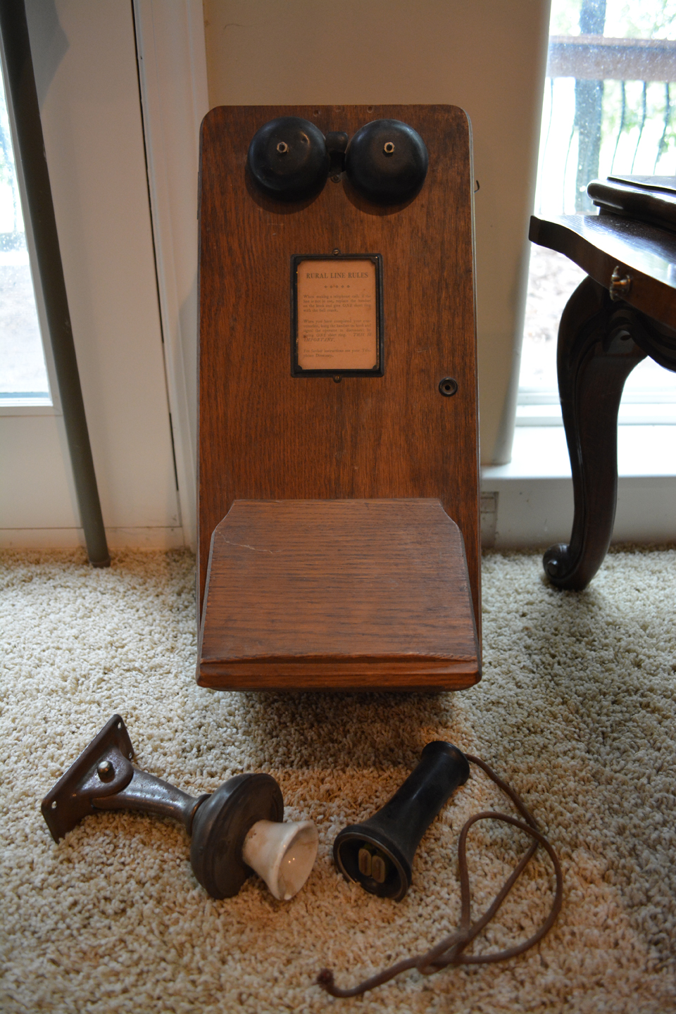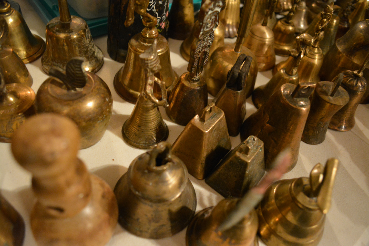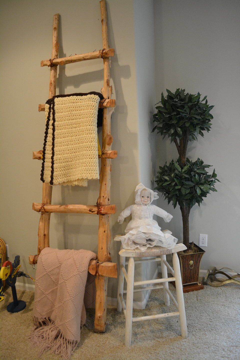 Tables full of those smalls that we all love to peruse, primitive ladder, glass insulators, bell collection, Precious Moments Nativity scene, nice Santas, antique wall phone, Queen Posturepedic mattress . ..