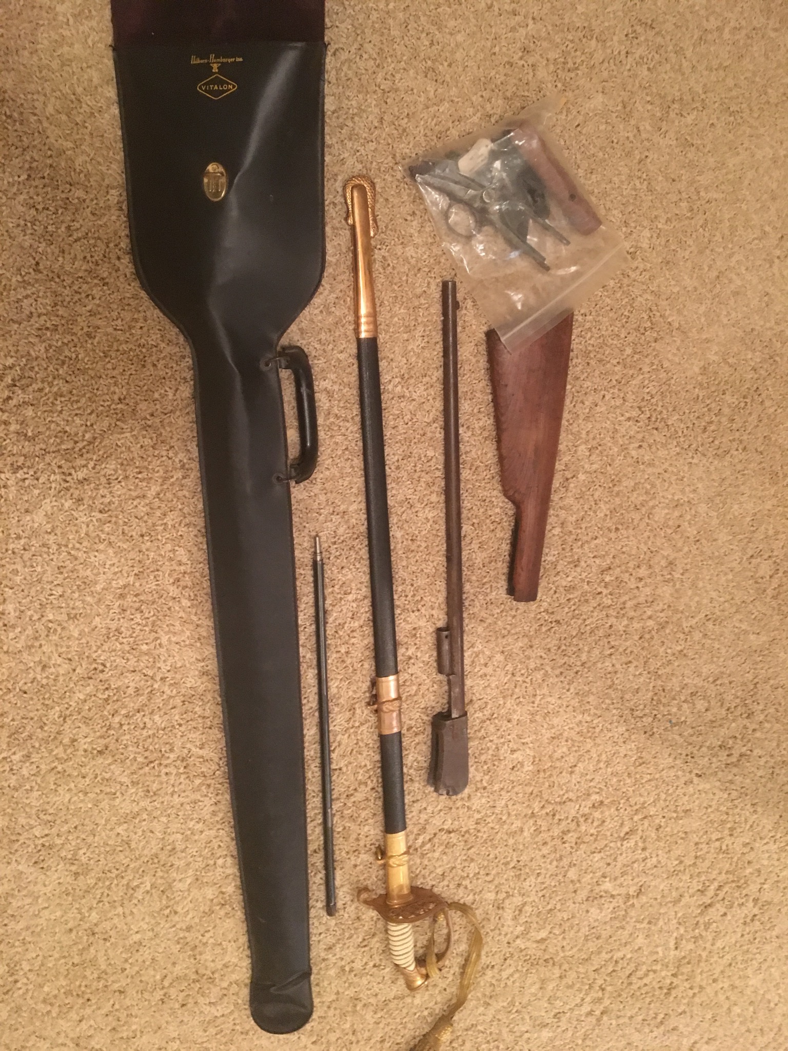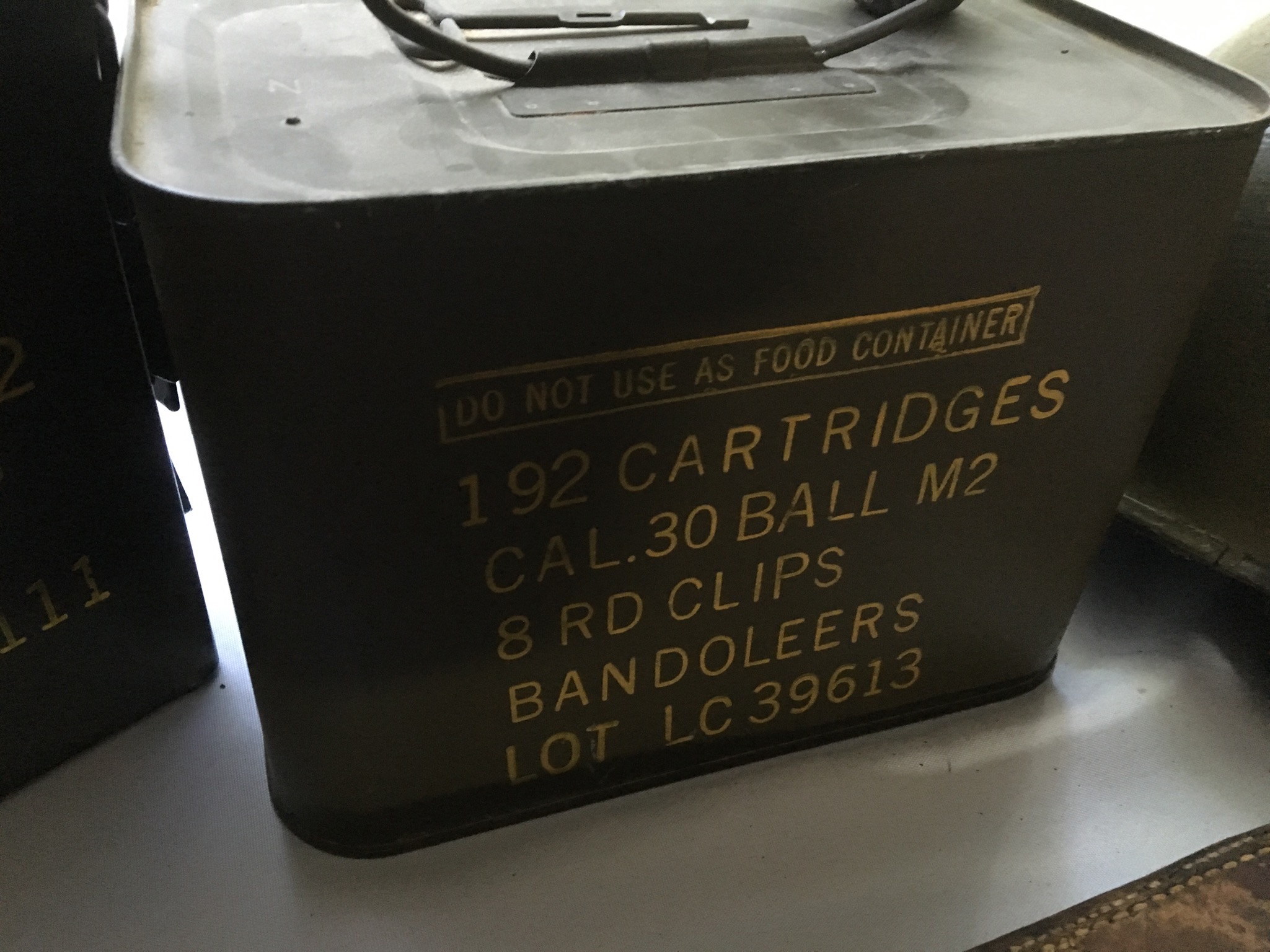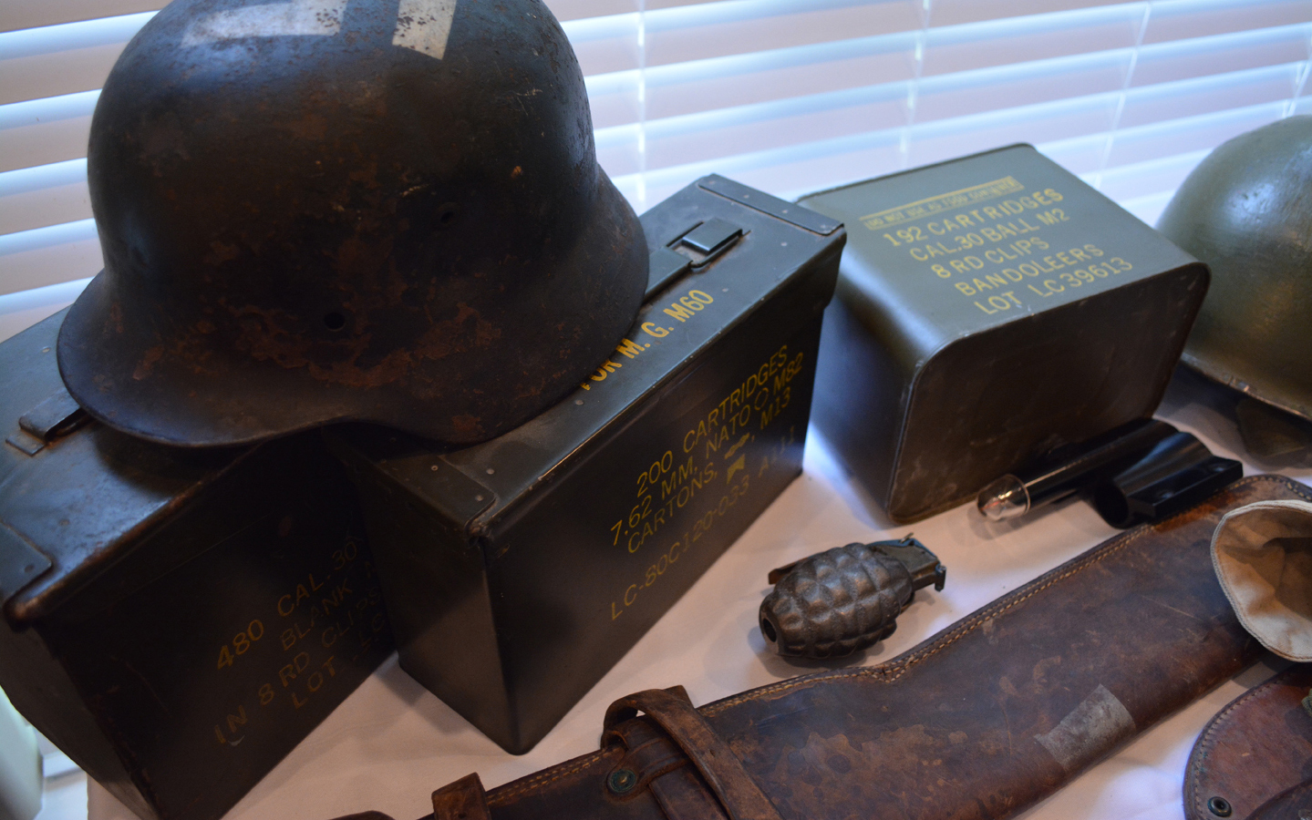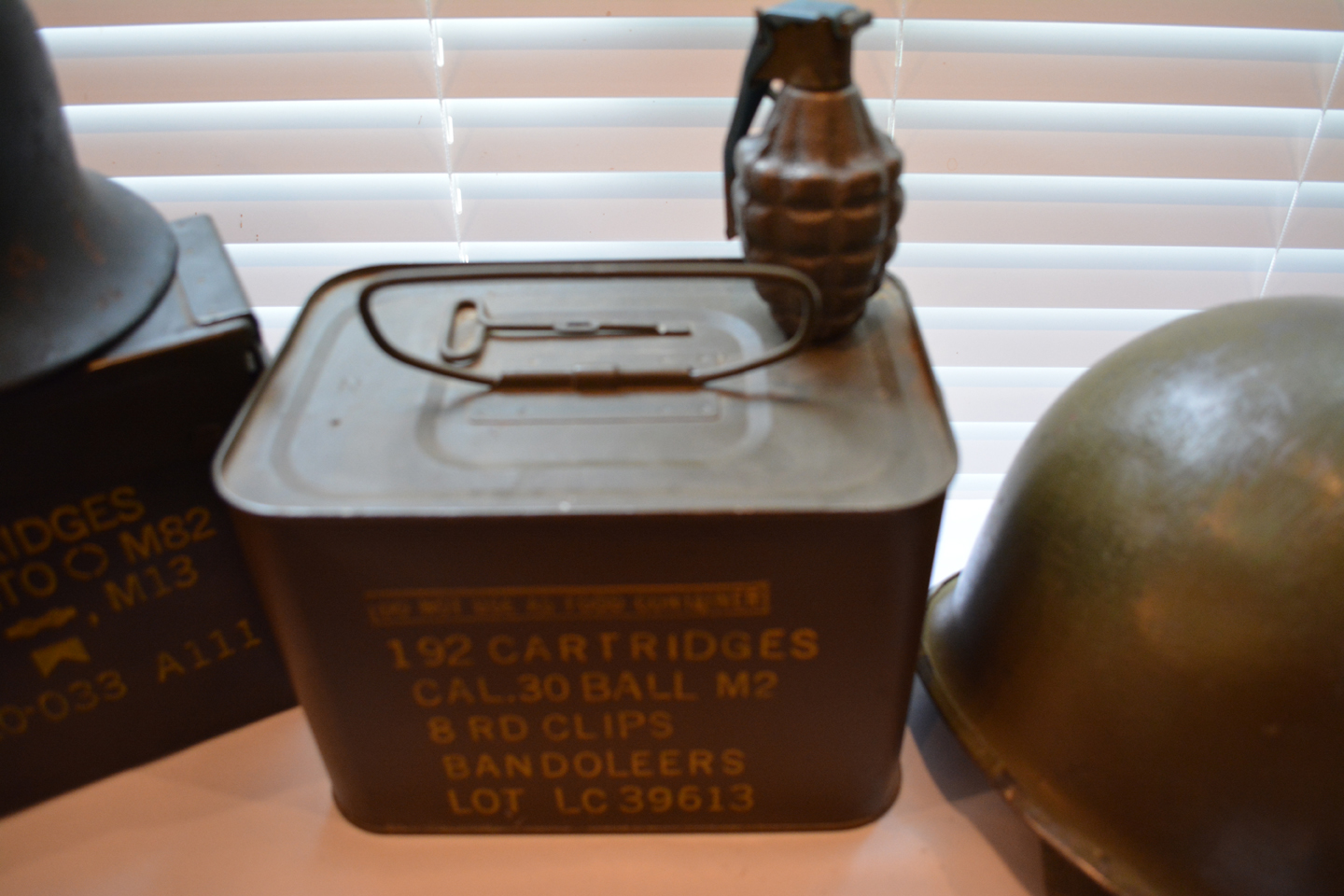 Drilled grenade, WWI helmet, WWII helmet, German WWII helmet with Nazis symbol, US Navy 1944 machete, 3 WWII Ammo boxes one of which has never been opened with ammo inside …