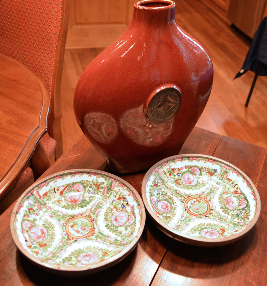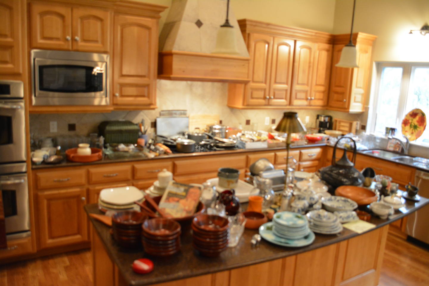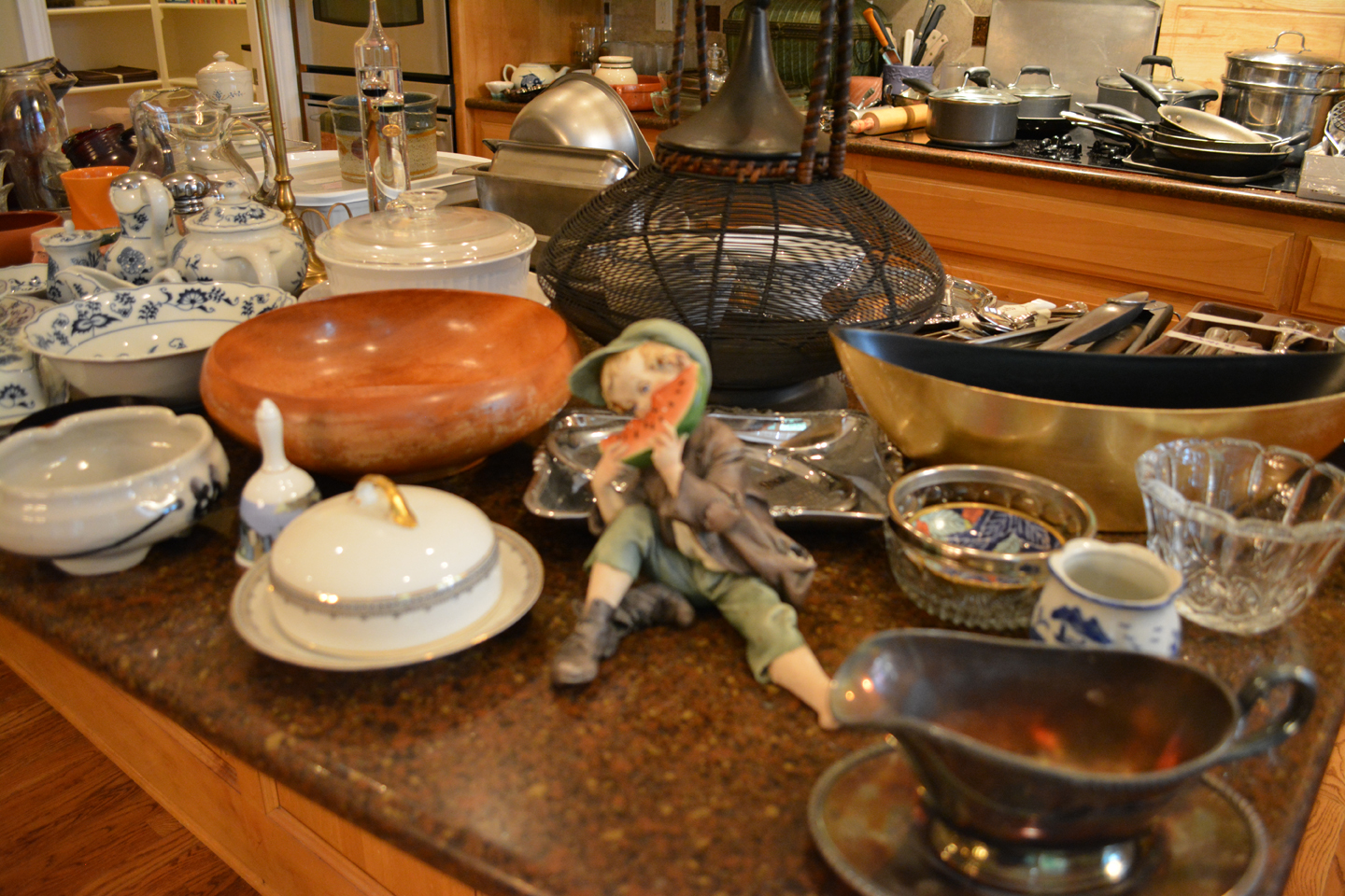 Fun kitchen stuff including dishes, Wallace stainless flatware set and other flatware, serving pieces, pots and pans, lots of interesting home decor, framed artwork, women’s clothing – shoes – handbags …