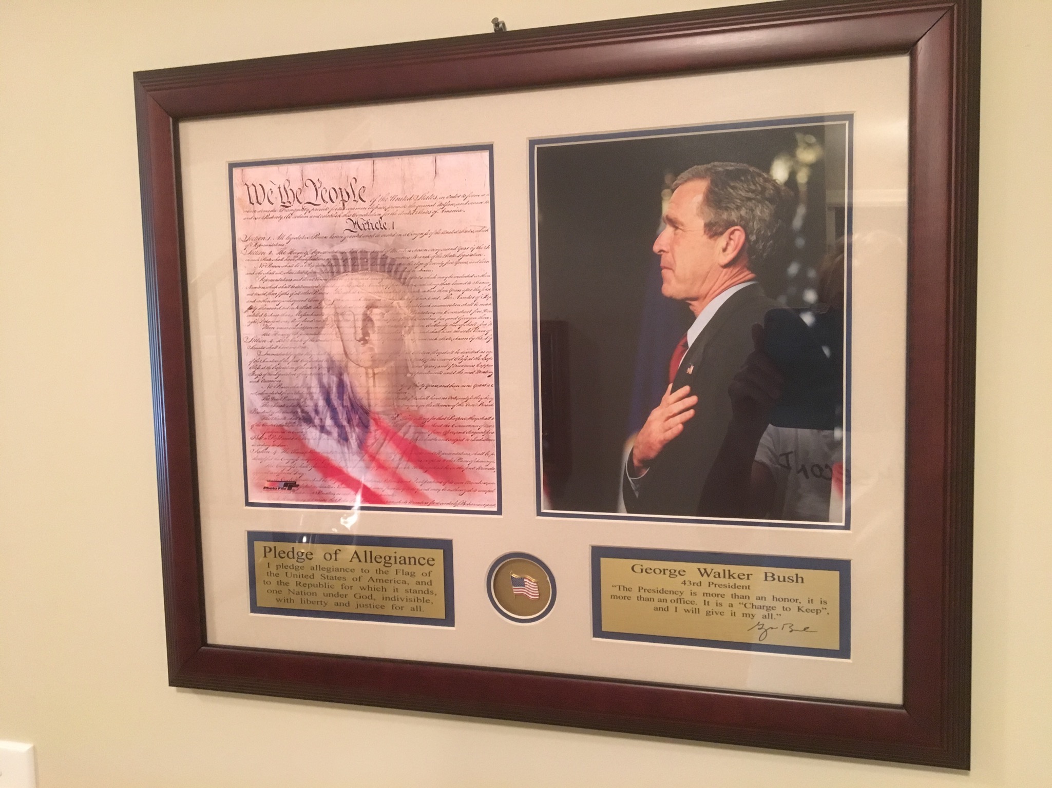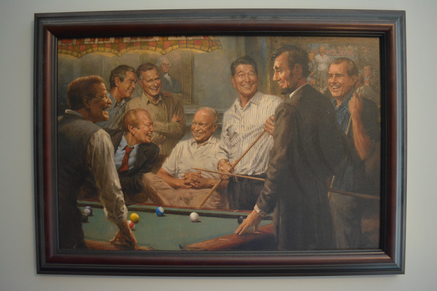 A commemorative framed pic of our 43rd President, George Dubyah Bush, and a framed print titled “Callin’ The Blue” with 8 Repulican Presidents playing pool (say that 3 times fast) …
