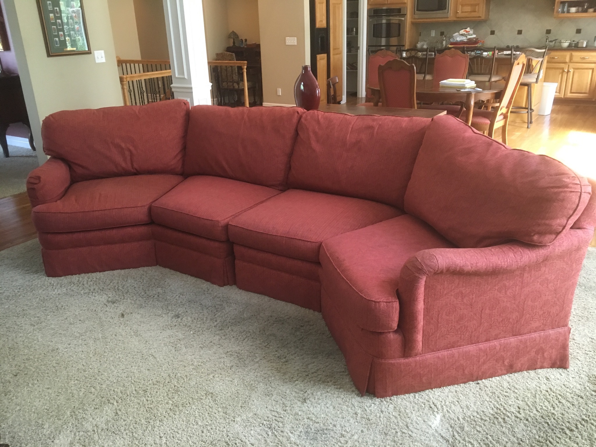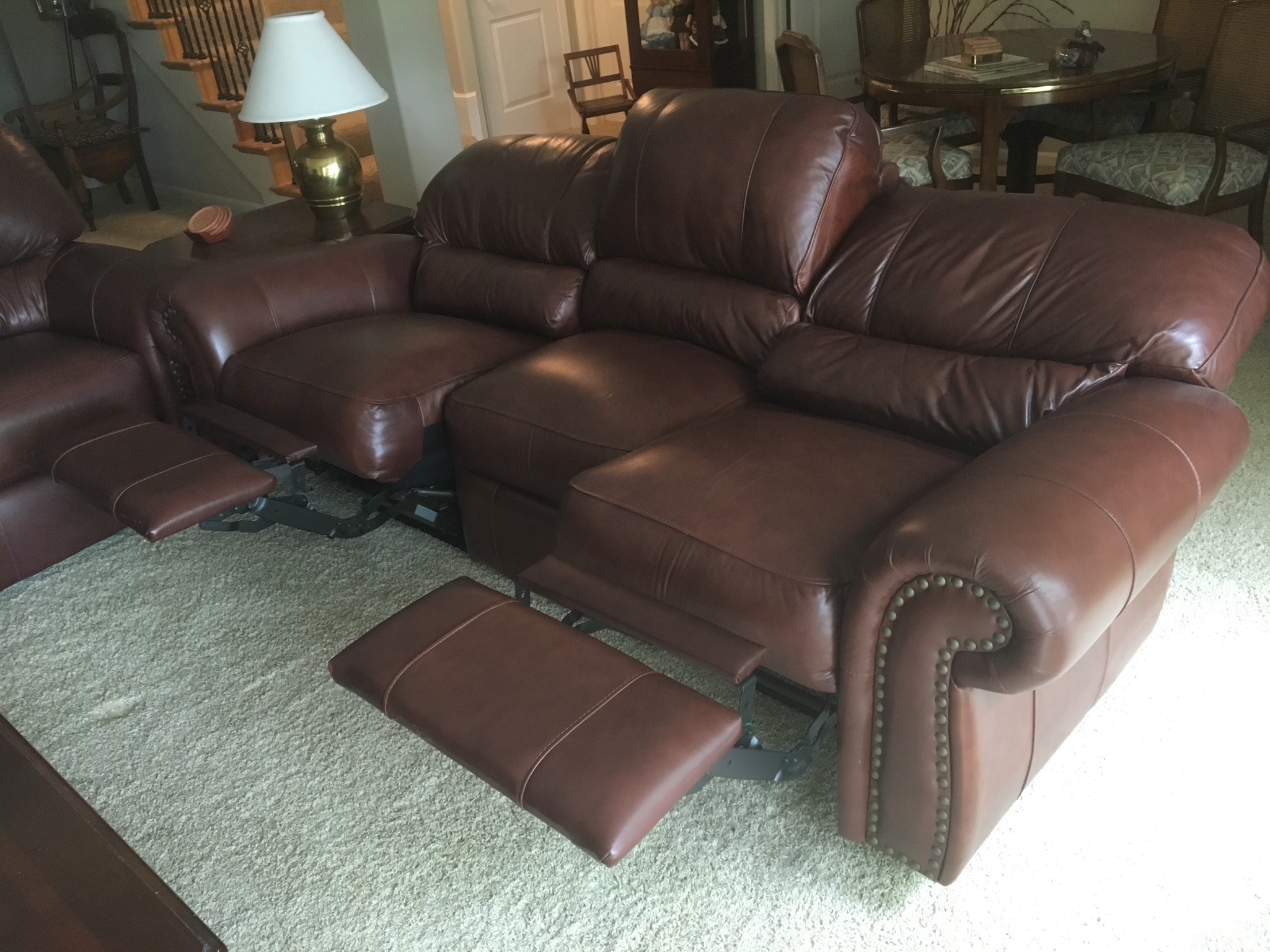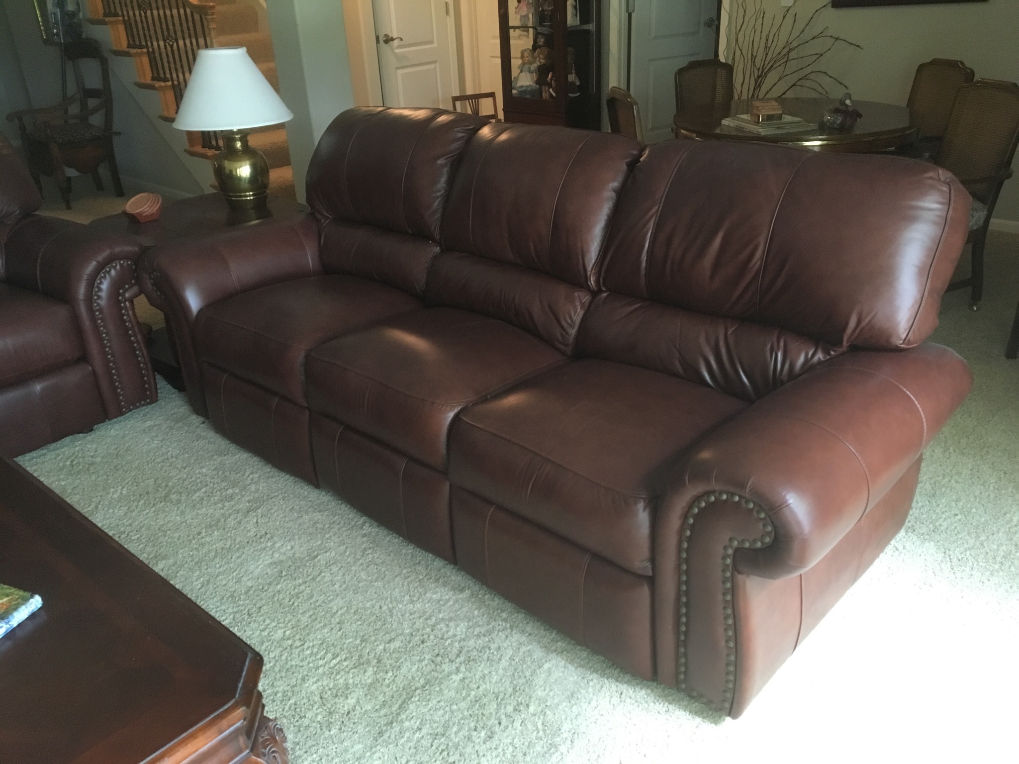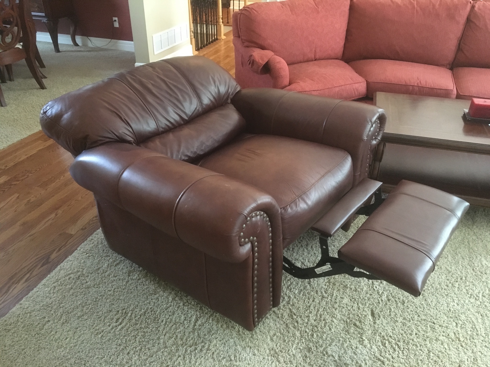 Sherrill cran-raspberry 4-pc sectional sofa, antique 1-drawer table, nice brown leather grouping including a reclining chair, sofa with reclining end seats, and matching loveseat—all like new …
