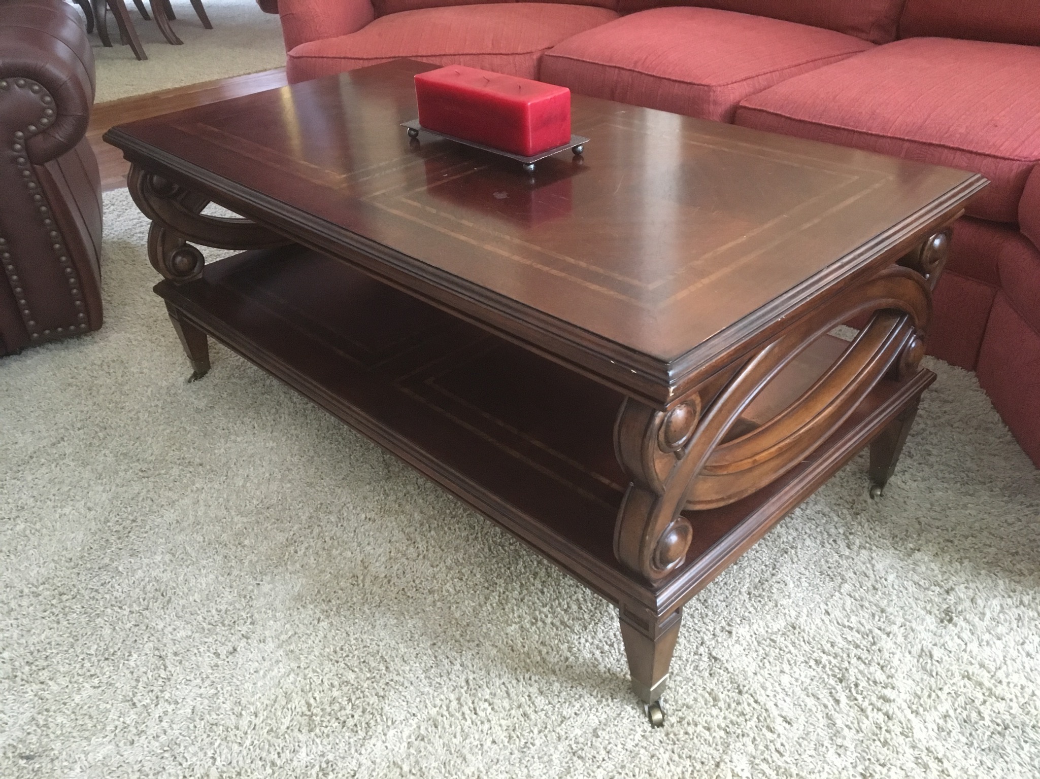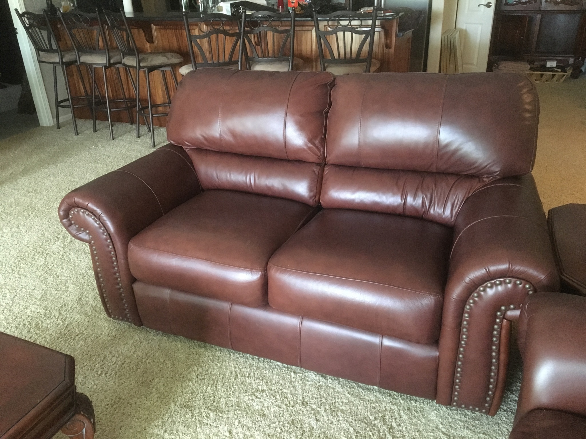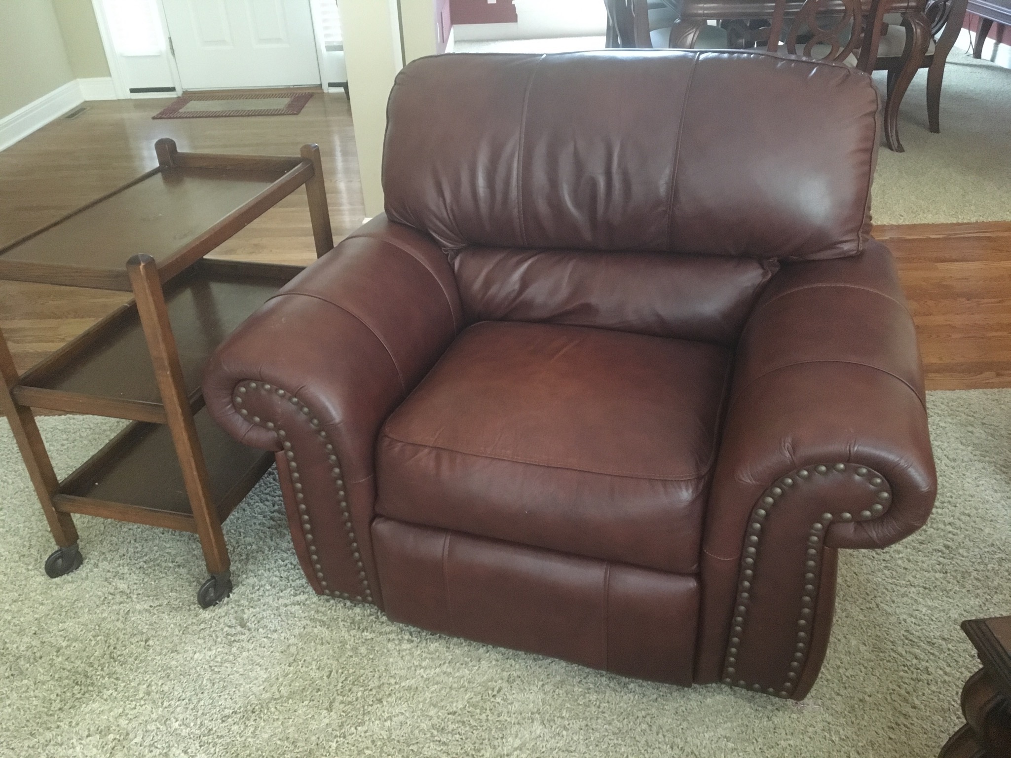 Sherrill cran-raspberry 4-pc sectional sofa, antique 1-drawer table, nice brown leather grouping including a reclining chair, sofa with reclining end seats, and matching loveseat—all like new …