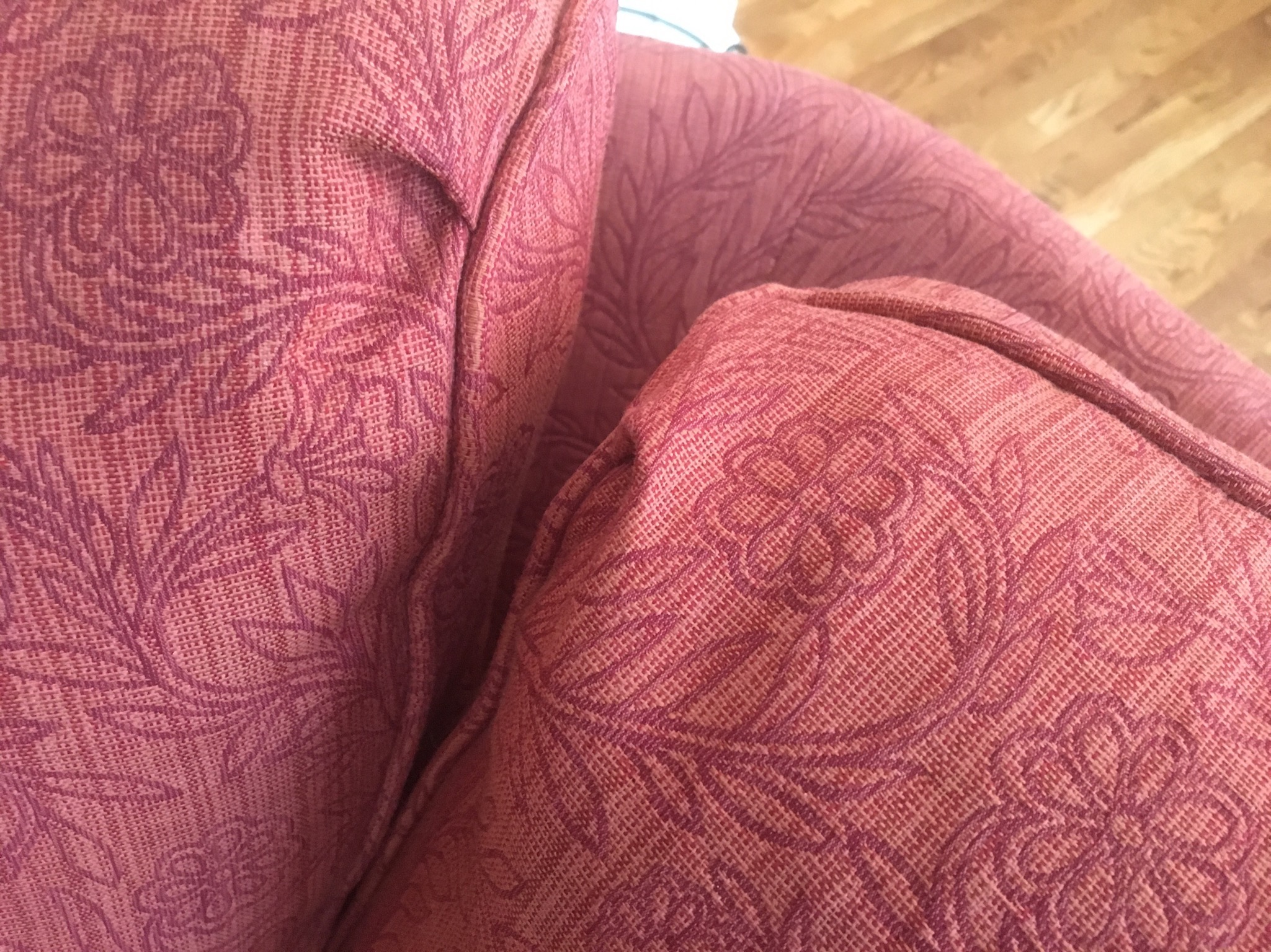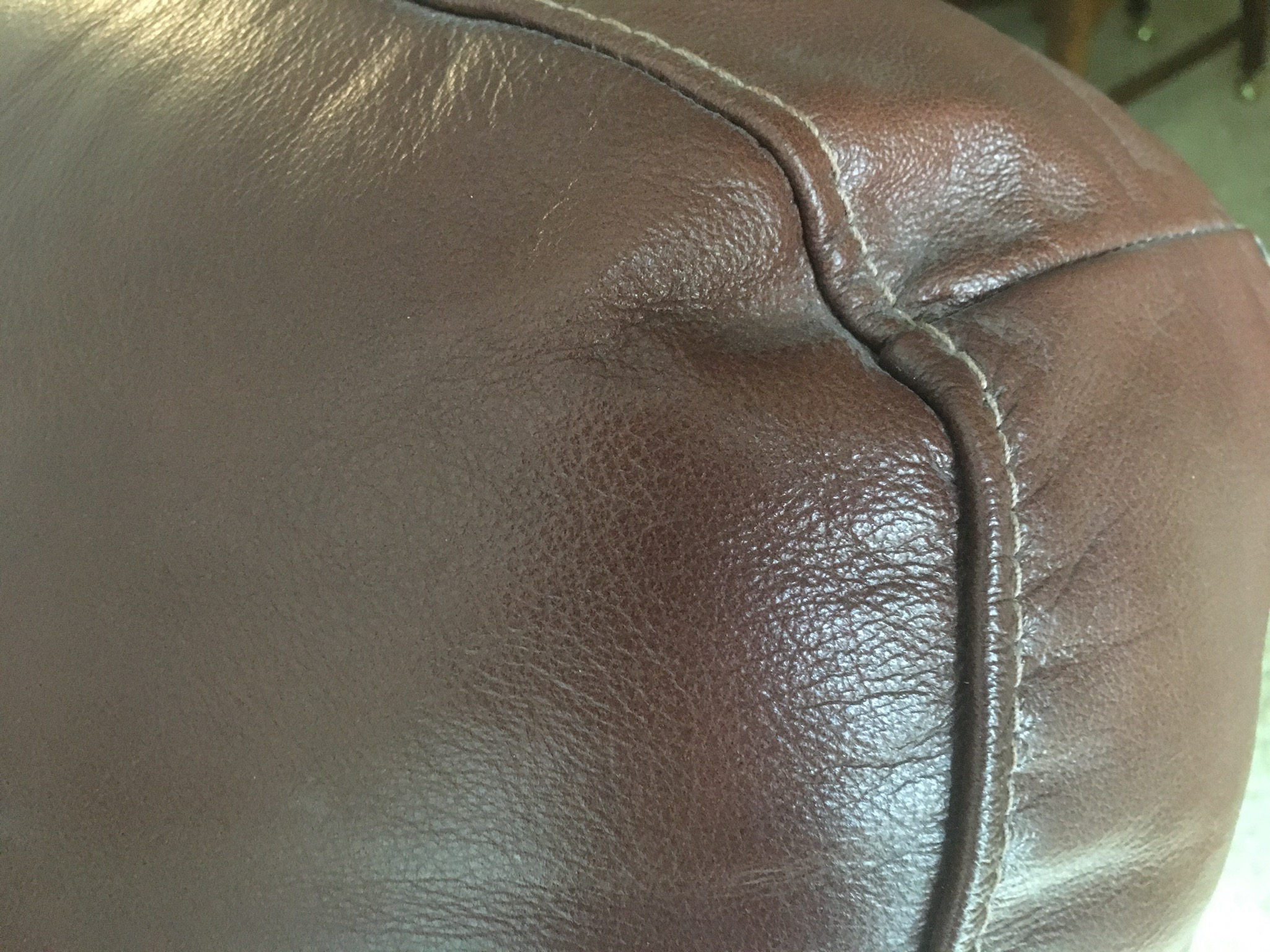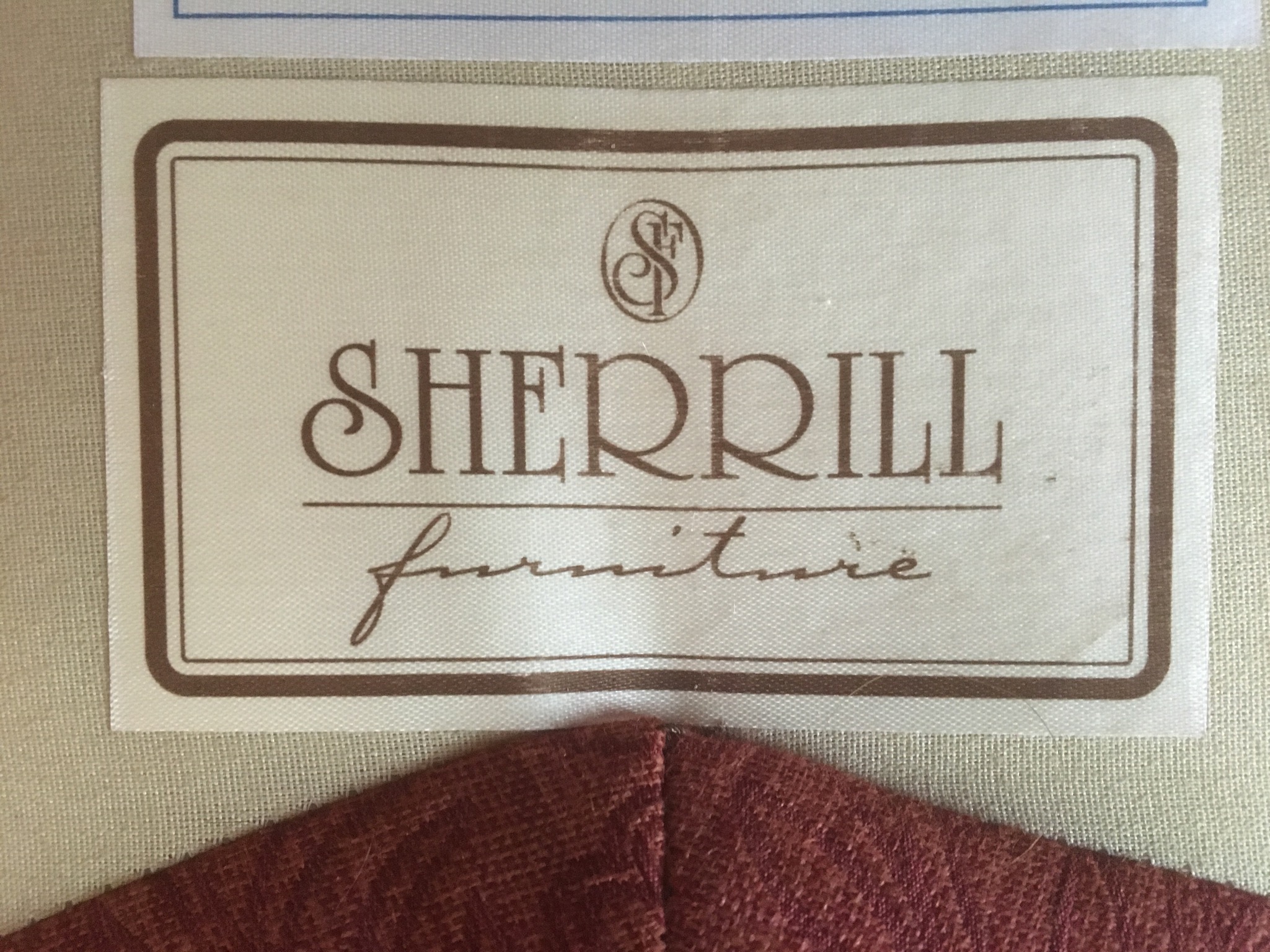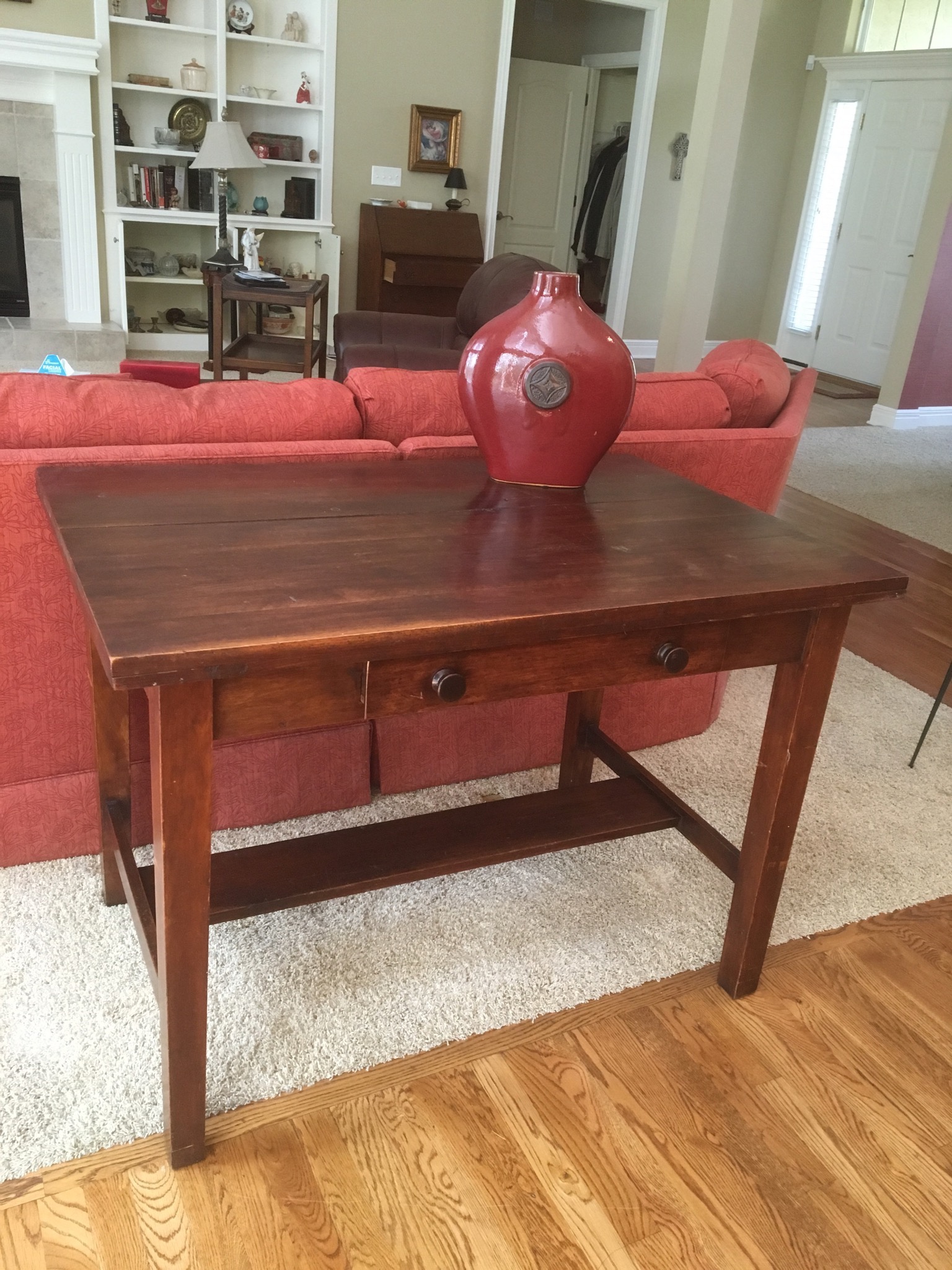 Sherrill cran-raspberry 4-pc sectional sofa, antique 1-drawer table, nice brown leather grouping including a reclining chair, sofa with reclining end seats, and matching loveseat—all like new …