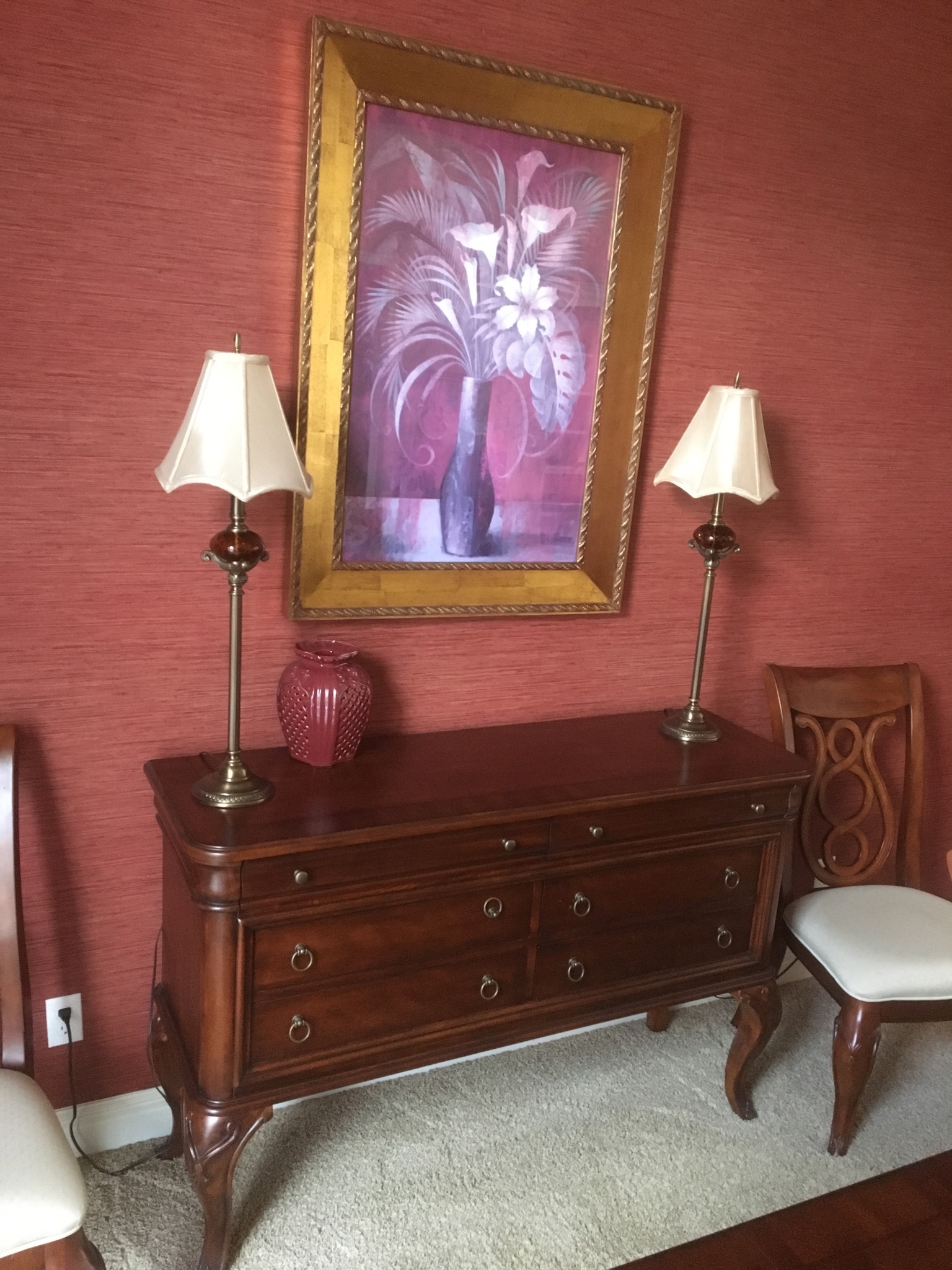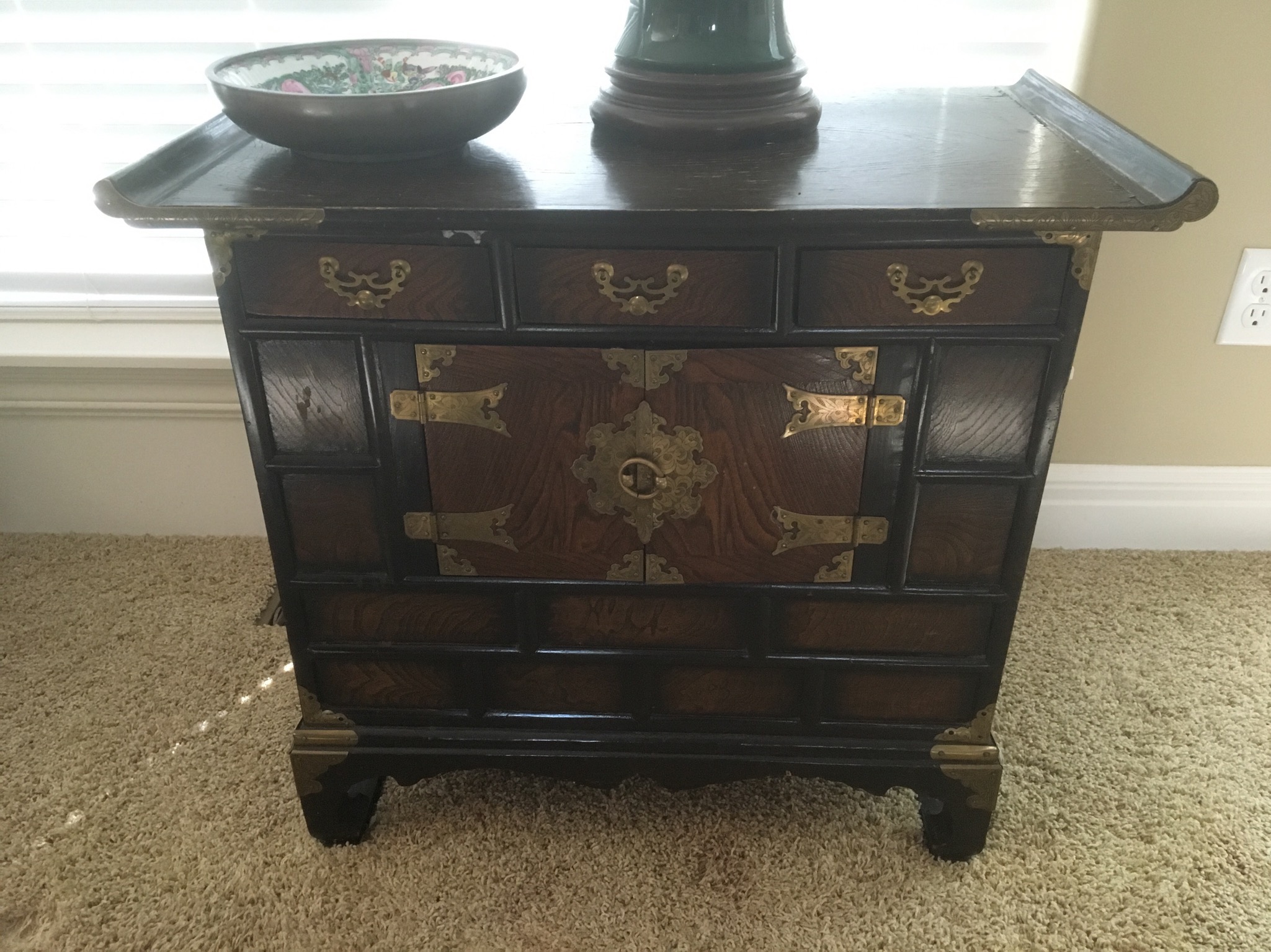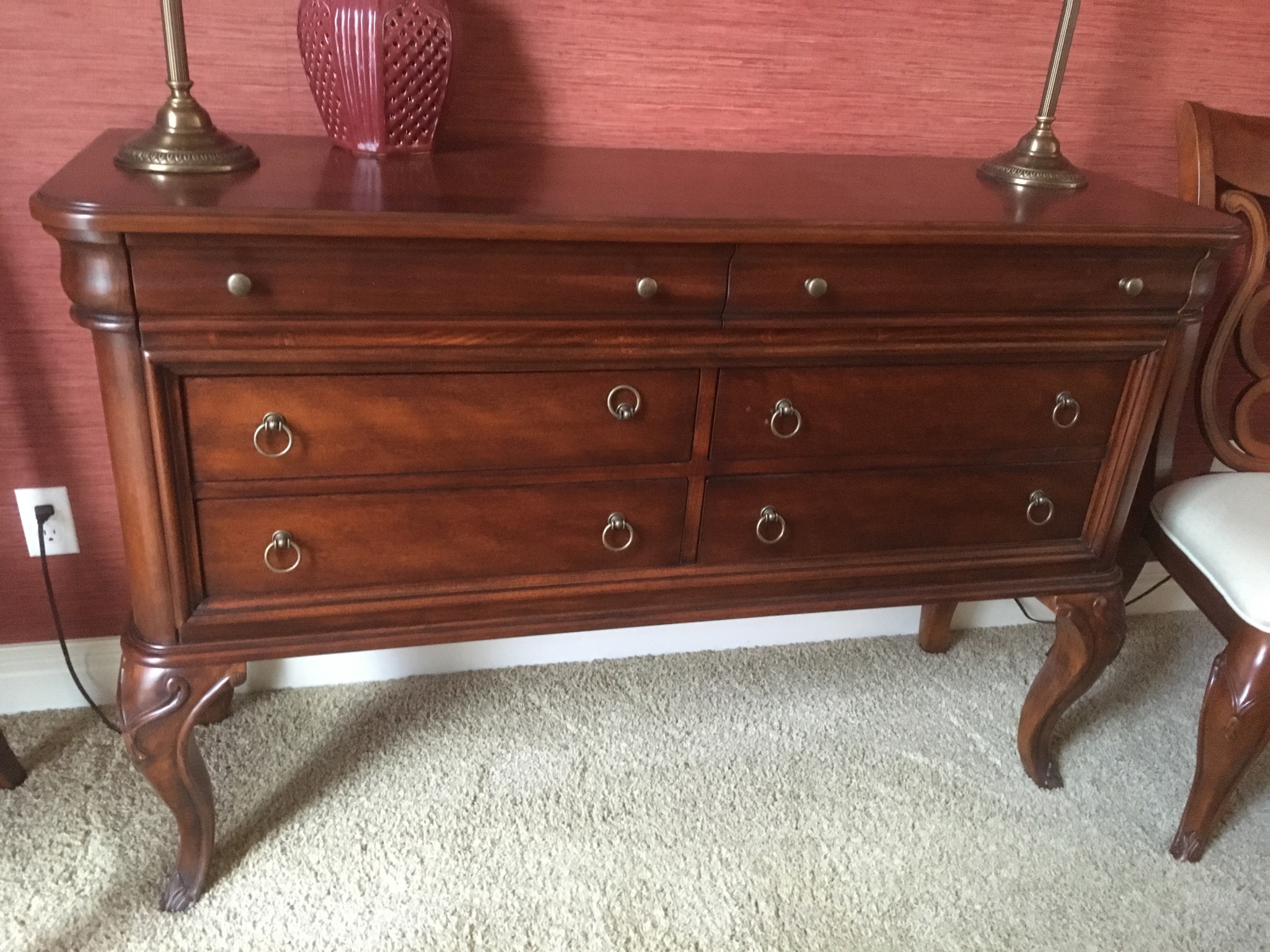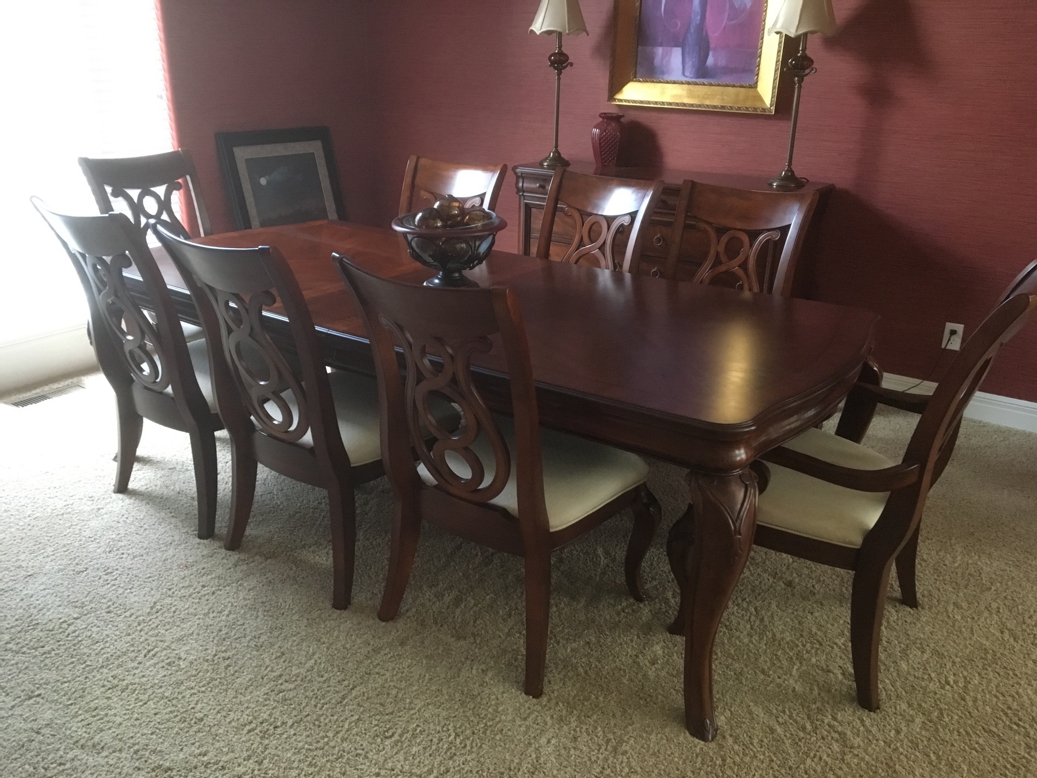 Beeeeautiful dark wood dining table with 2 leaves – 8 chairs and matching 6 drawer credenza/buffet, sweet fold down writing desk and an “aww, look at that” charming oriental side table …