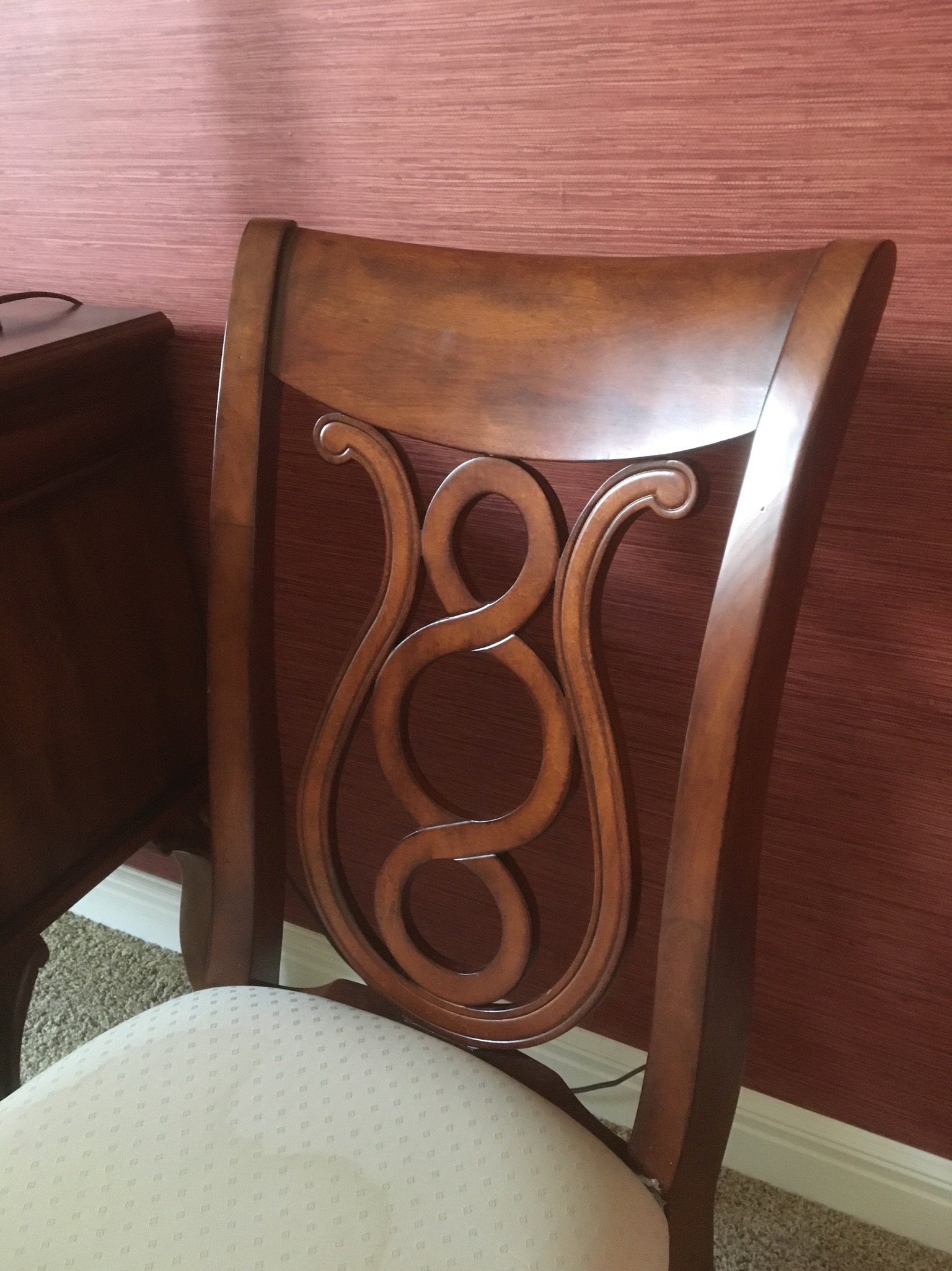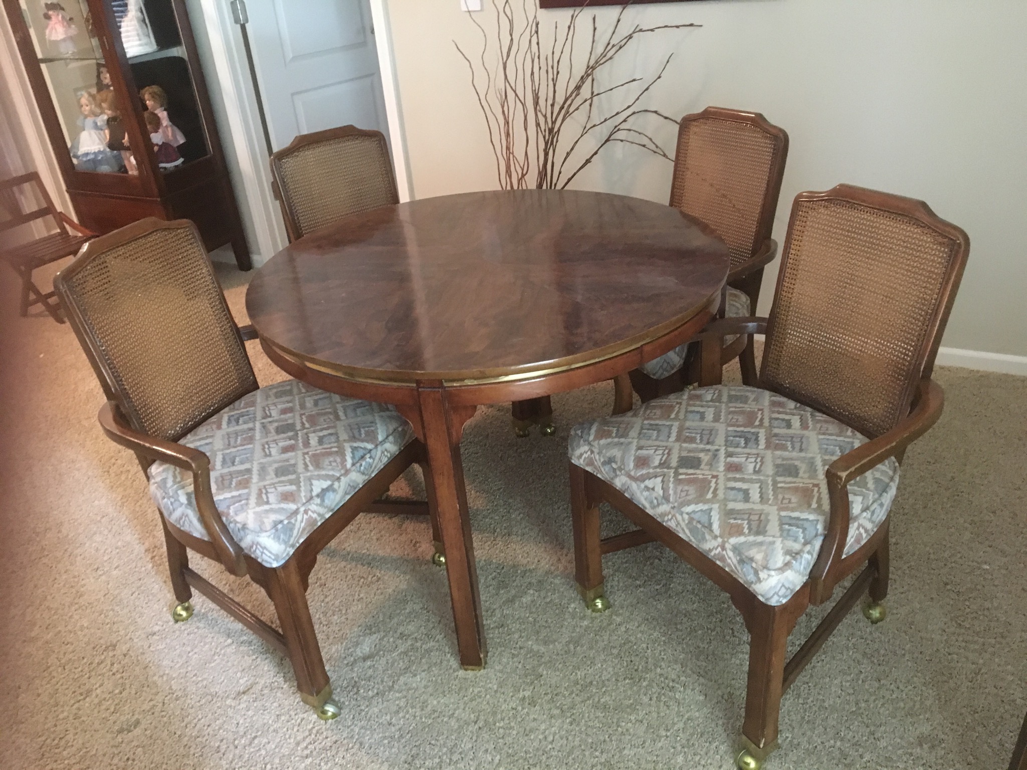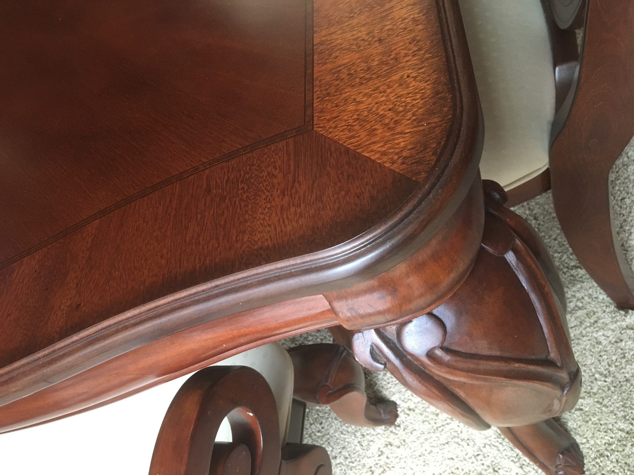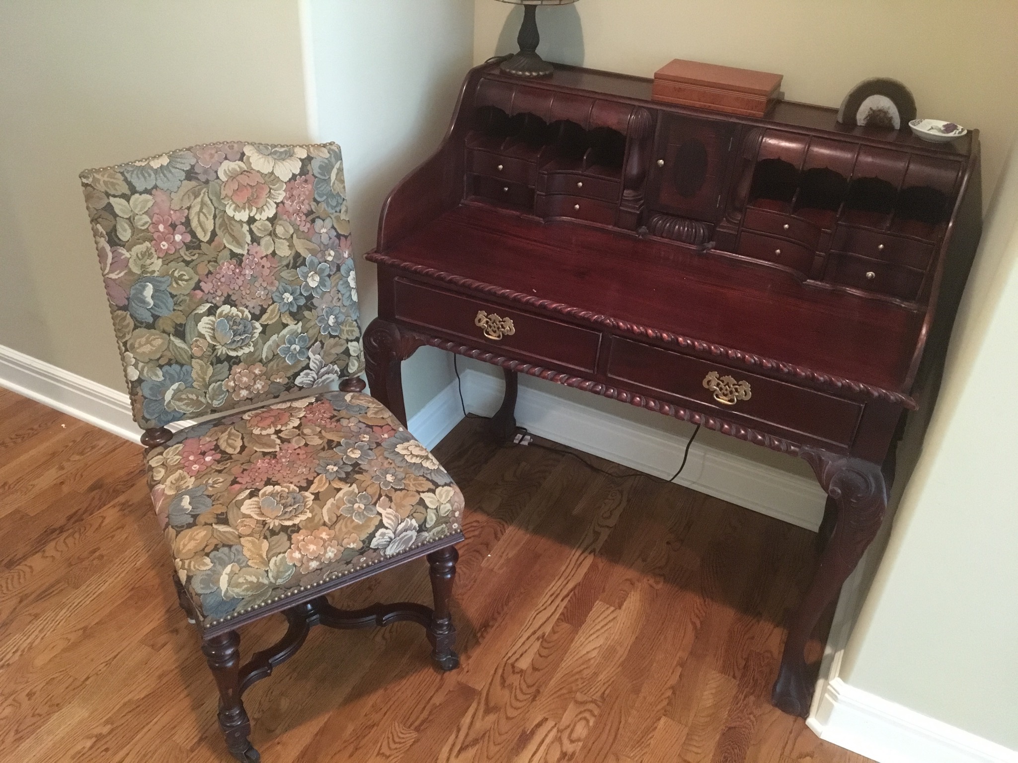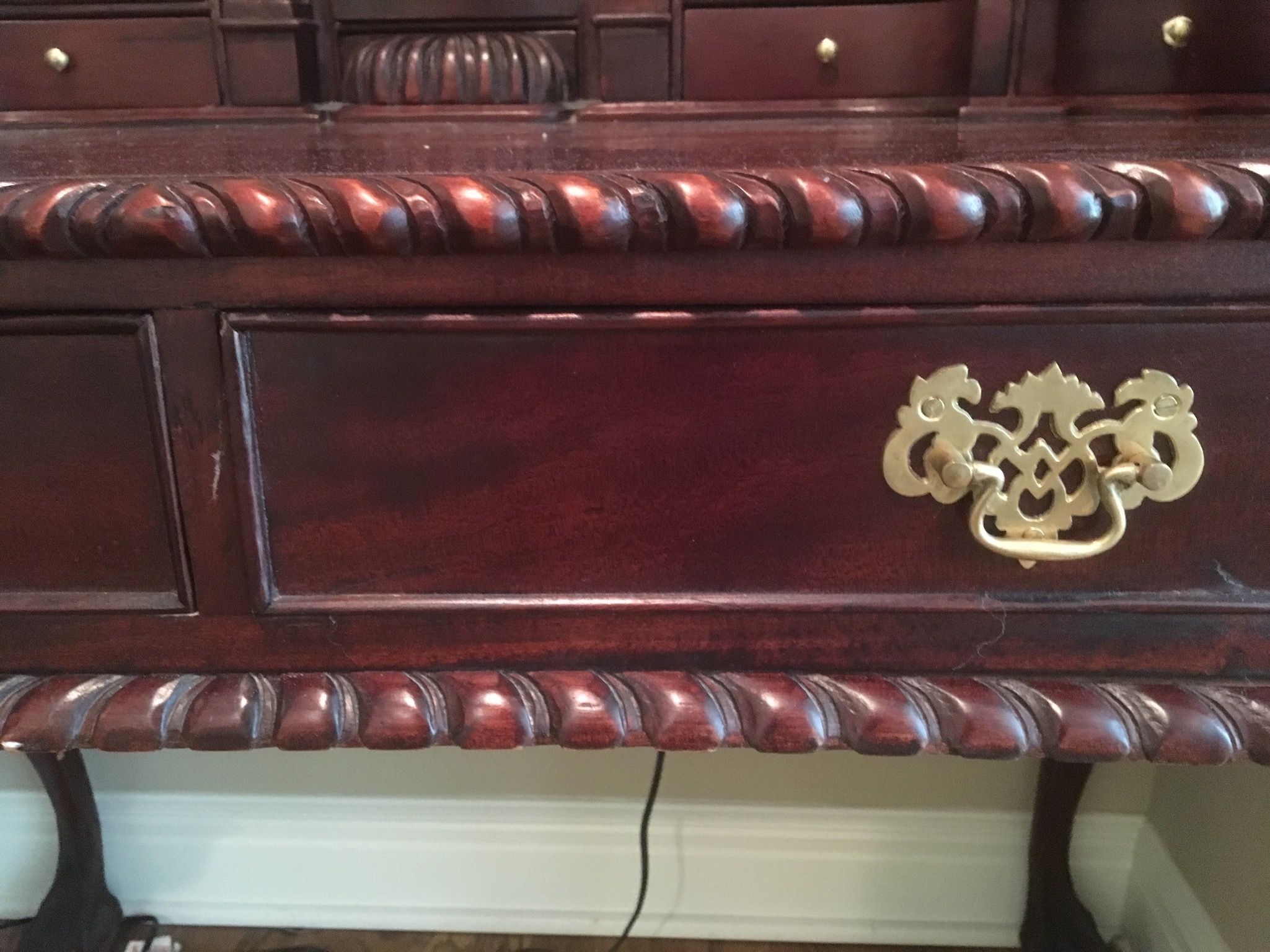 Beeeeautiful dark wood dining table with 2 leaves – 8 chairs and matching 6 drawer credenza/buffet, sweet fold down writing desk and an “aww, look at that” charming oriental side table …