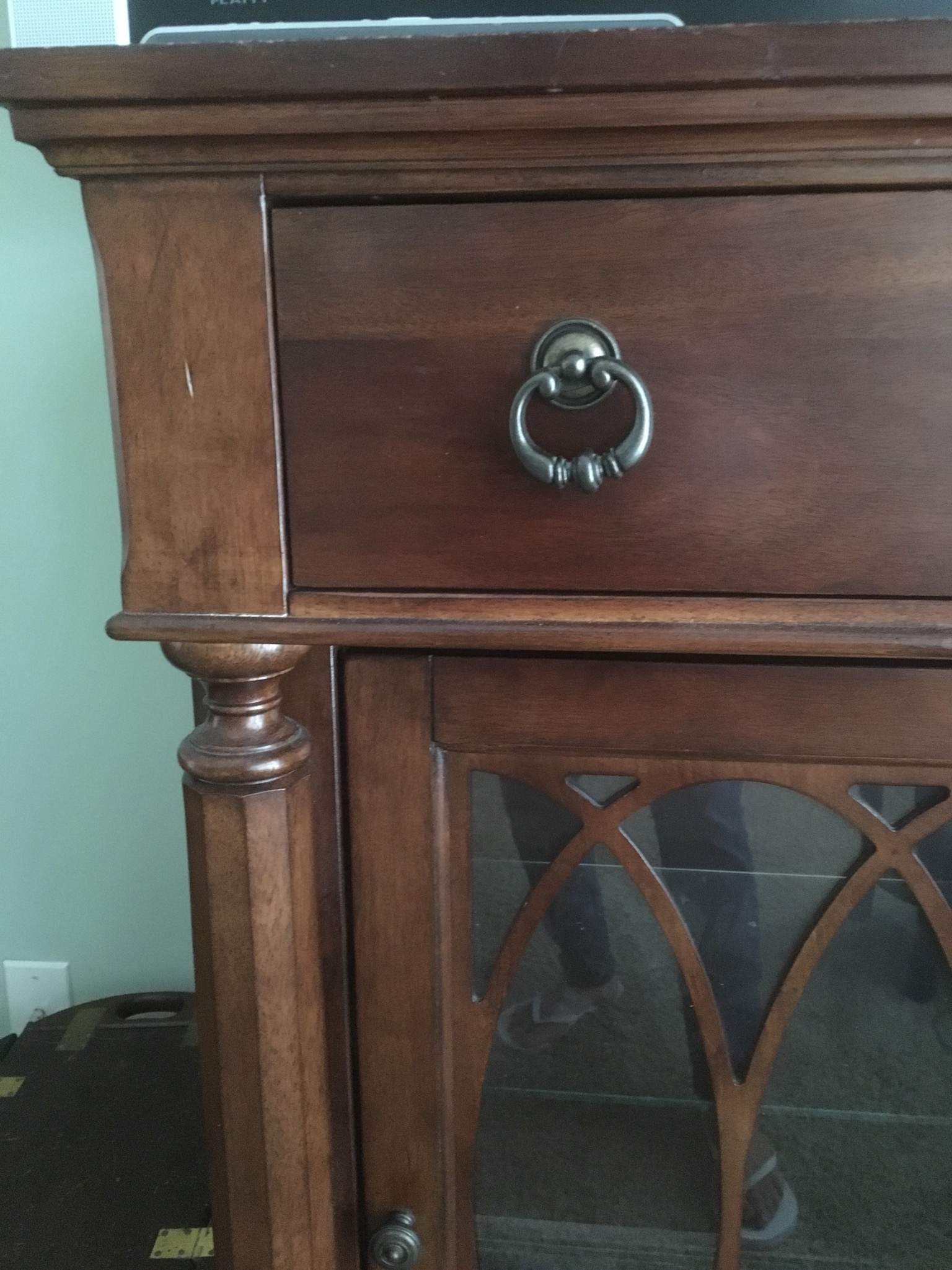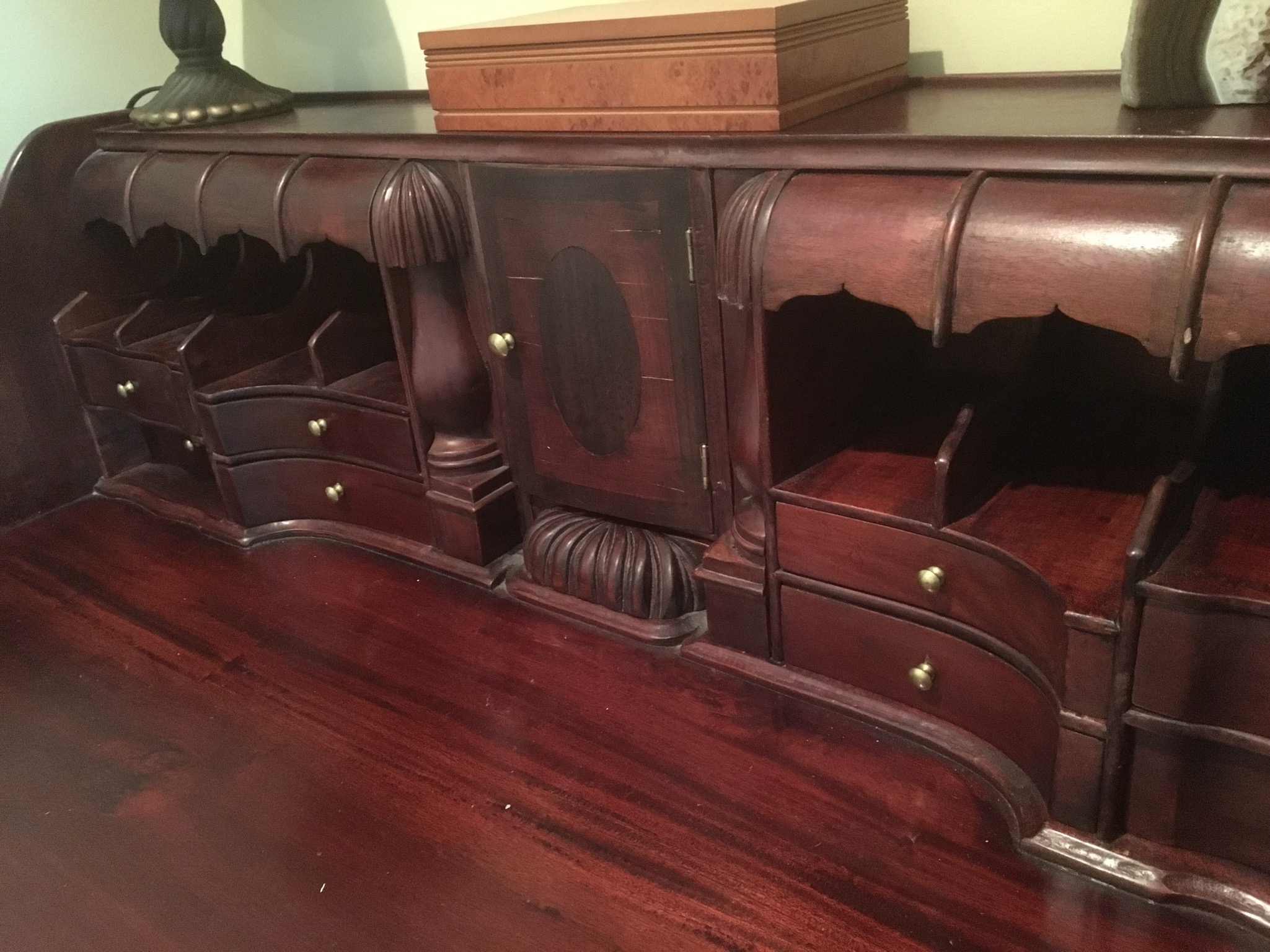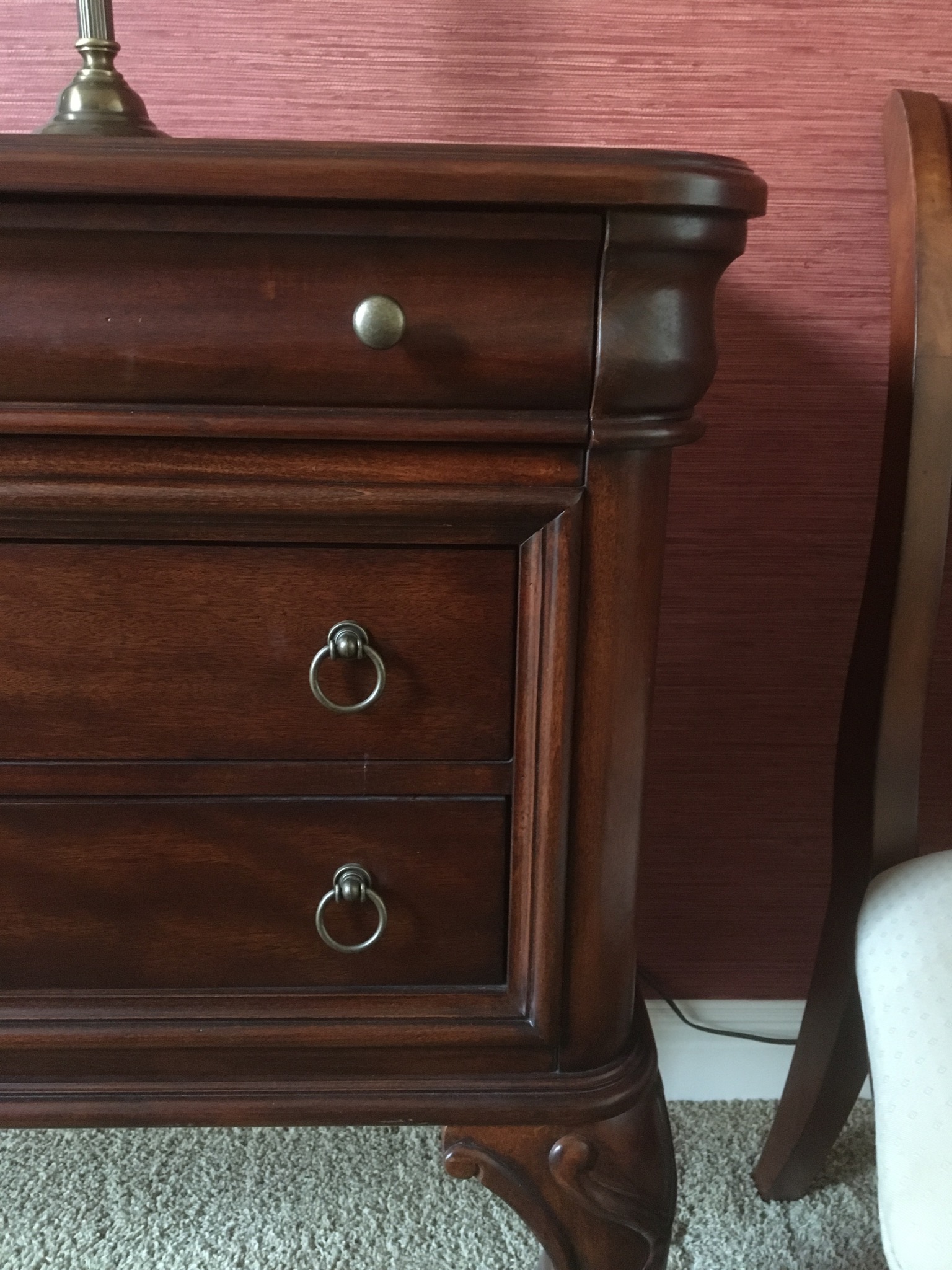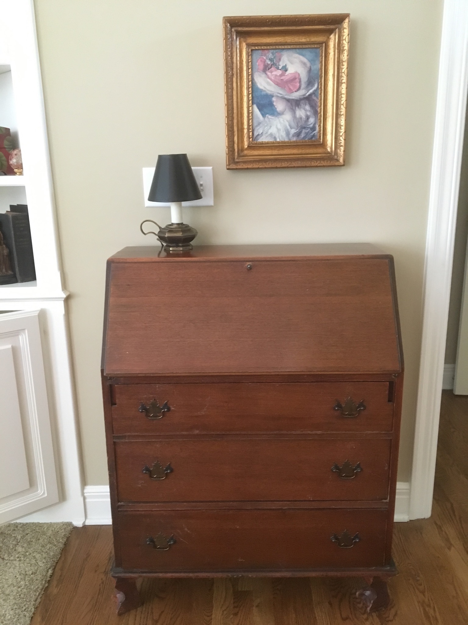 Beeeeautiful dark wood dining table with 2 leaves – 8 chairs and matching 6 drawer credenza/buffet, sweet fold down writing desk and an “aww, look at that” charming oriental side table …