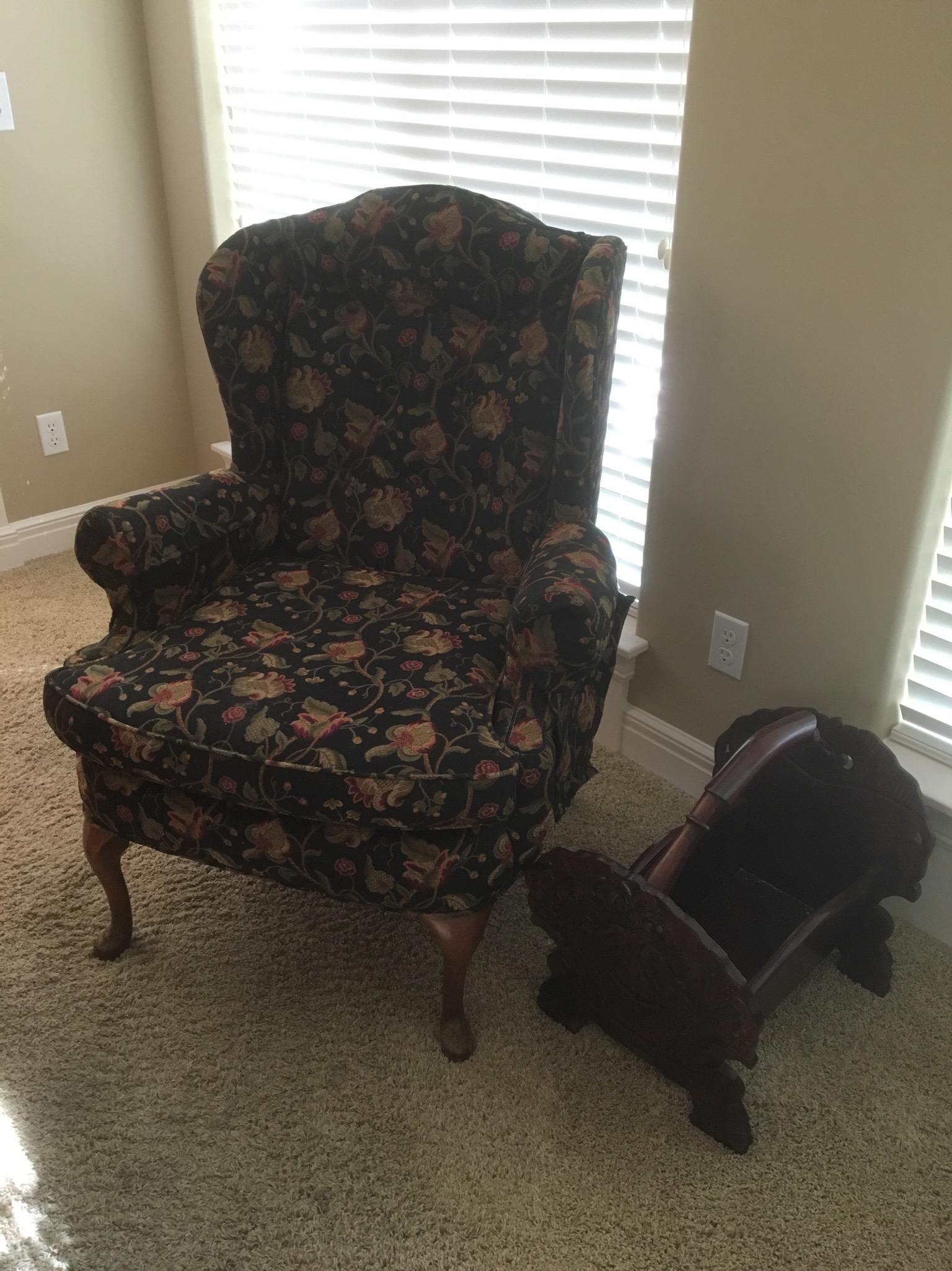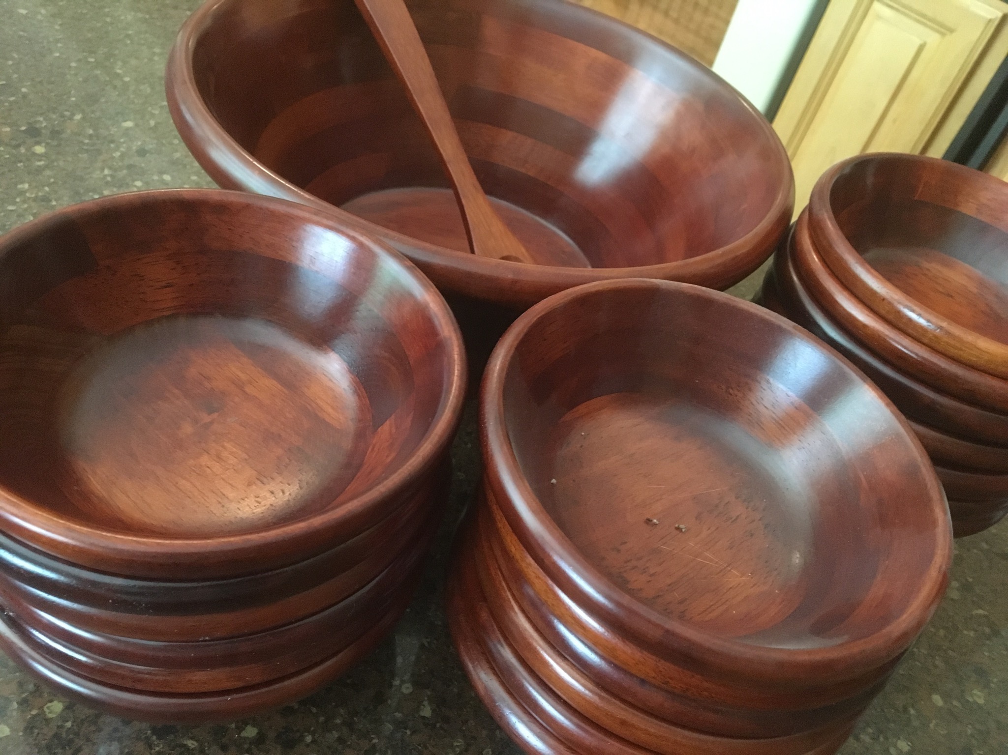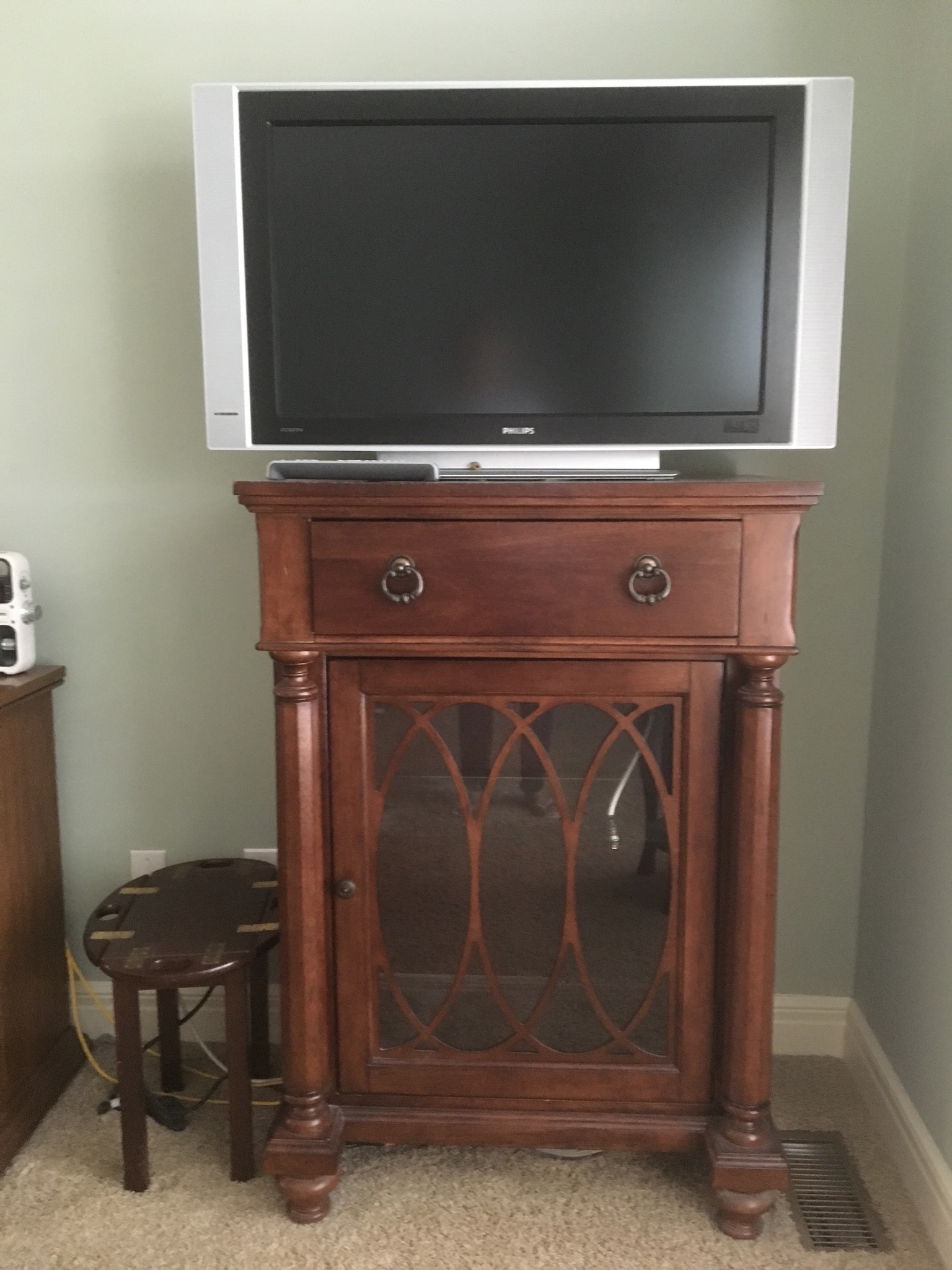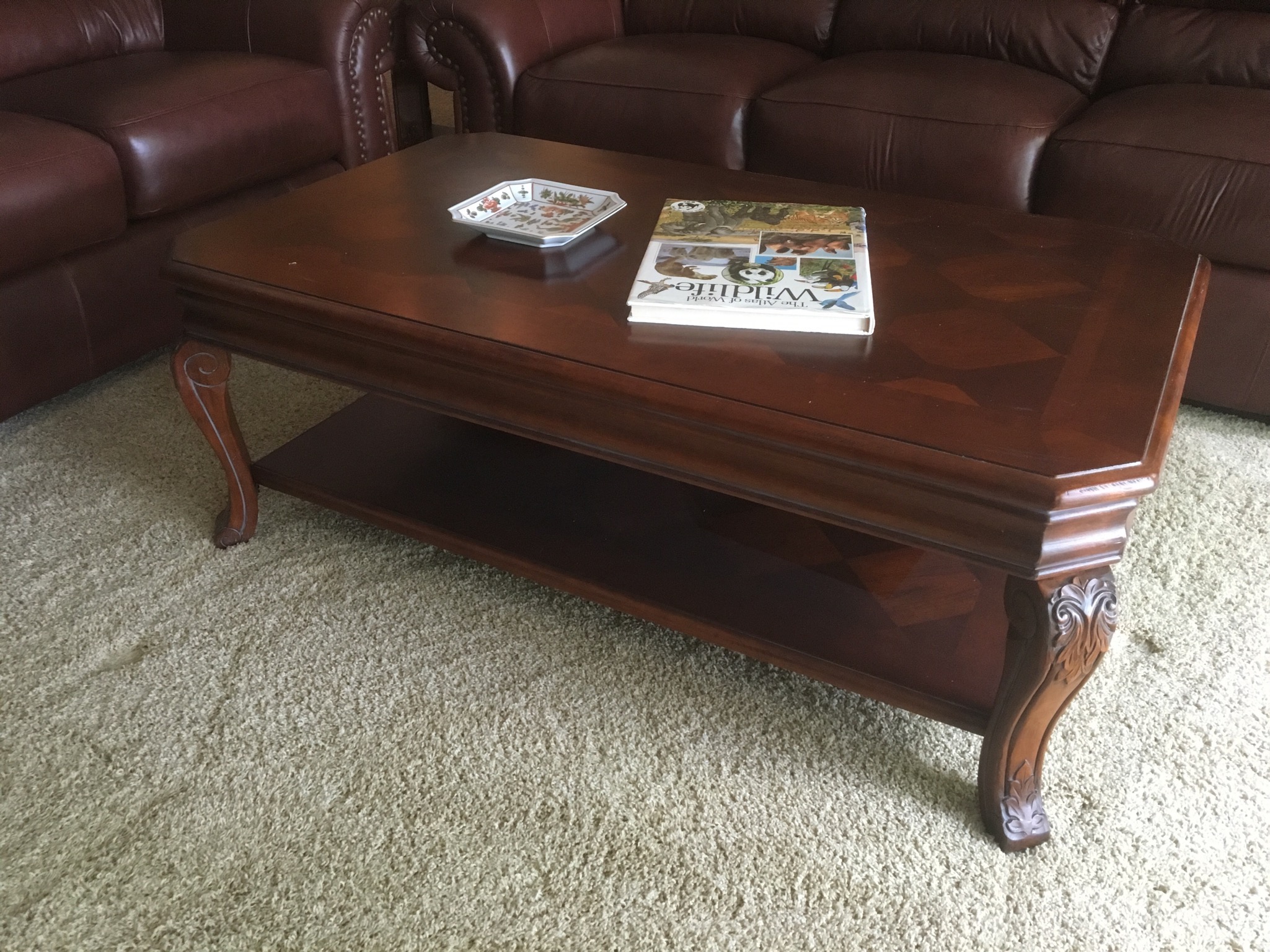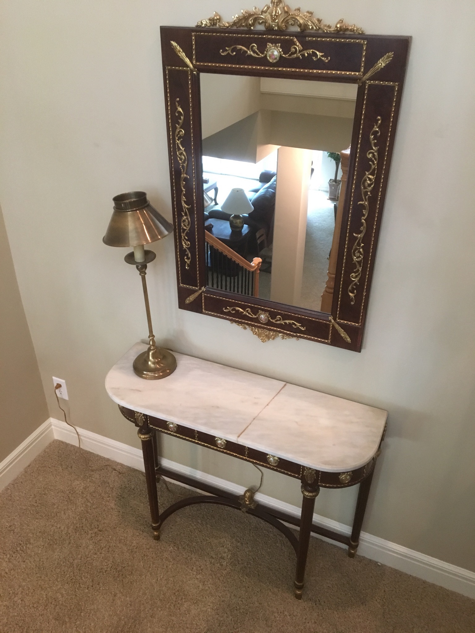 Beeeeautiful dark wood dining table with 2 leaves – 8 chairs and matching 6 drawer credenza/buffet, sweet fold down writing desk and an “aww, look at that” charming oriental side table …