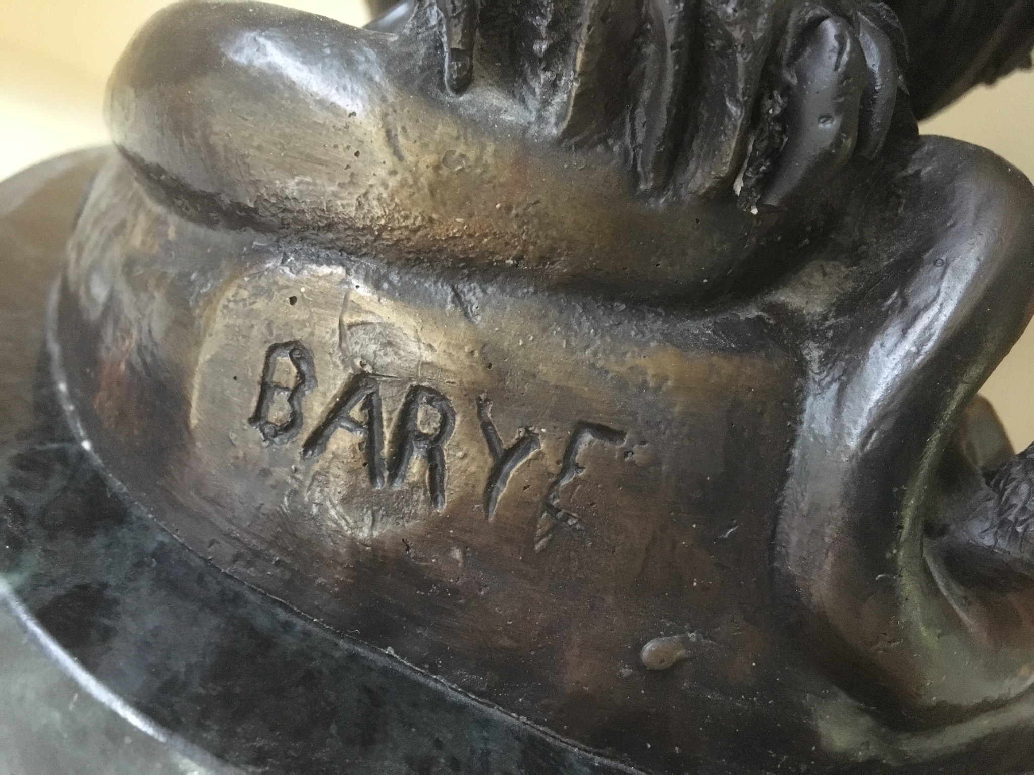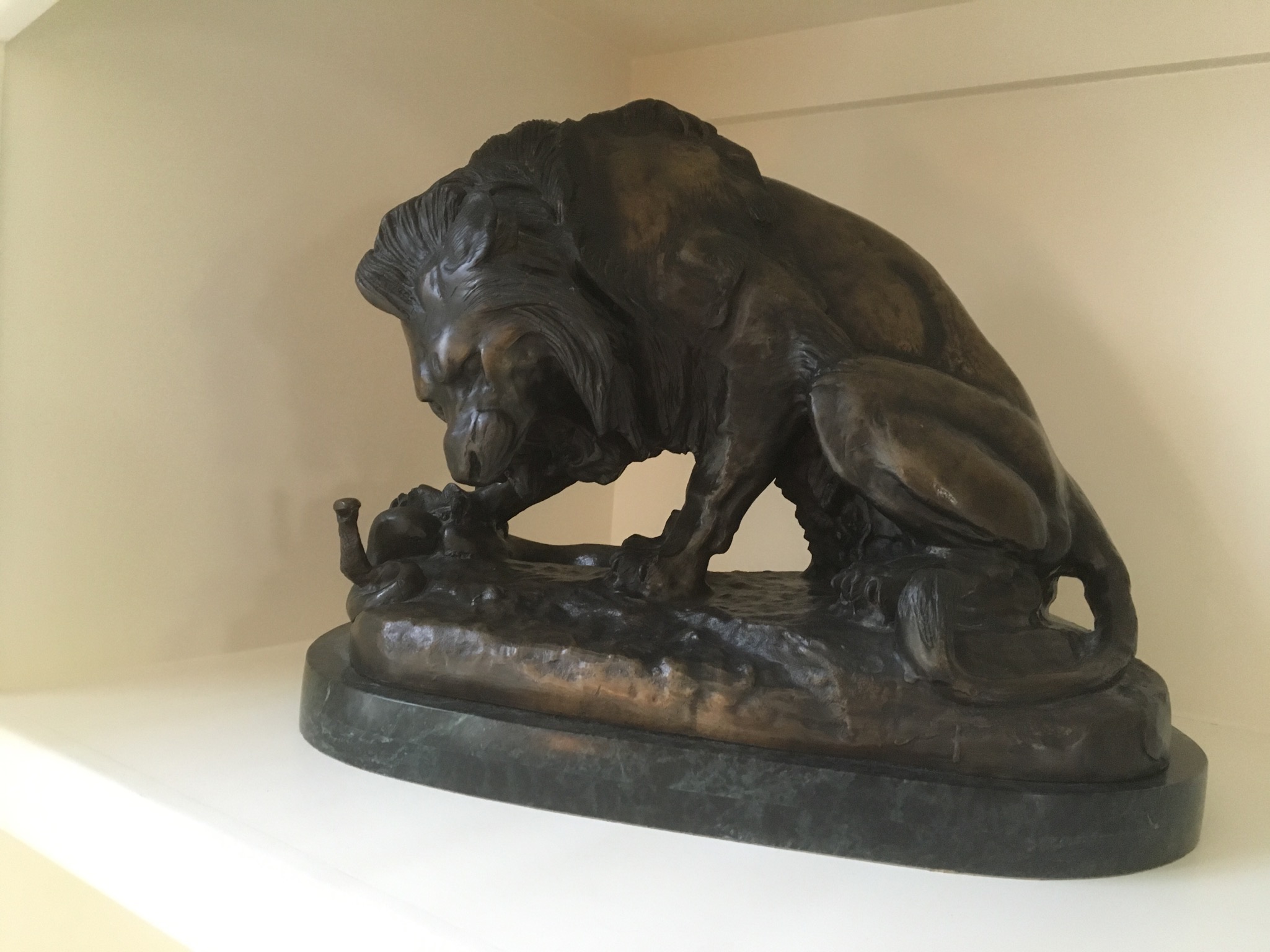 A commanding Antoine-Lois Barye (French 1795-1875) bronze depicting a lion and his dinner titled “Lion and Serpent” or “Lion Au Serpent” … bein’ French and all …
