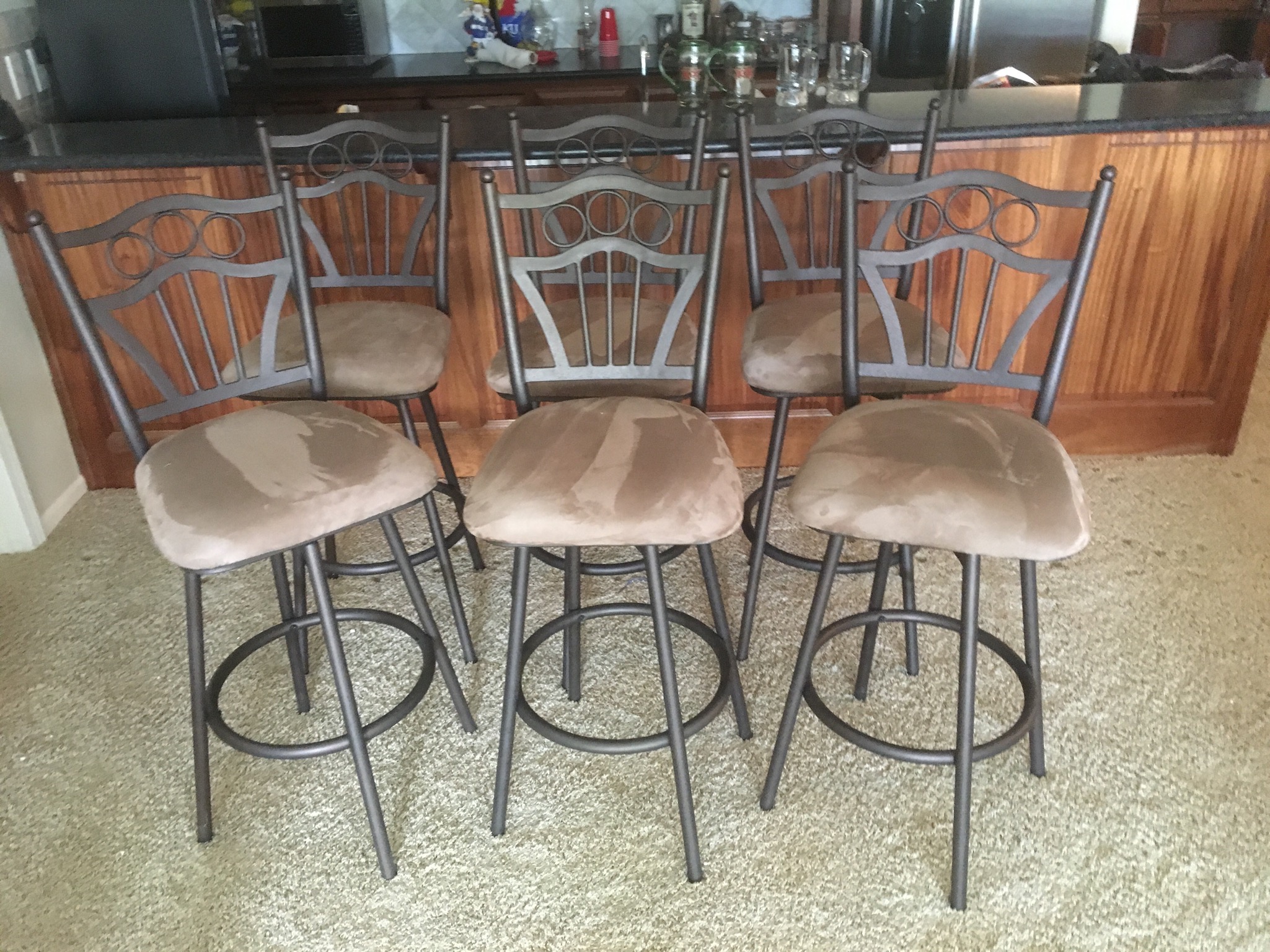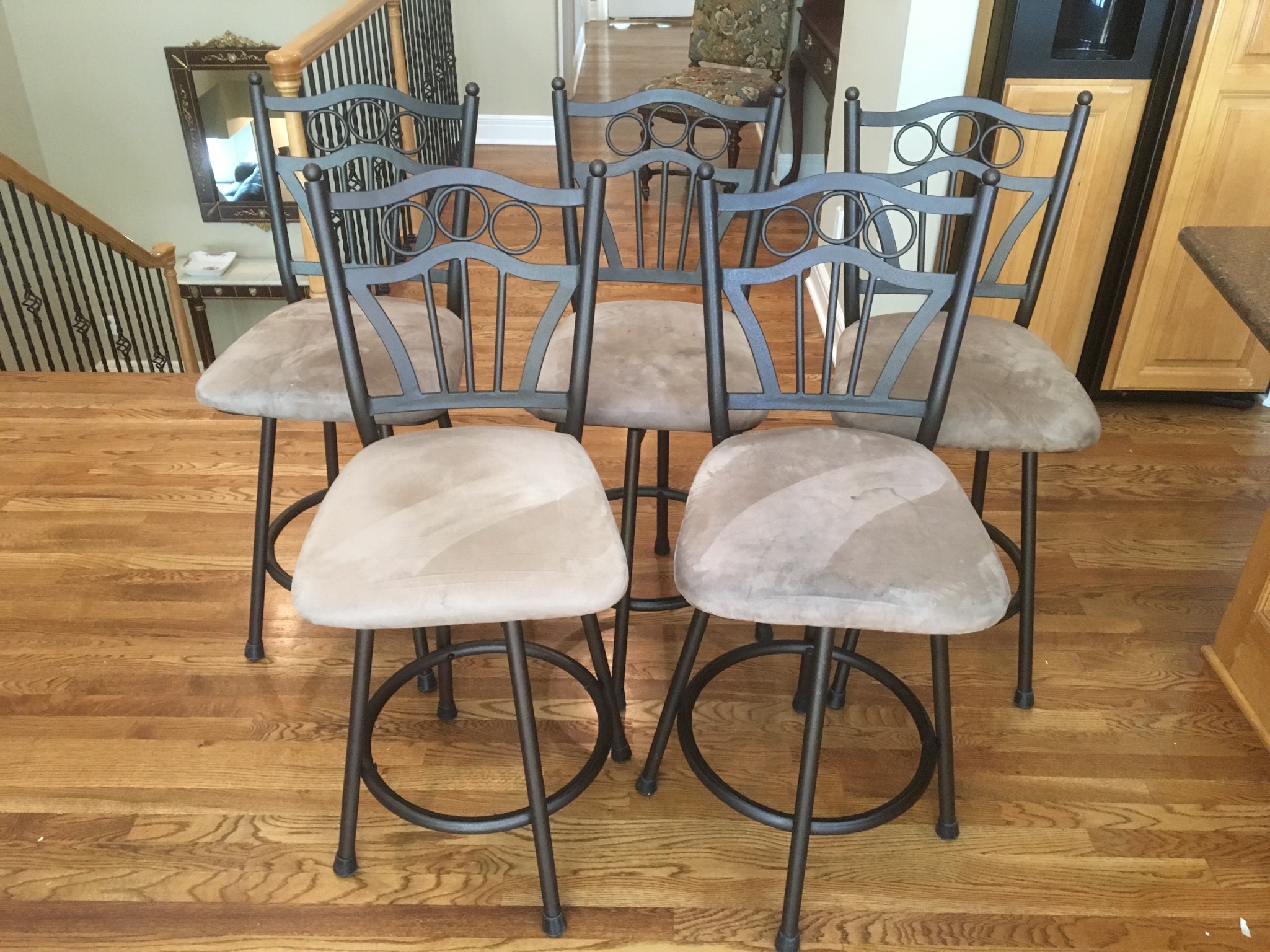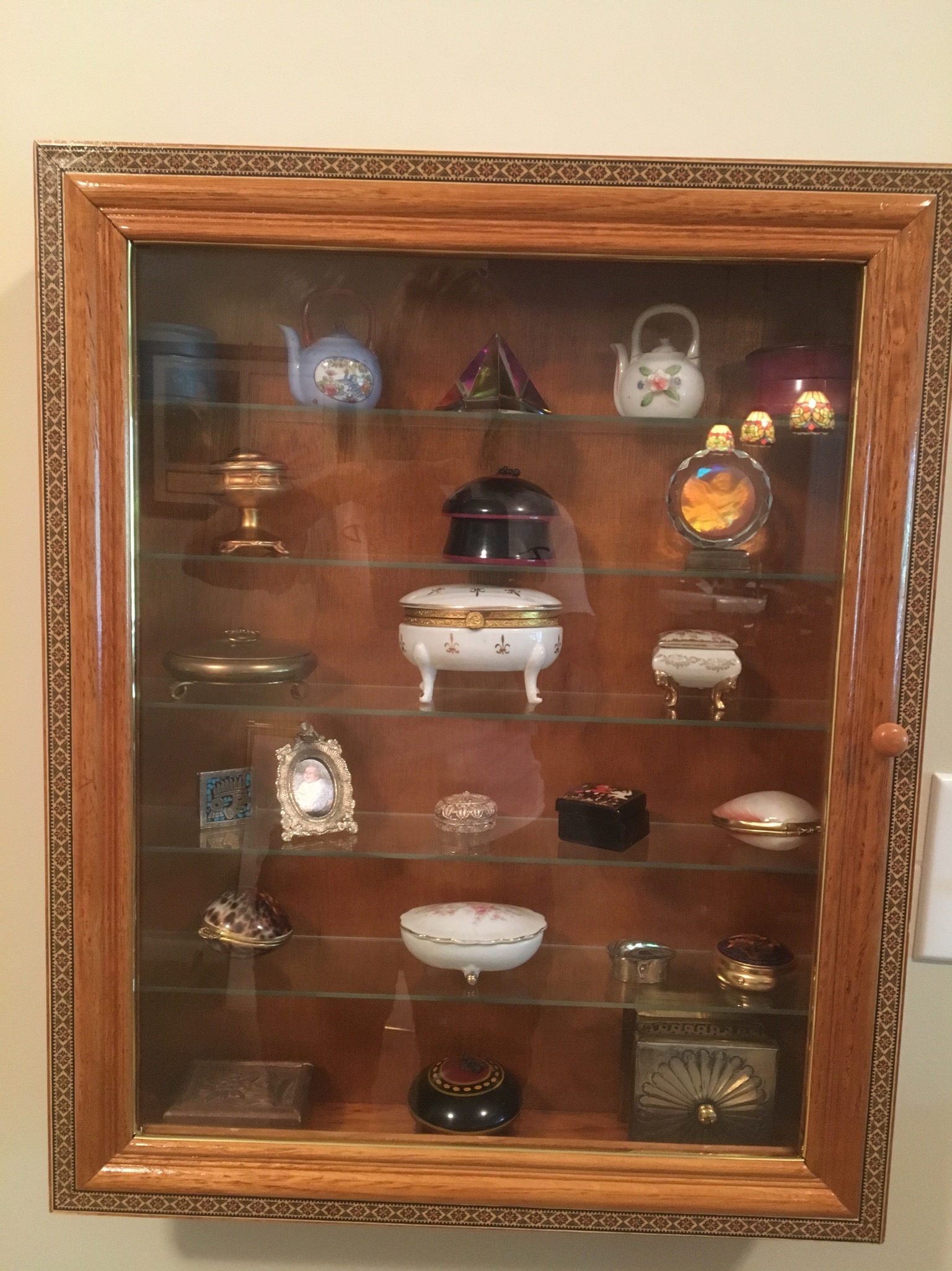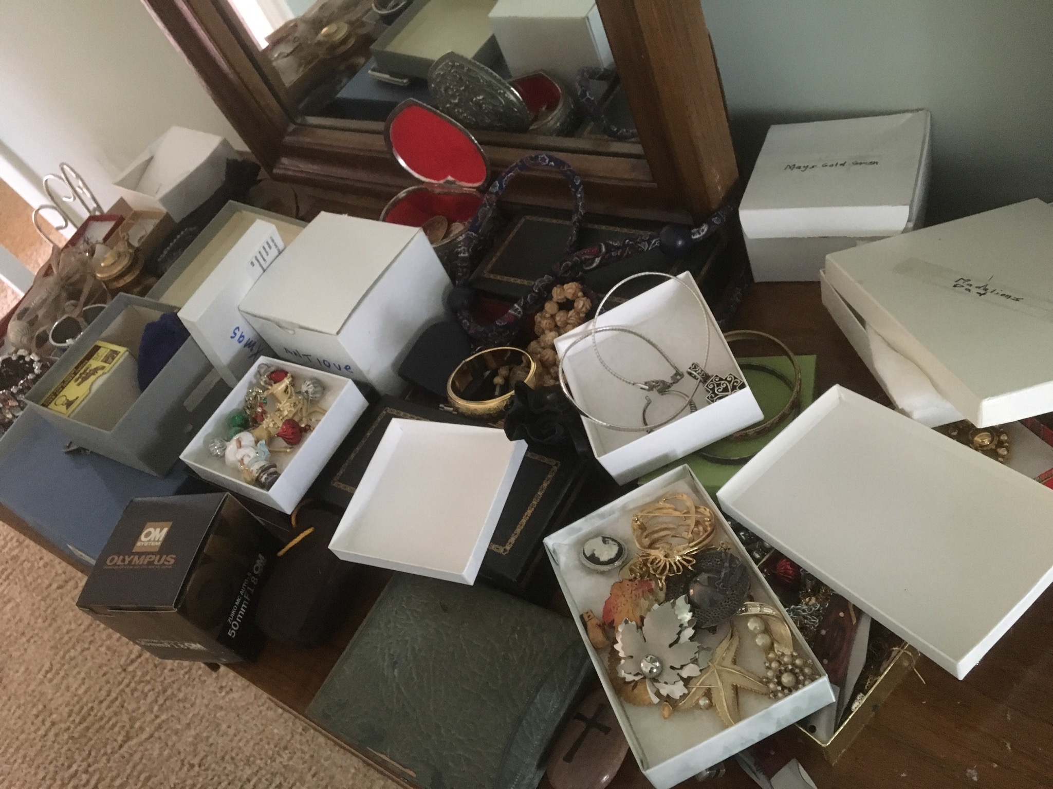 Several medium antique tables and chests, MANY wood/glass display cases, 11 tan seat barstools, marble-top slender wall table (marble is cracked, fyi), wood floor mirror …