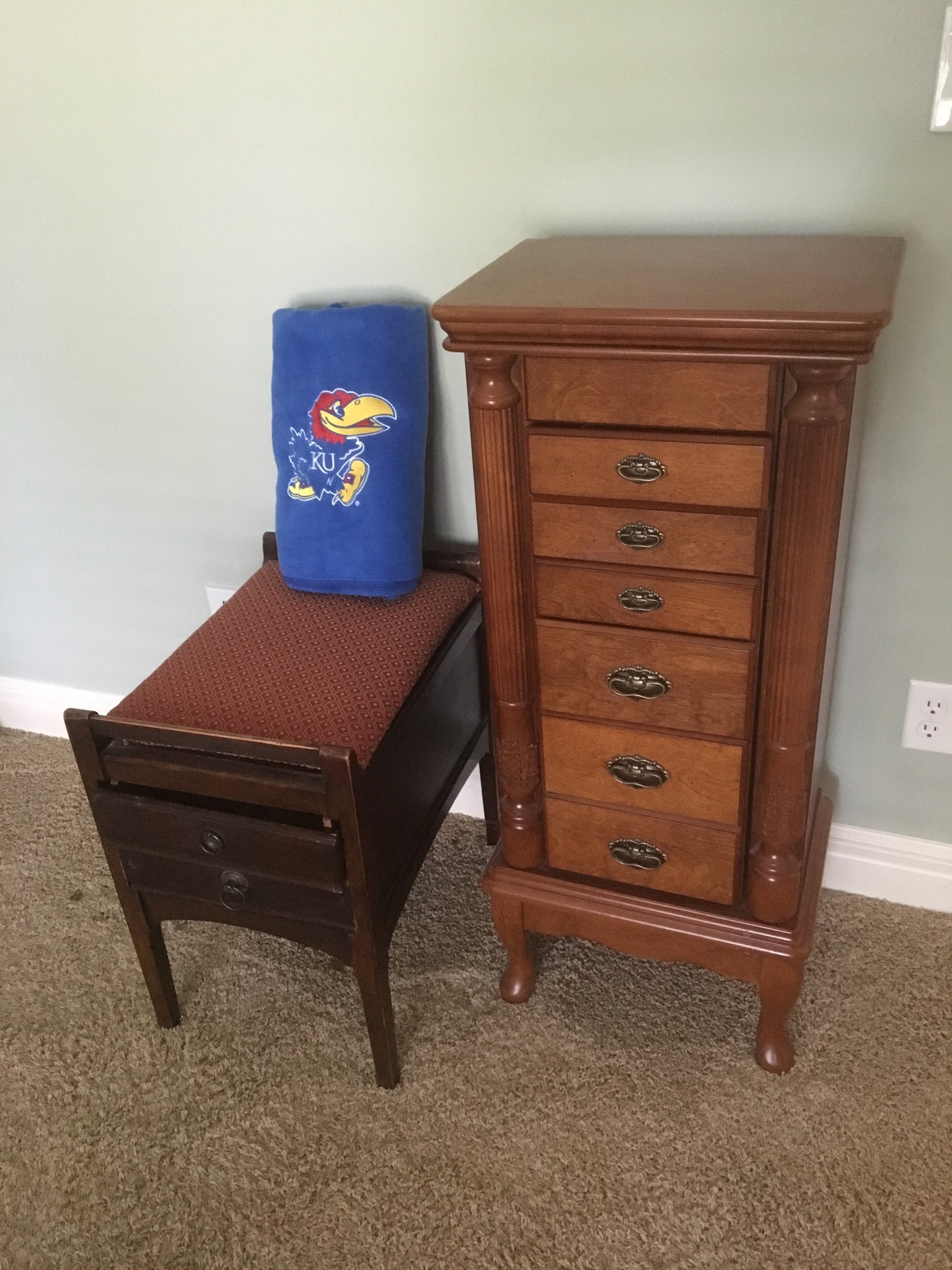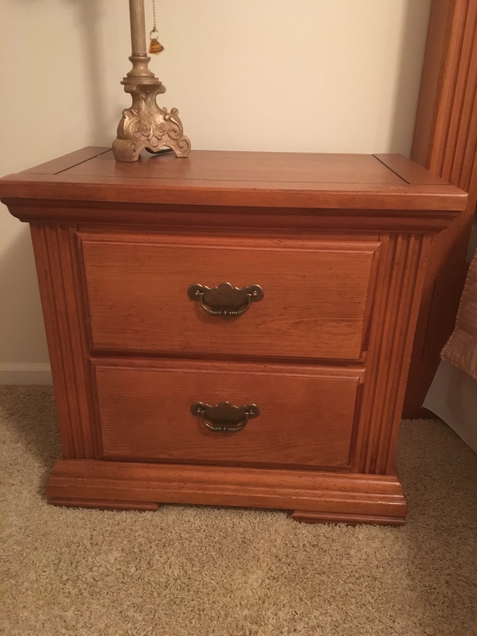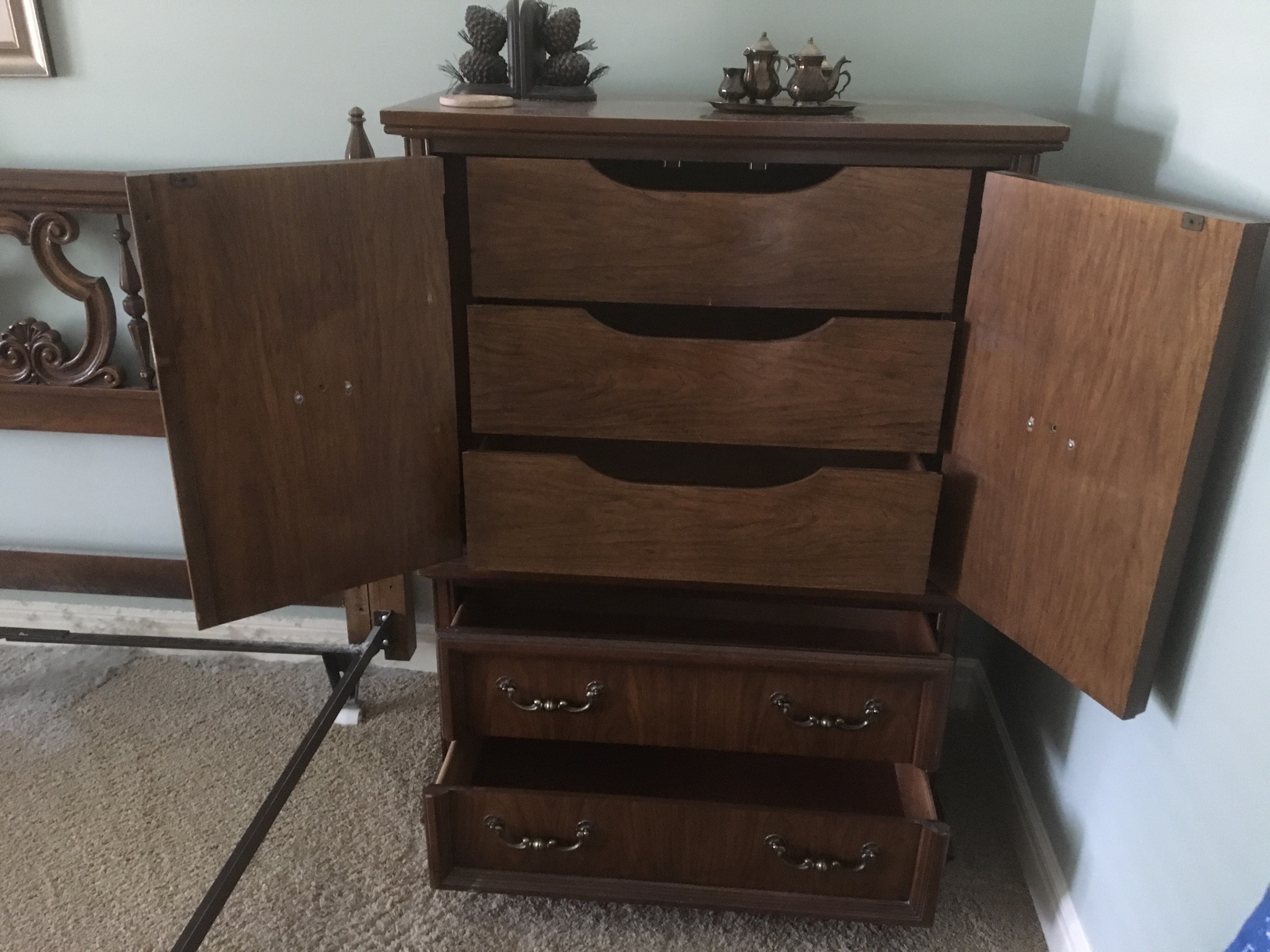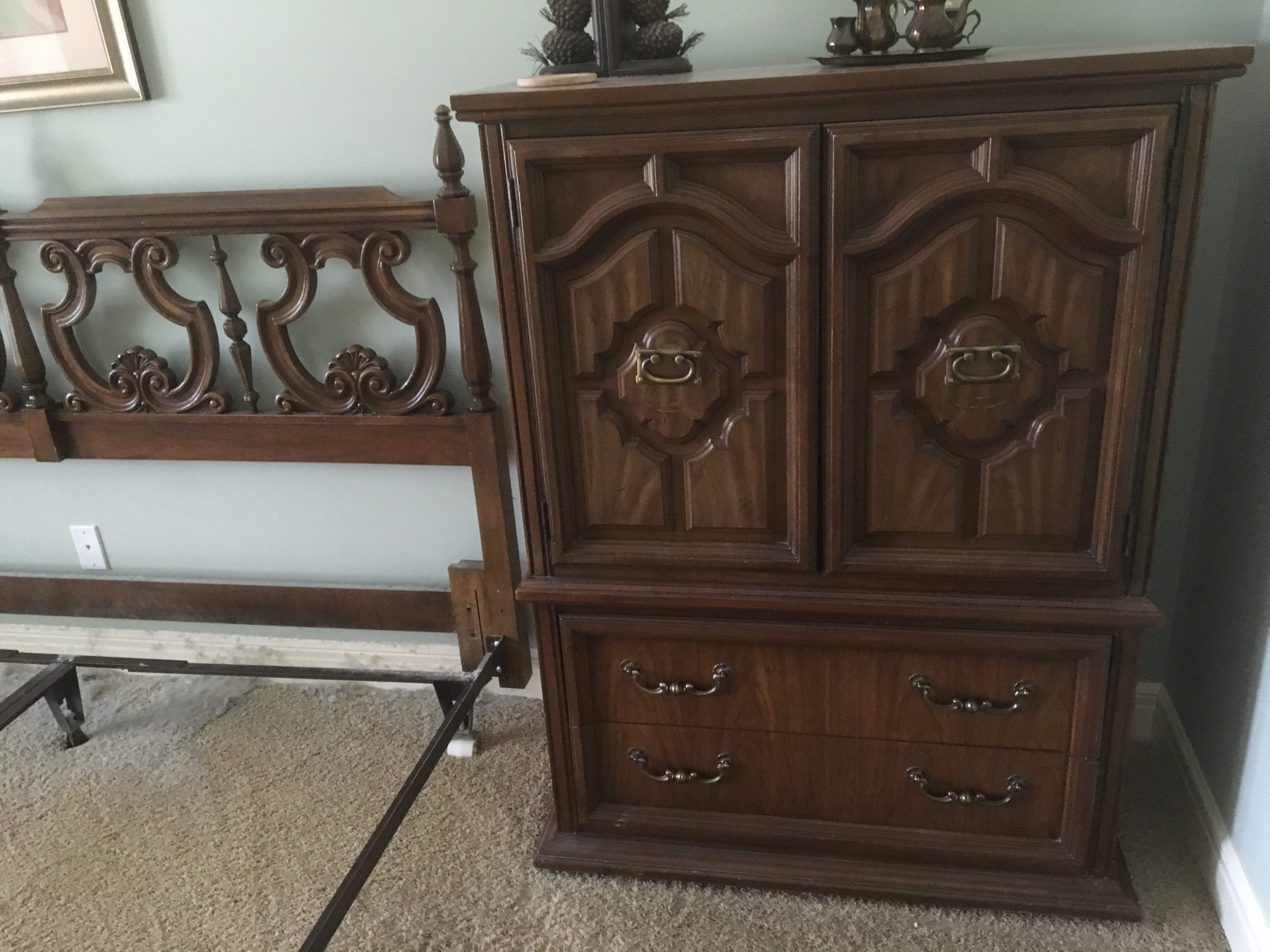 Unique full size oak bed, pair of oak 2-drawer night stands, 7-drawer jewelry chest, Mediterranean style wardrobe and matching dresser w mirror and headboard …