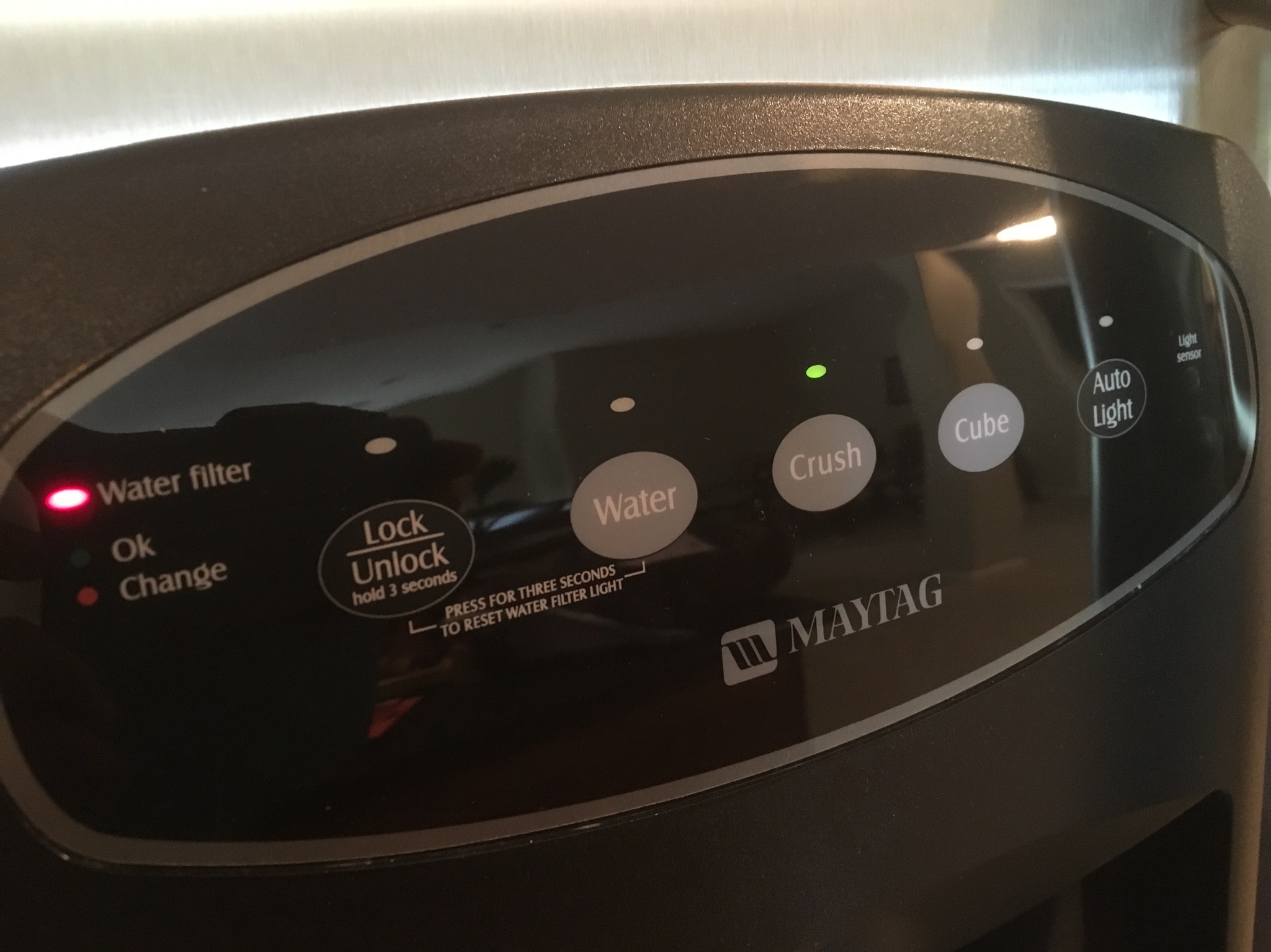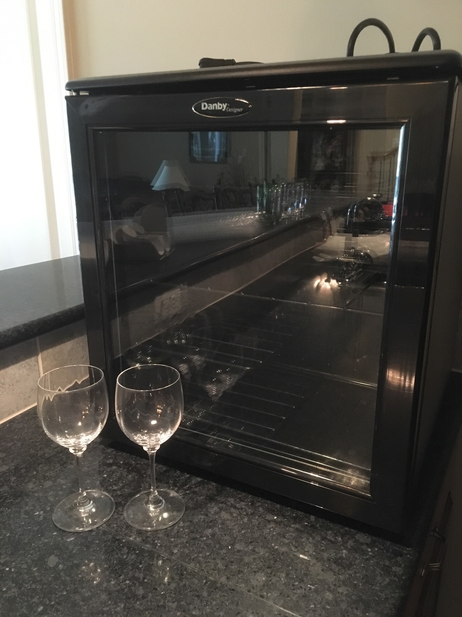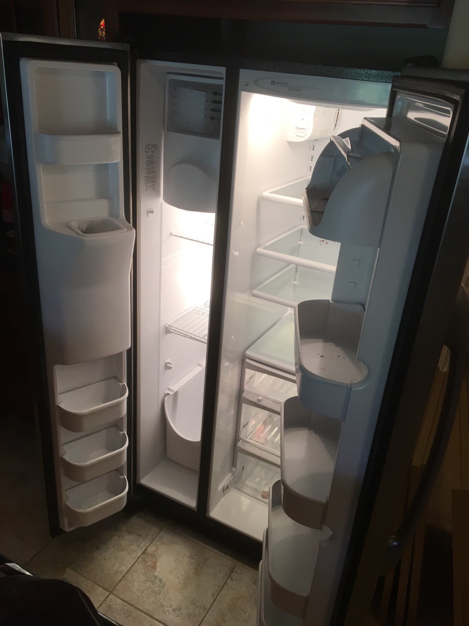 Nice Maytag side by side stainless refrigerator, nice stainless microwave, and a small Danby wine fridge to assure you’ll be lovin’ your Lambrusco and serving the perfect Pinot …