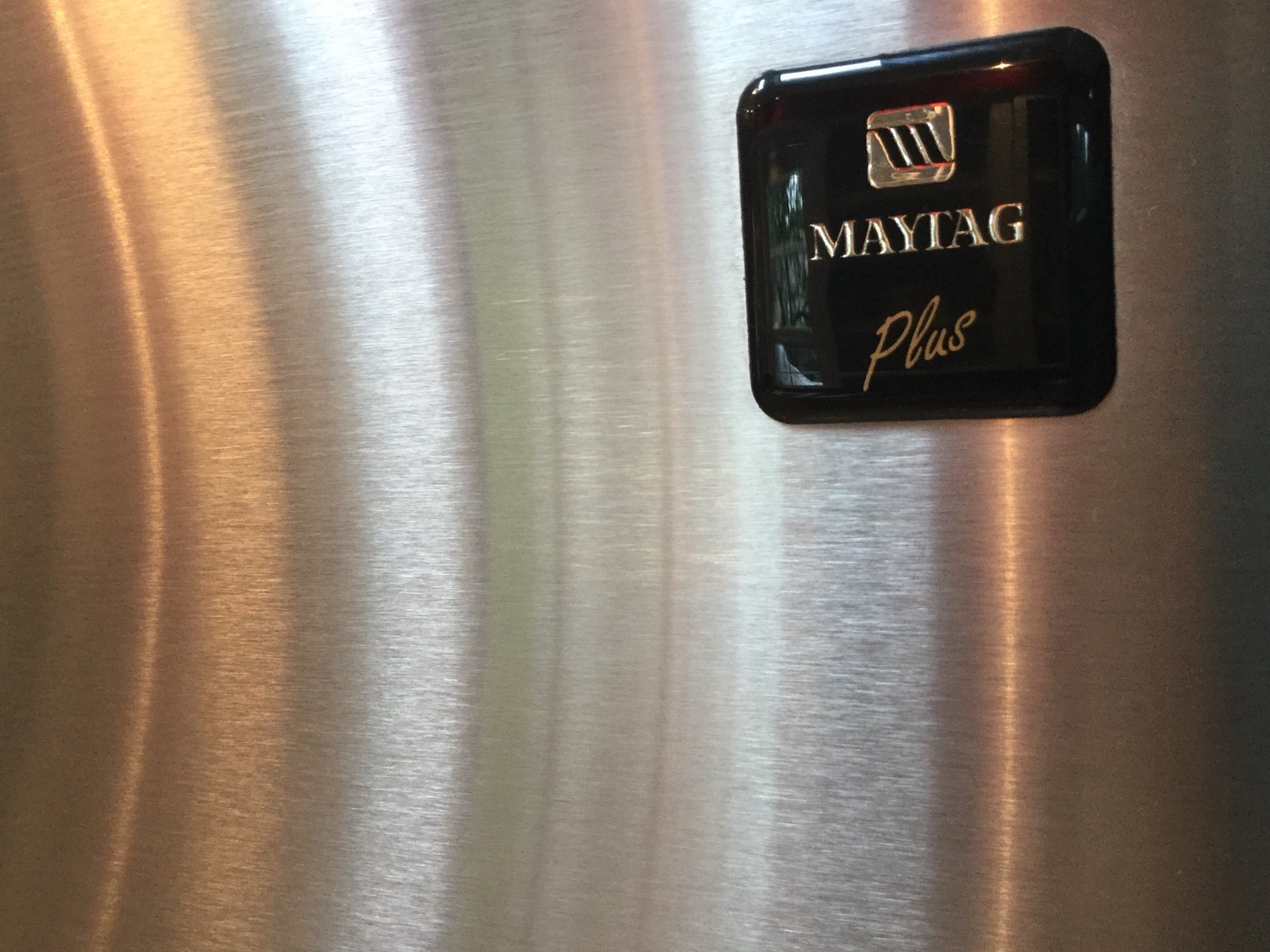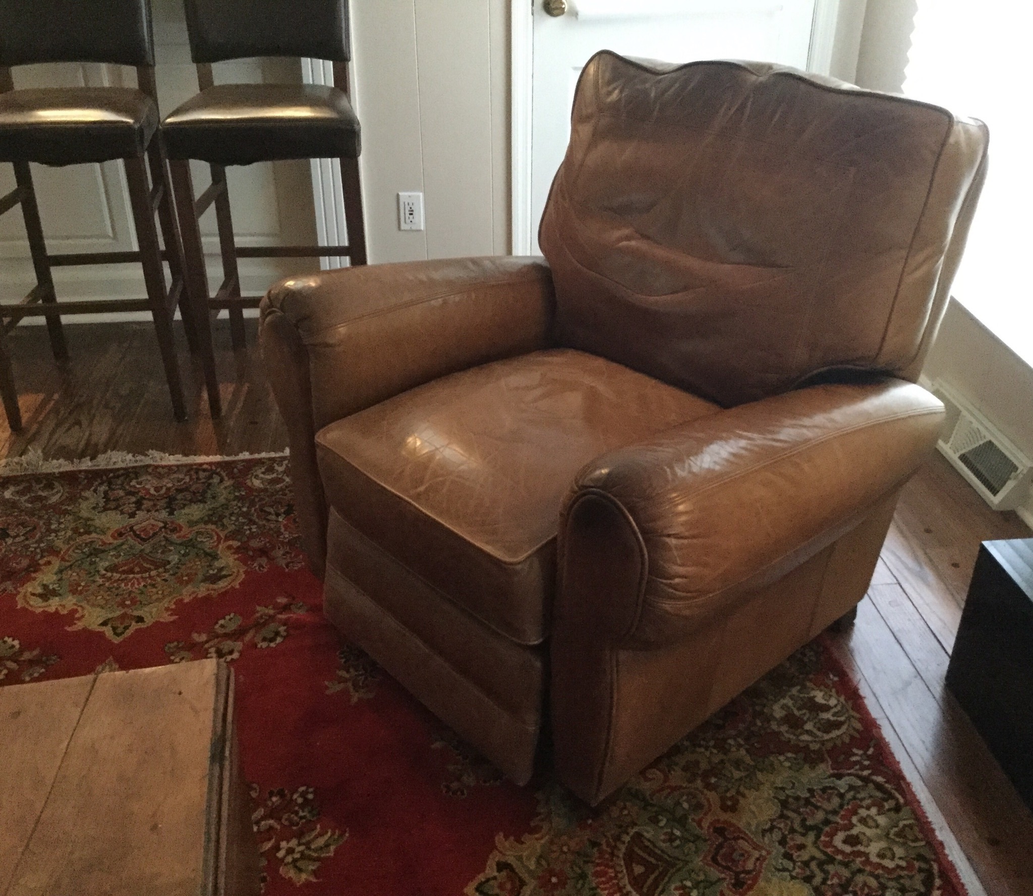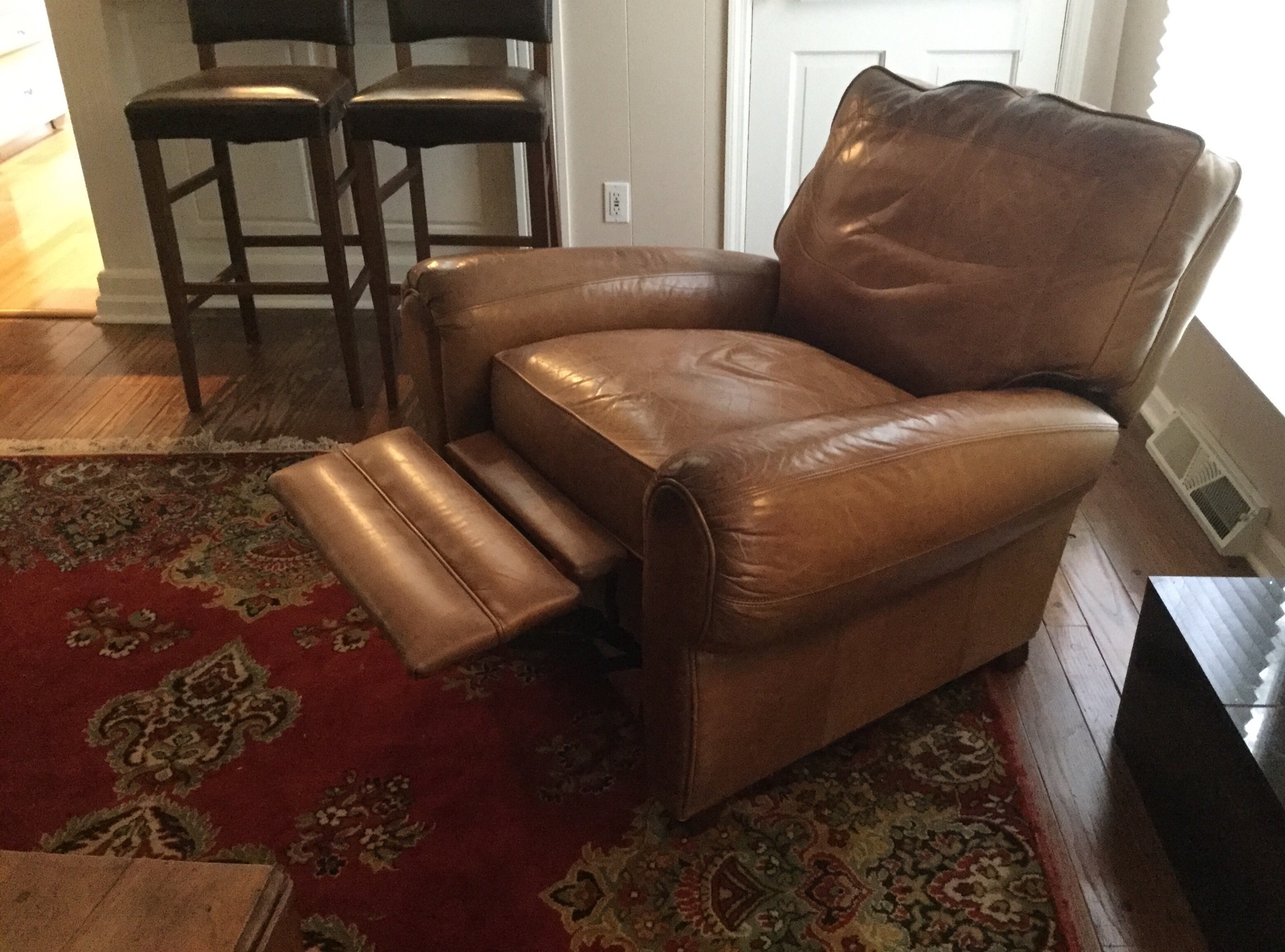 A rich light brown Lane leather reclining club chair, a marshmallow-y deep black leather 3-cush sofa, nice Maytag Plus stainless steel fridge with bottom freezer, Kenmore washer & electric dryer …