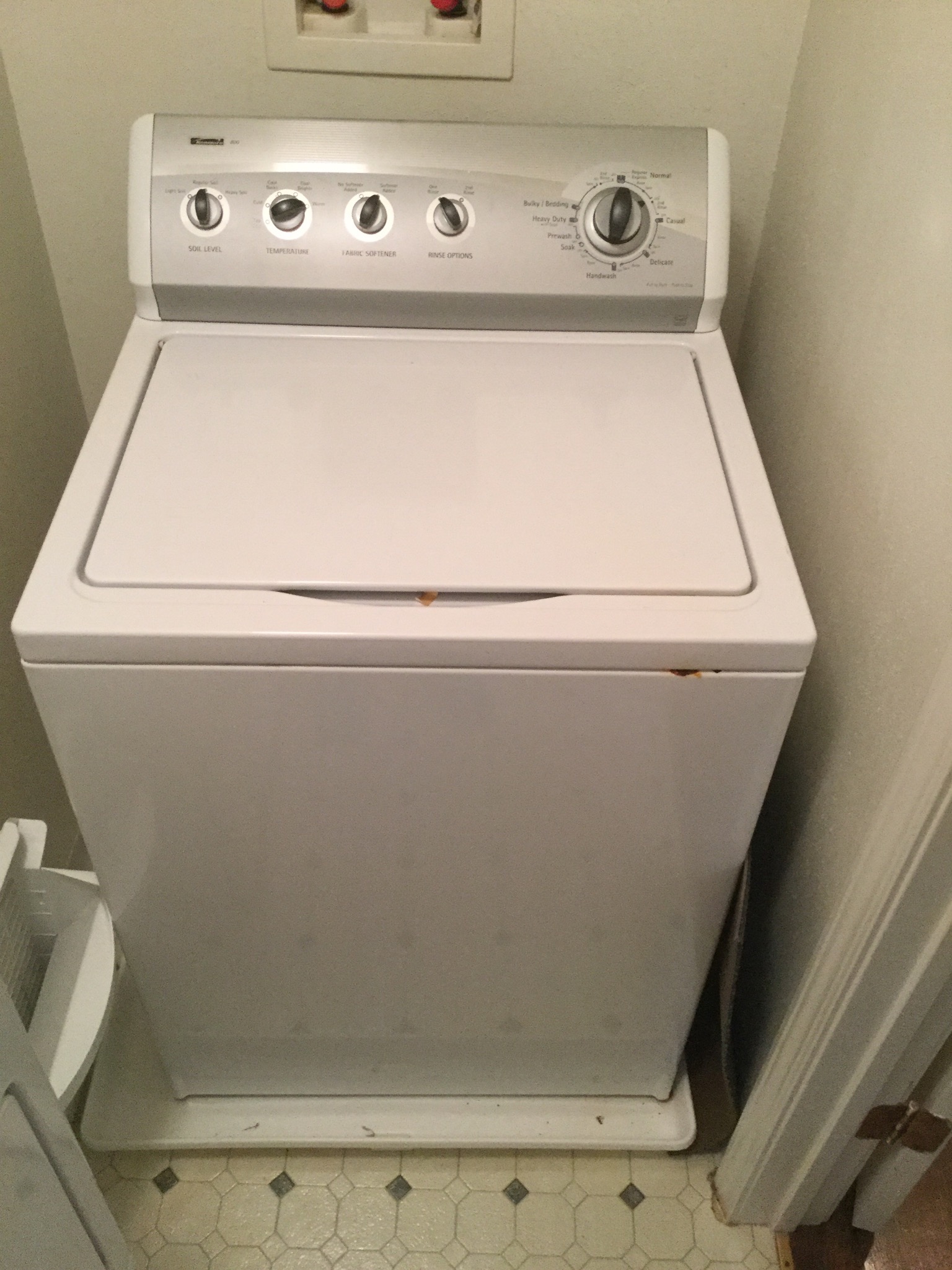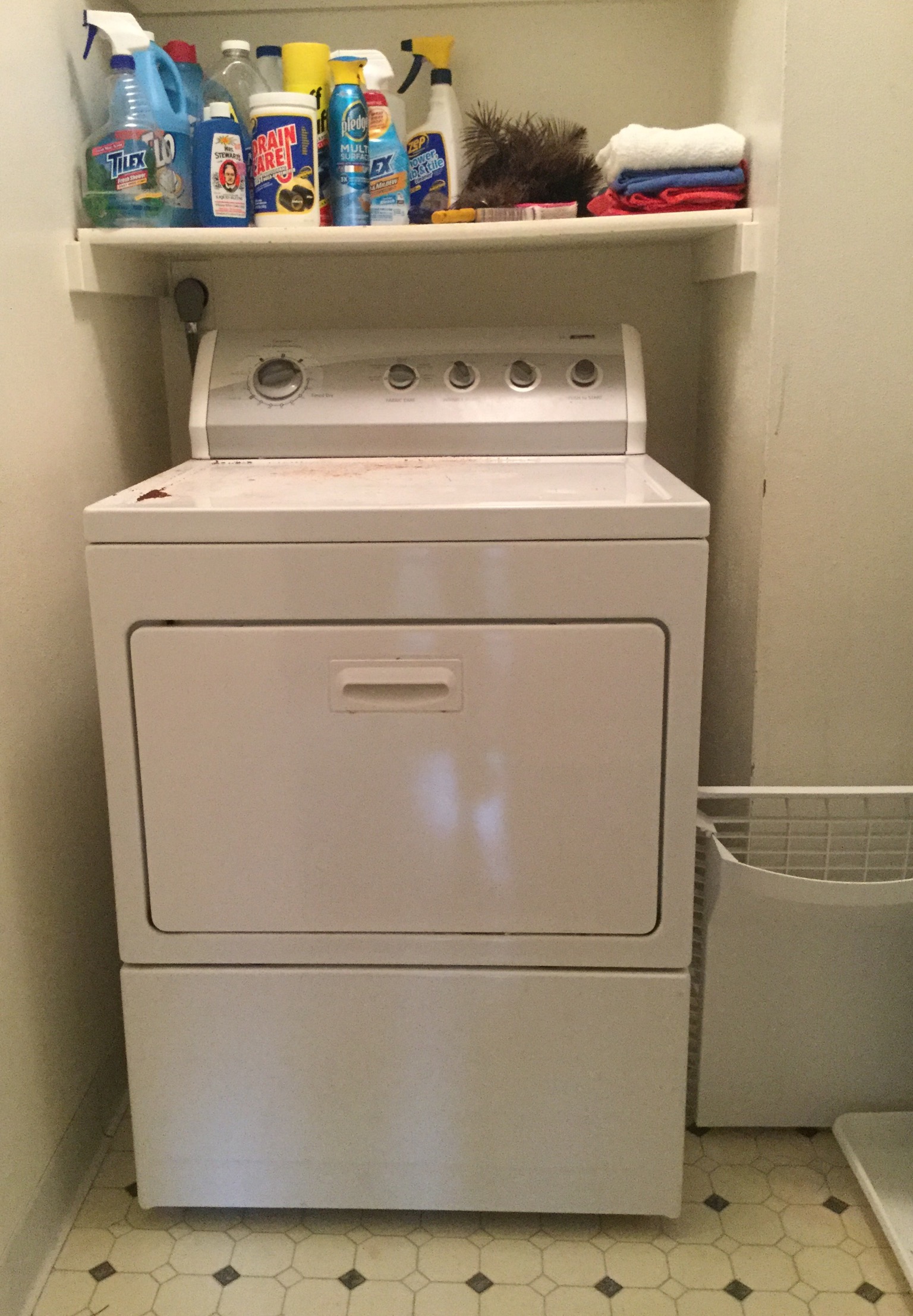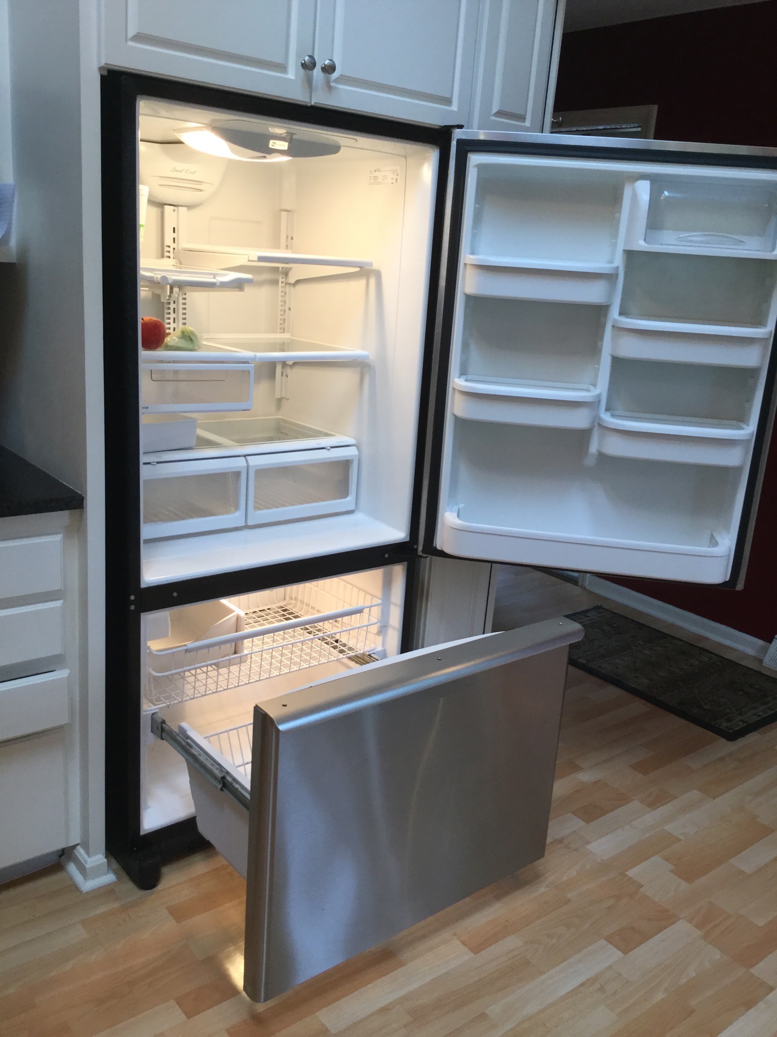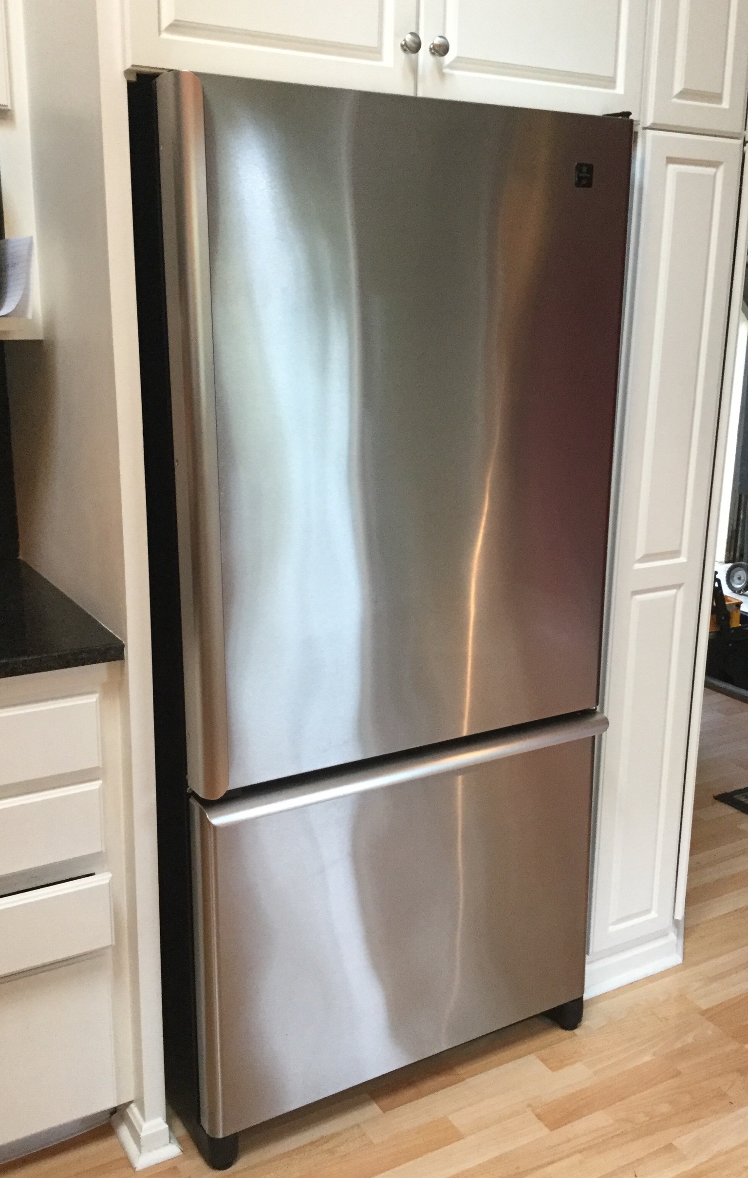 A rich light brown Lane leather reclining club chair, a marshmallow-y deep black leather 3-cush sofa, nice Maytag Plus stainless steel fridge with bottom freezer, Kenmore washer & electric dryer …