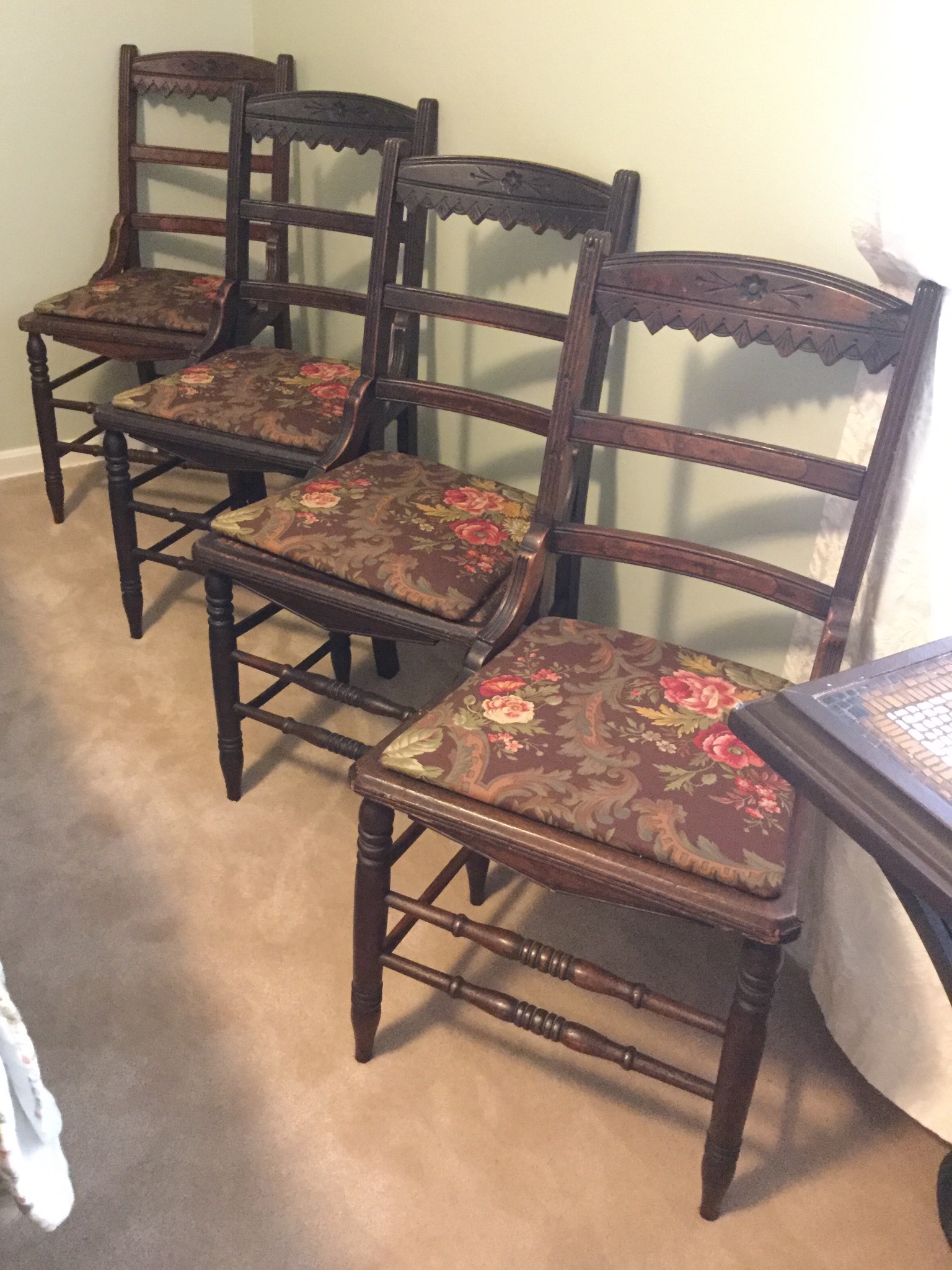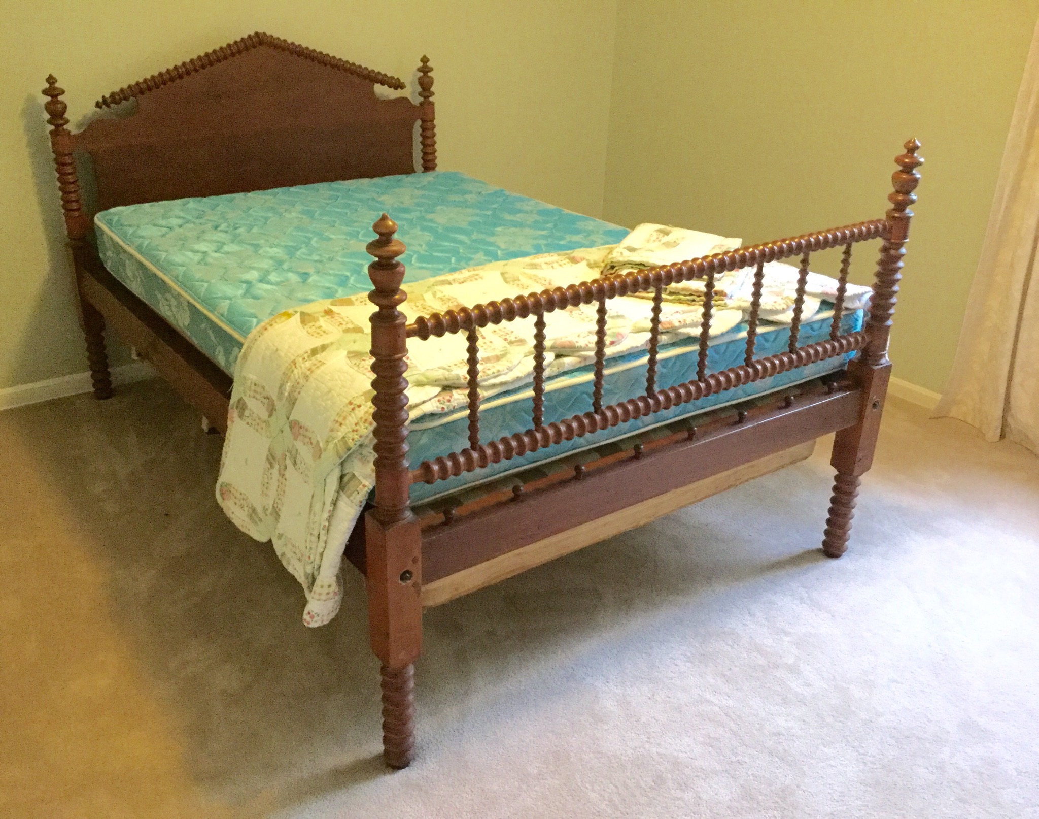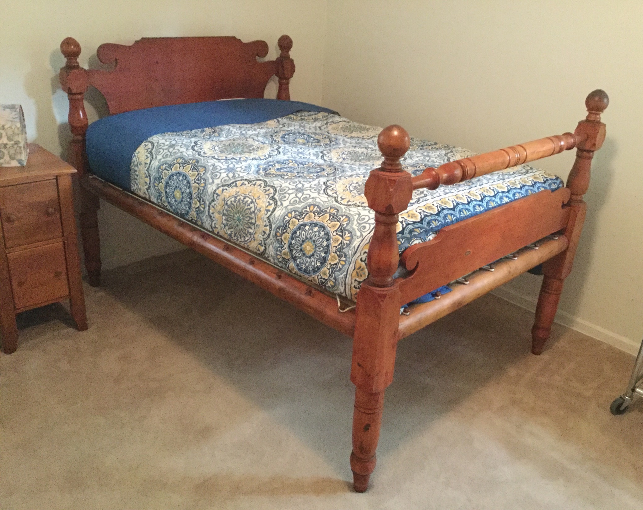 2 of the most unique antique full size beds with darling details, drop side antique coffee table, many barstools (leather and upholstered), nice round antique table, 6 drawer antique chest of drawers …