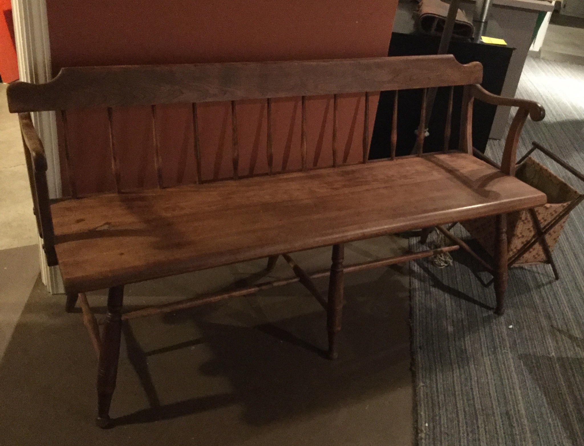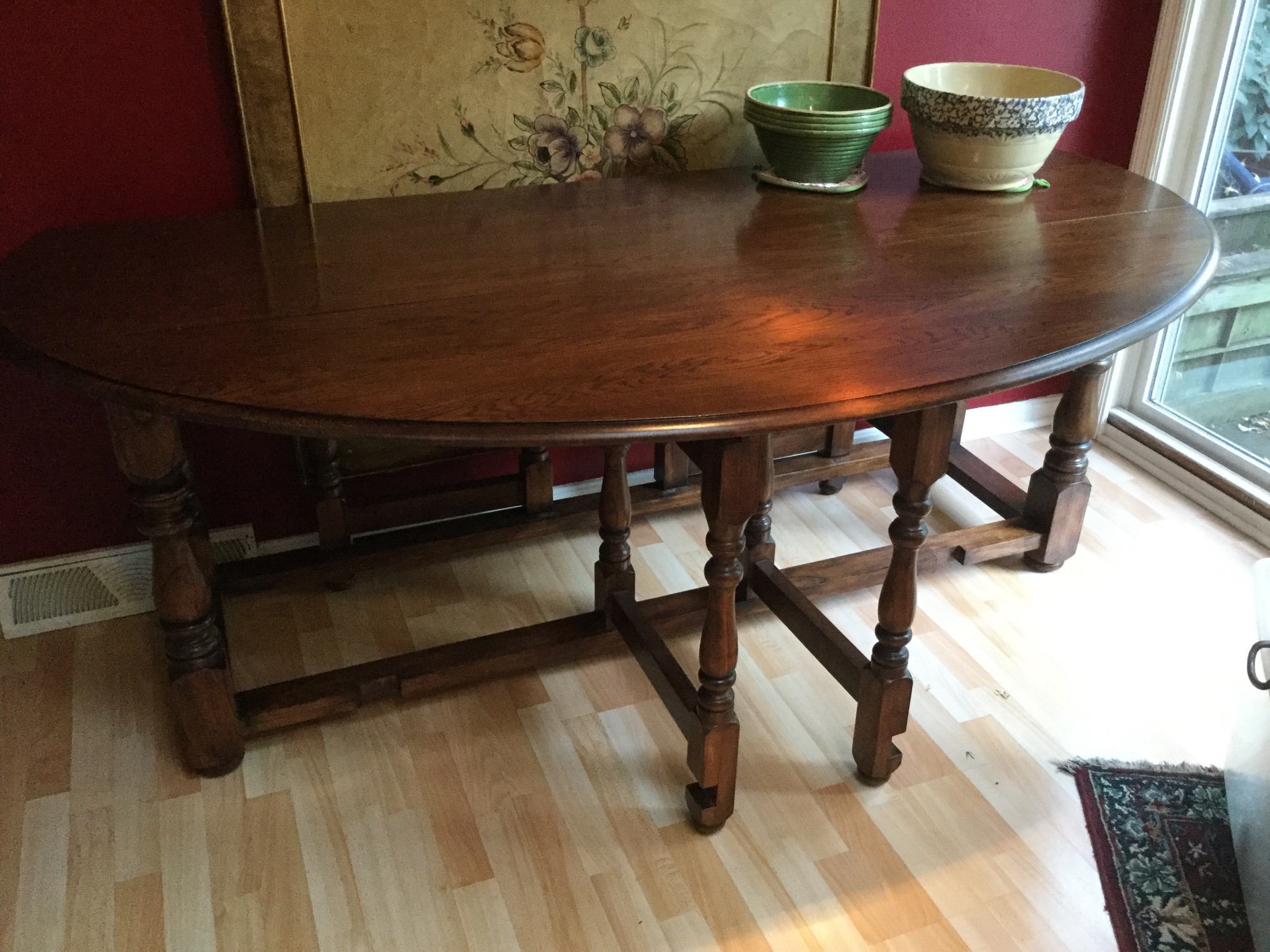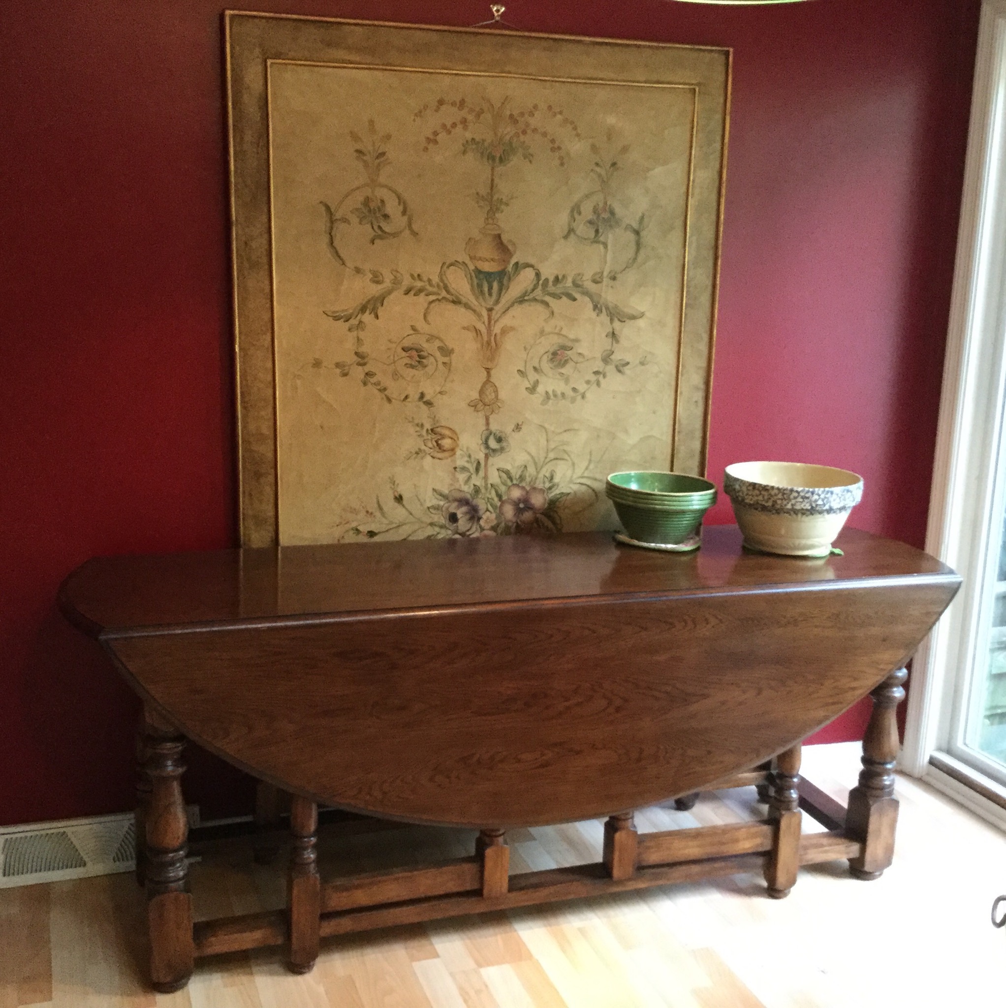 An “ohmygosh-wow” 7’ long drop side gate-leg like-new dining or wall-sofa table, several drafting/art tables including a large Vemco, a darling maple bench, oval 2-pedastal one drawer table that needs some refinishing/painting love …