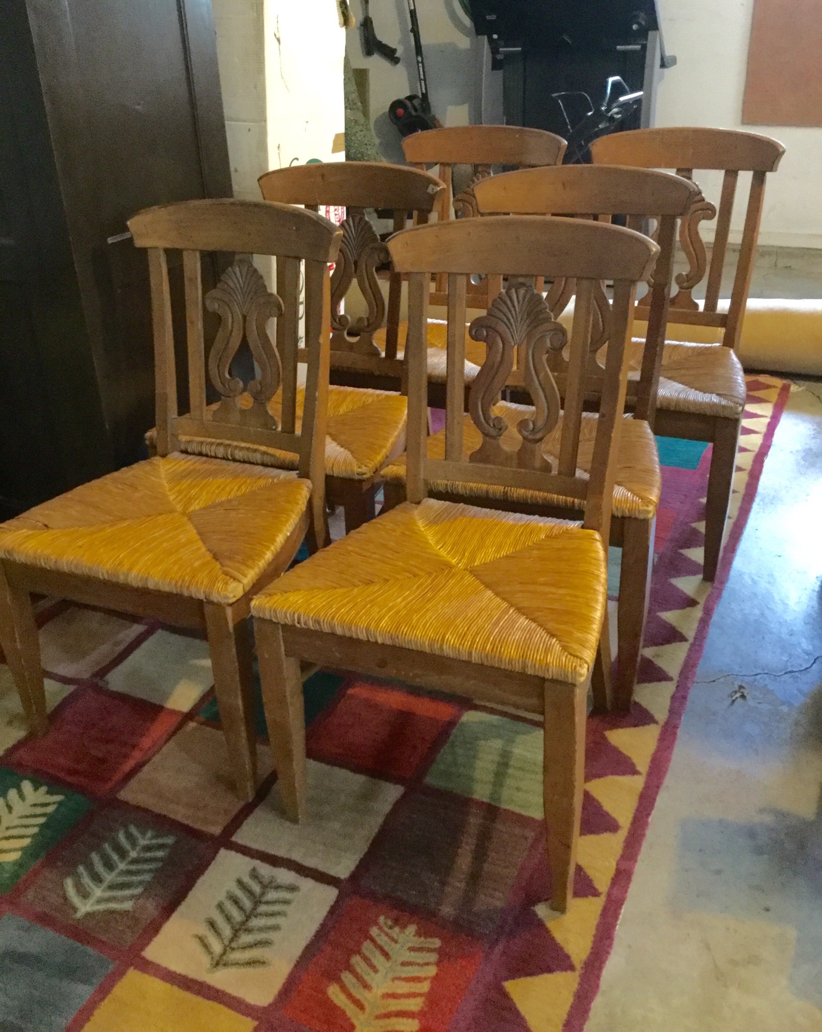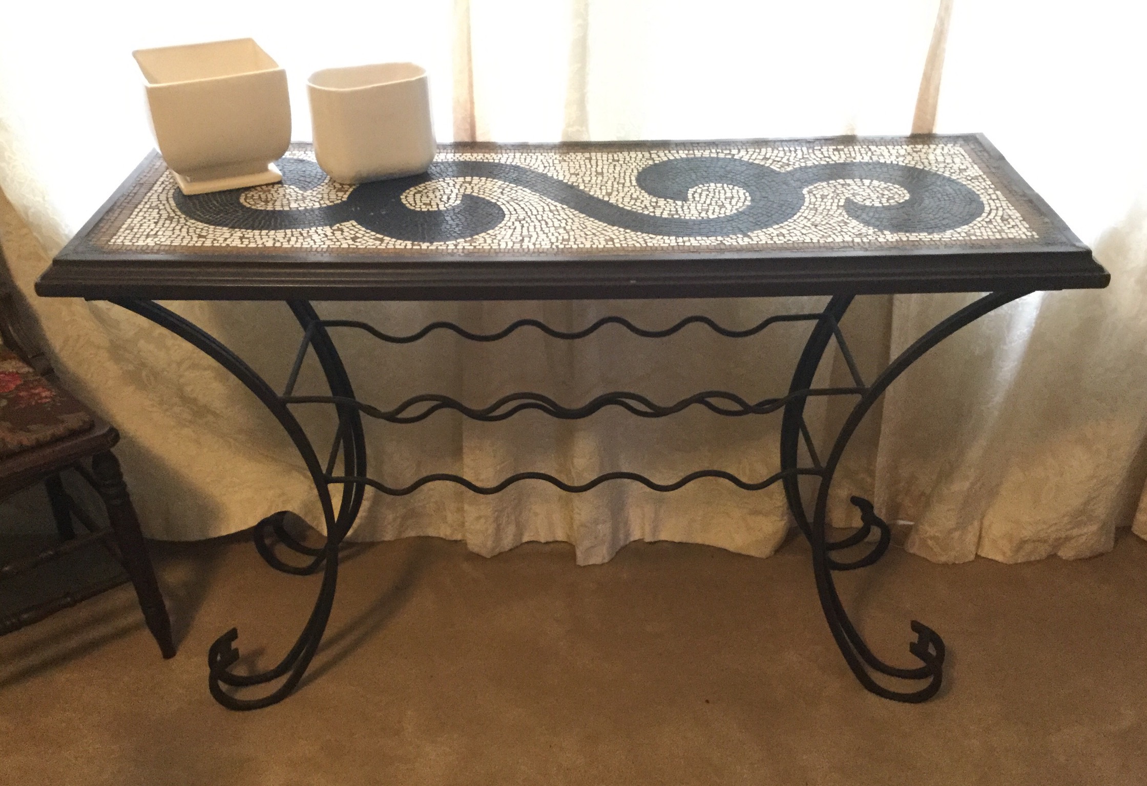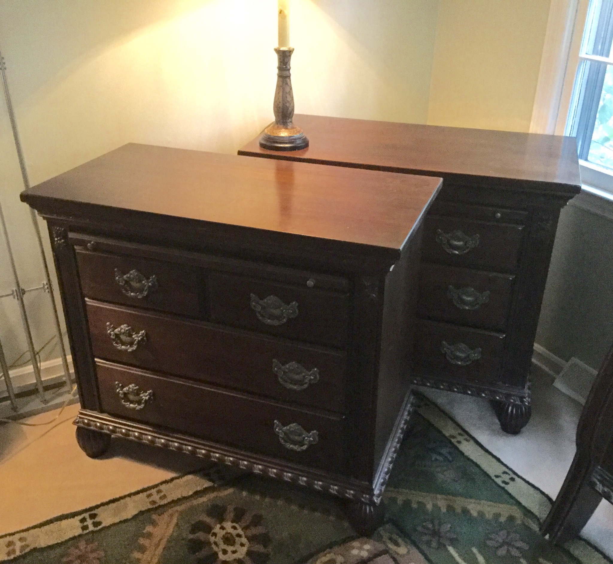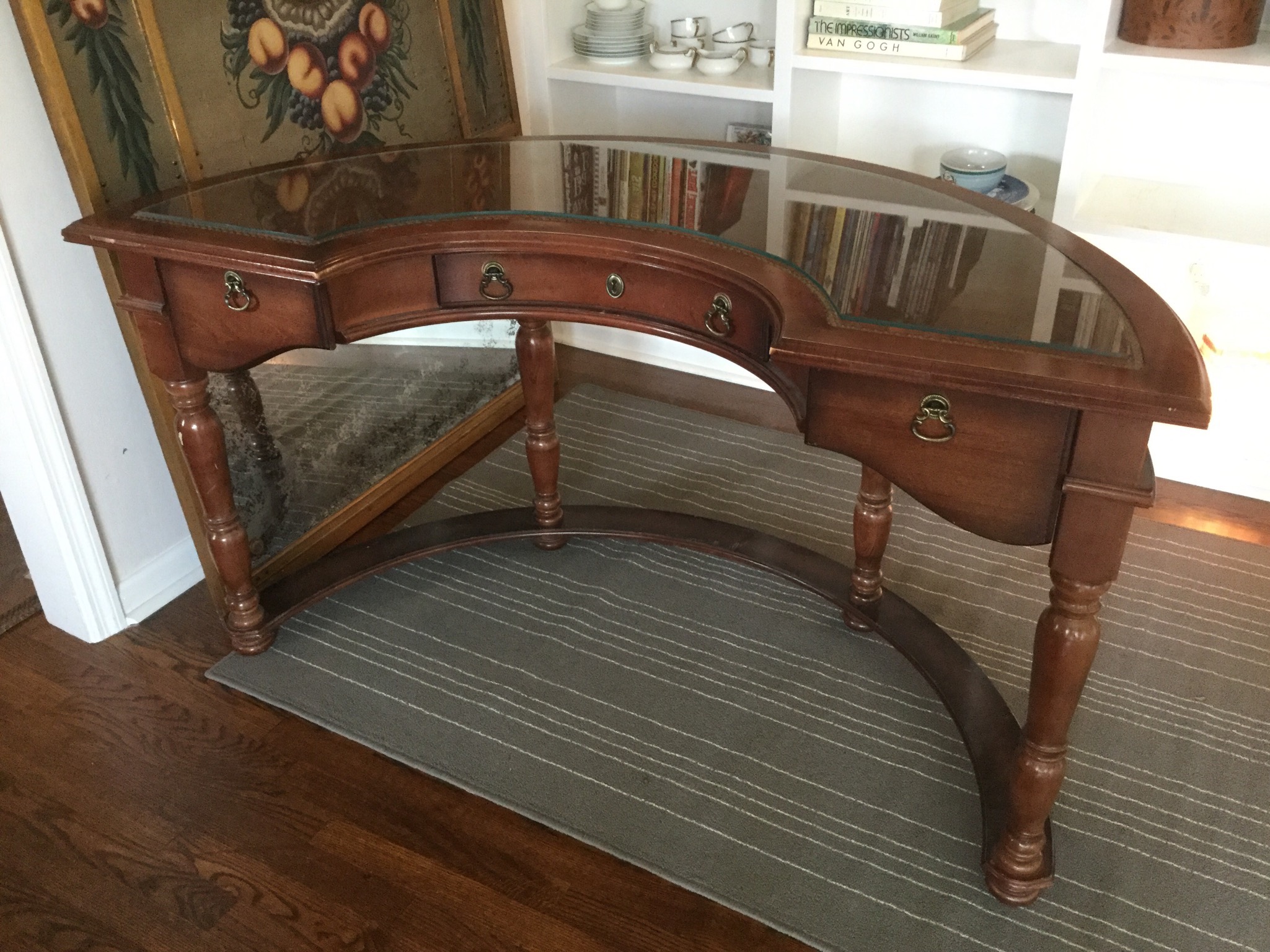 A stunning Pulaski half-moon 3 drawer leather top desk (w glass top), cute 4-drawer antique desk, mosaic top with iron base wall table, set of 4 lovely ladder back antique chairs, a sweet neutral 2 cushion couch (apologies for the bad lighting pic!) …