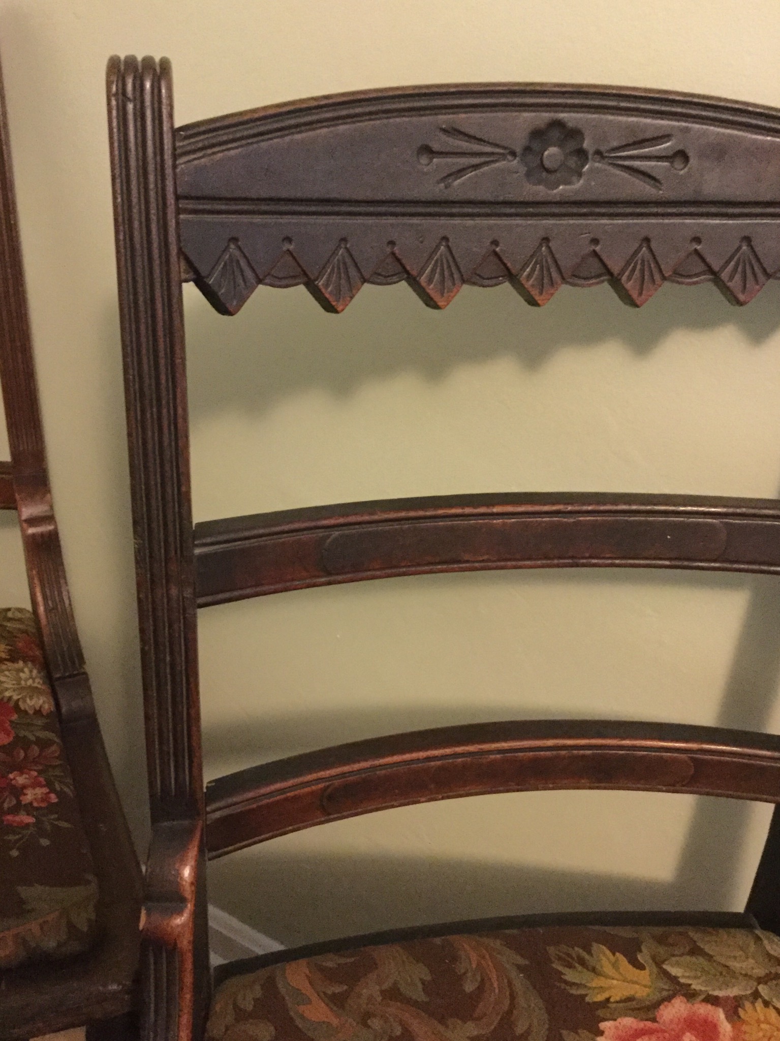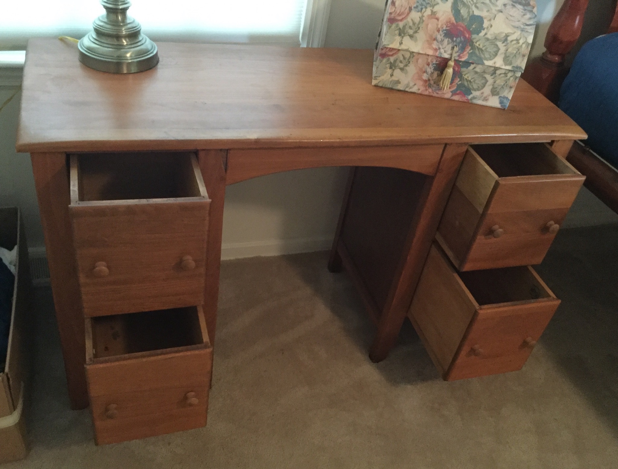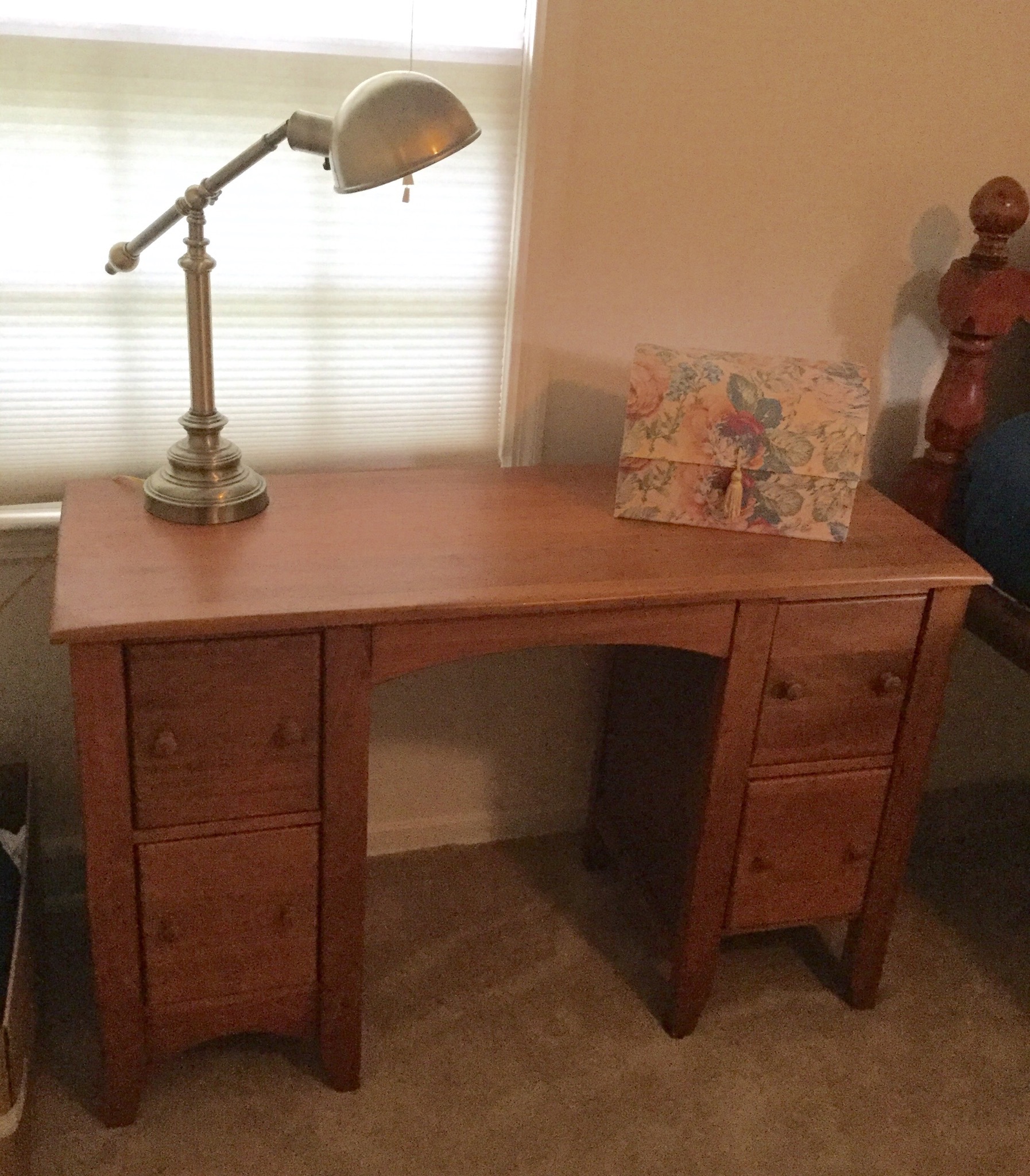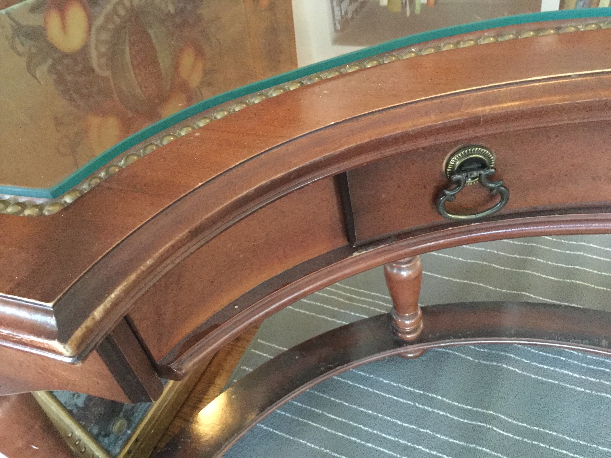 A stunning Pulaski half-moon 3 drawer leather top desk (w glass top), cute 4-drawer antique desk, mosaic top with iron base wall table, set of 4 lovely ladder back antique chairs, a sweet neutral 2 cushion couch (apologies for the bad lighting pic!) …
