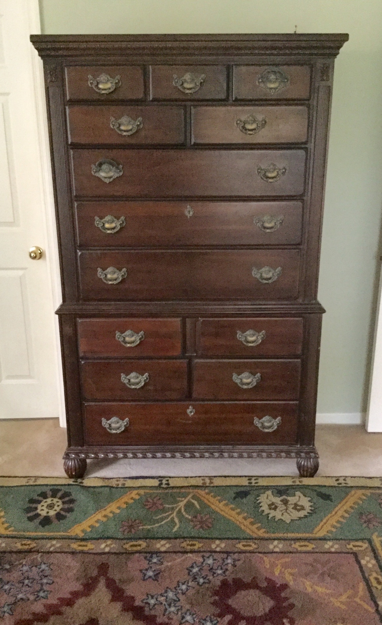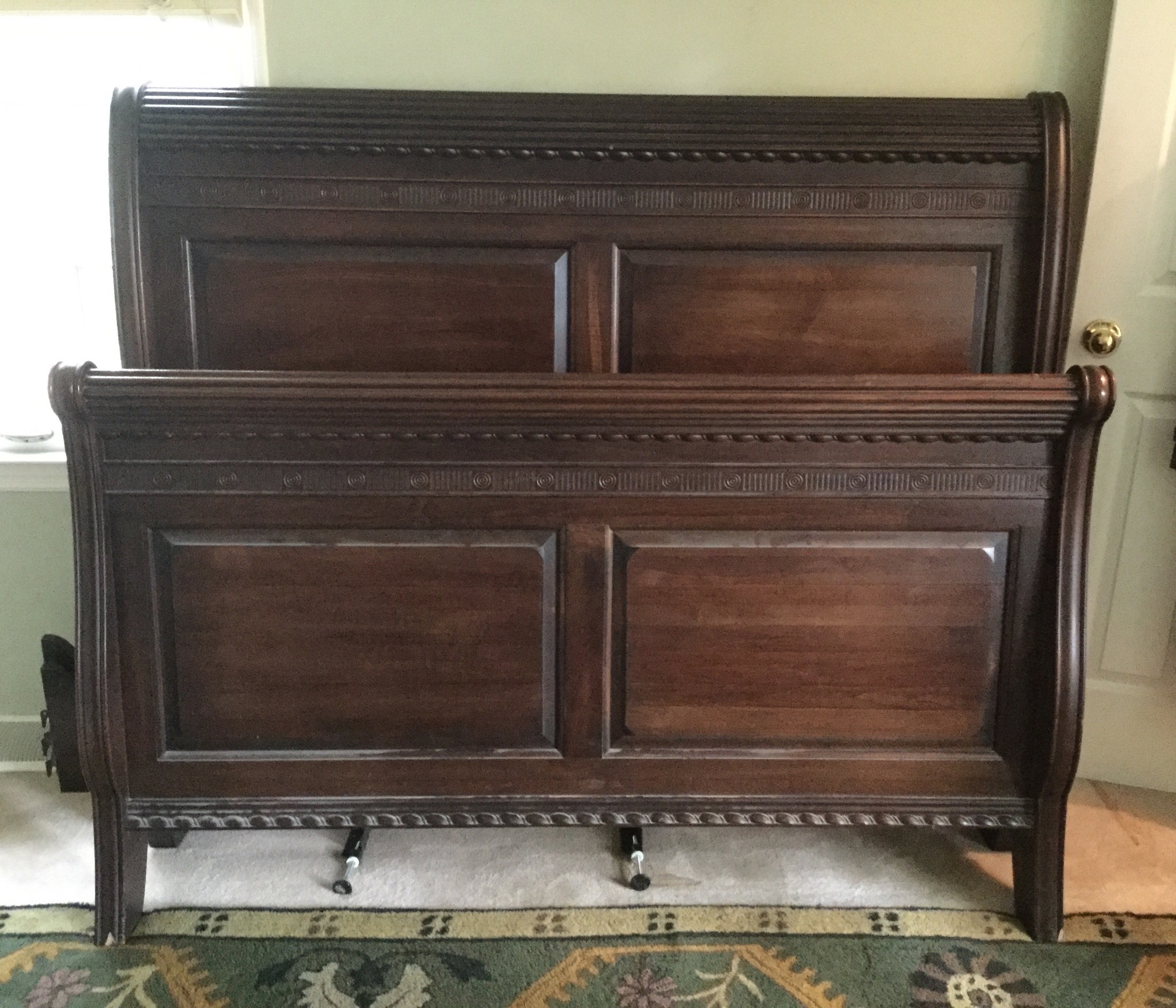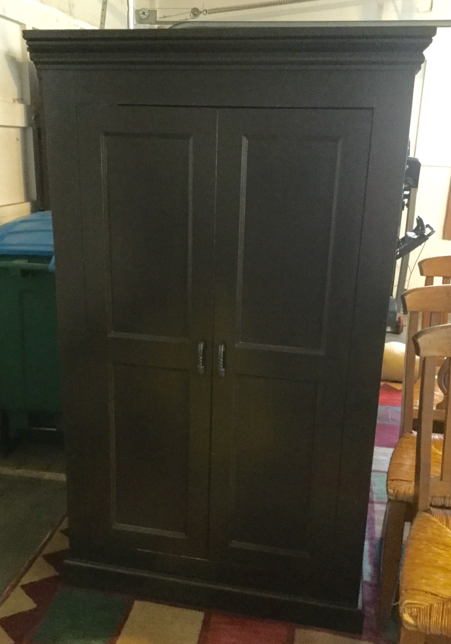 Kinkaid bedroom set: queen sleigh bed, tall boy and pair of night stands (that are so spiff you could use them as end tables or small chests, brown wardrobe, 6 rush seat chairs …