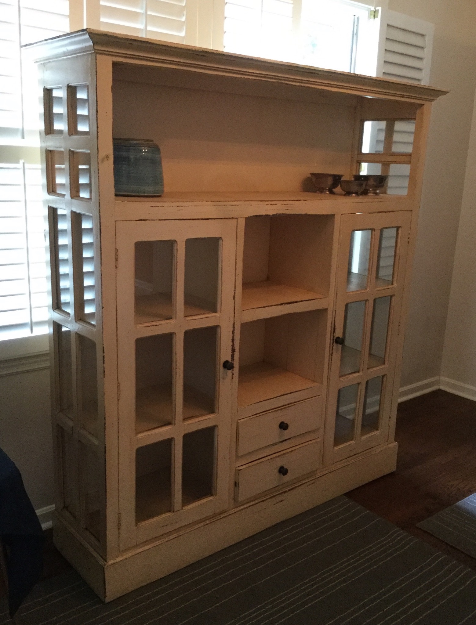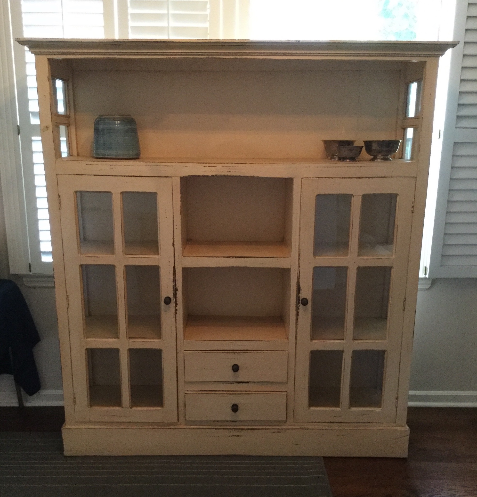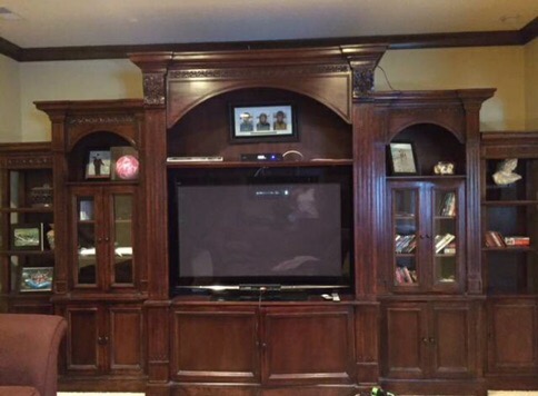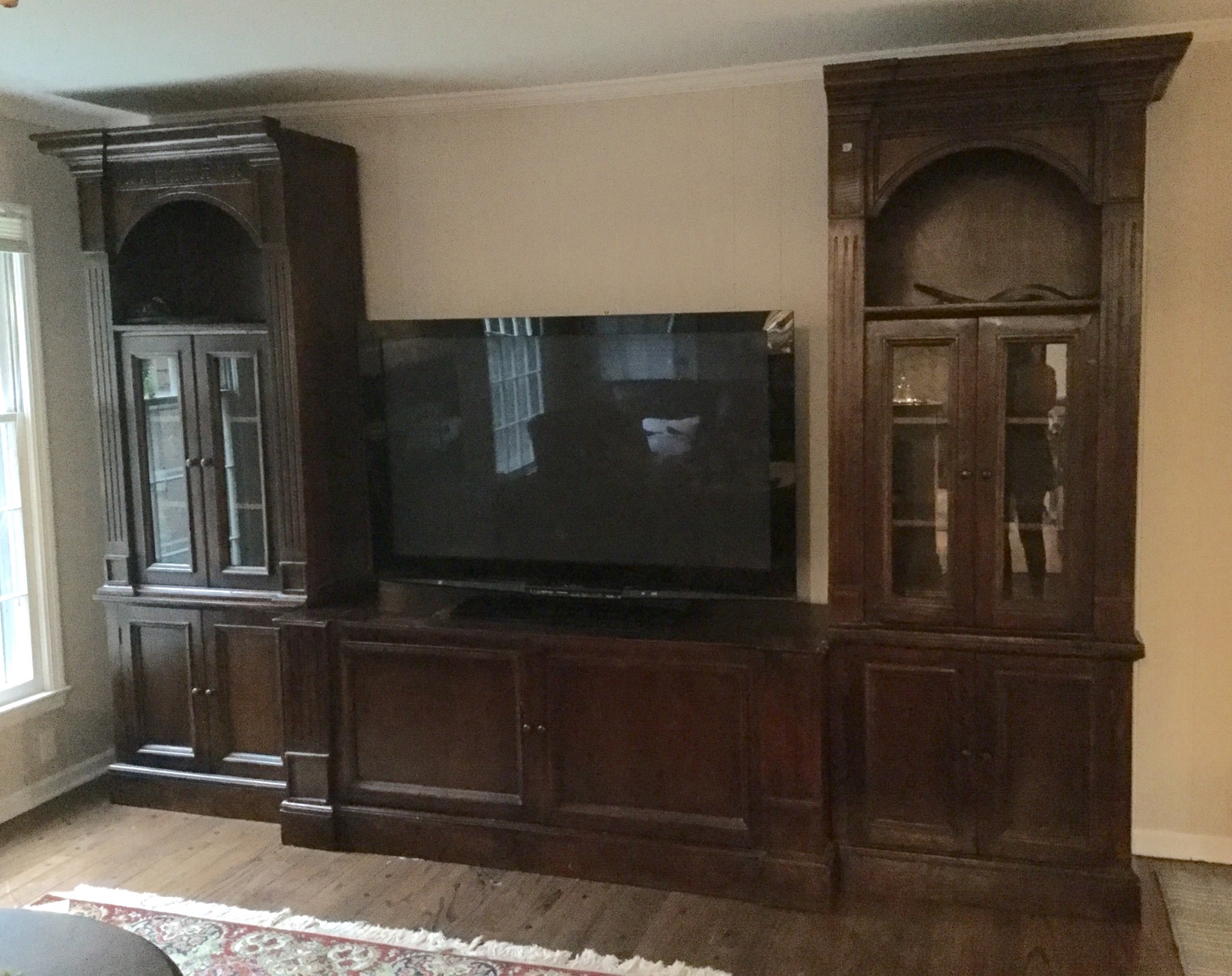 Substantial wall entertainment center … one pic is from before it went to storage, the one with the large flatscreen is of partial pieces. This piece will be offered as one unit, but will be taking bids on pieces to be sold separately …