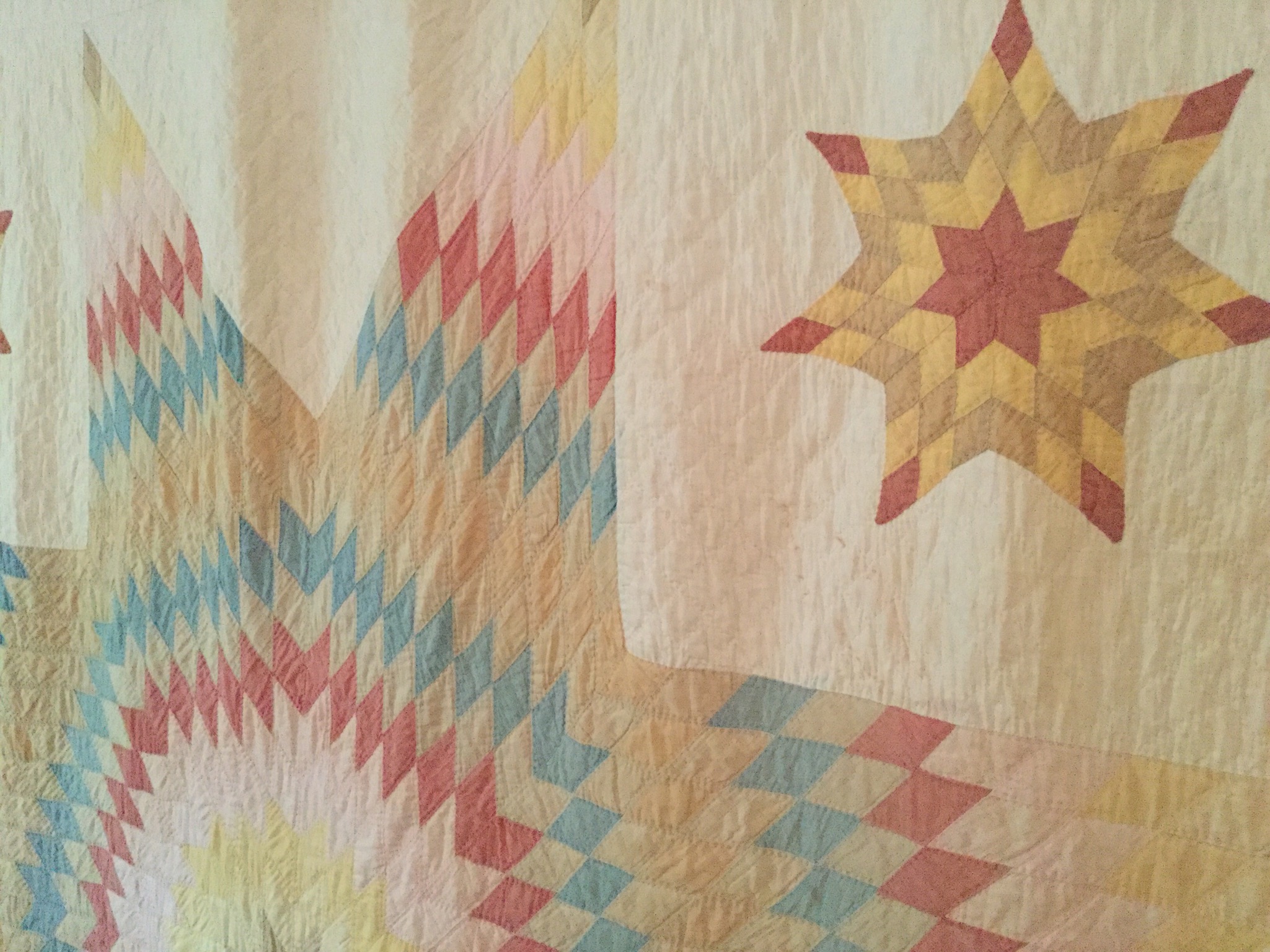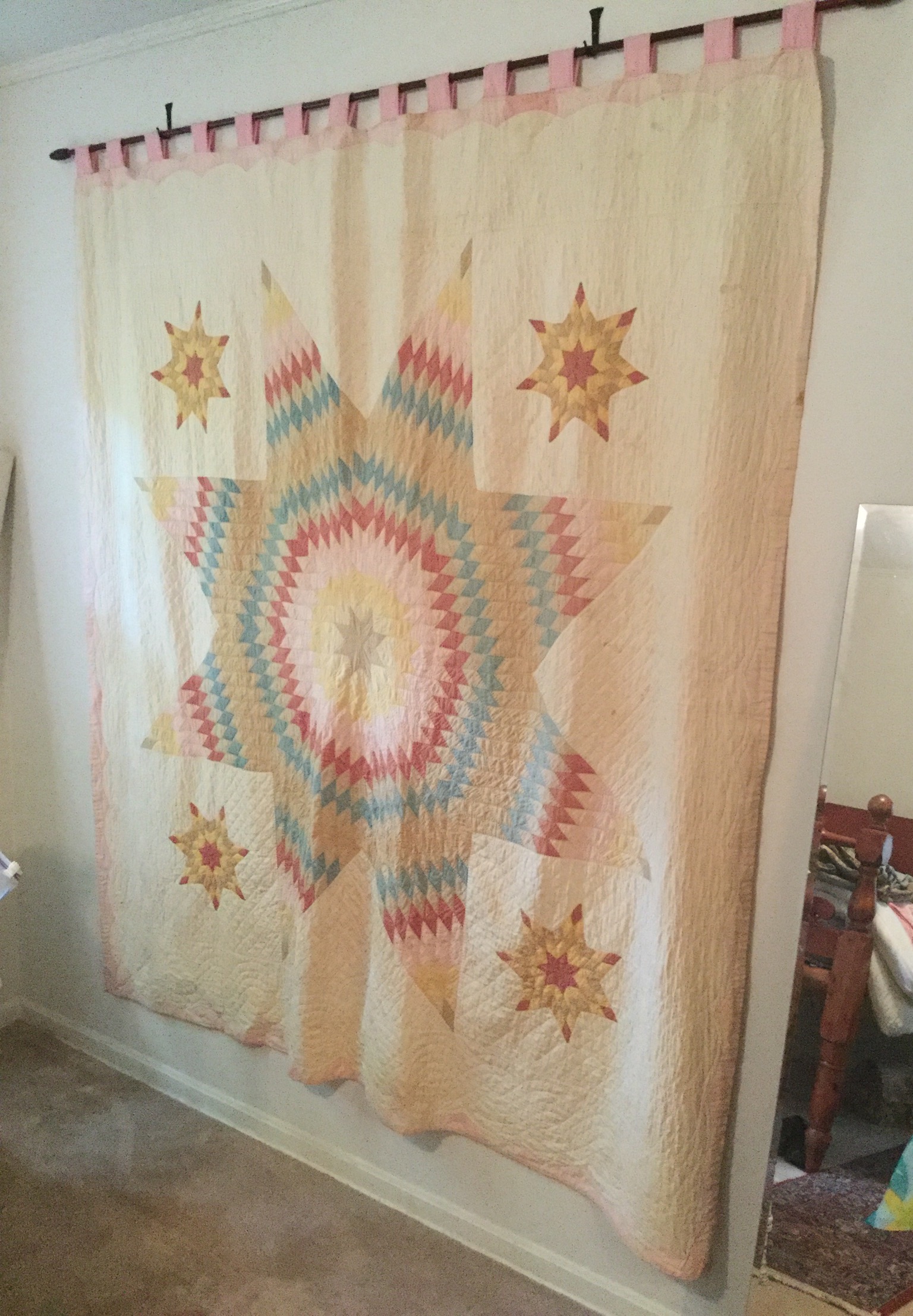 Good selection of antique quilts – one is displayed as wall art (this 8-point star/”Lone Star” quilt came from her grandfather’s antique shop out East years ago, several vintage tablecloths and lots of other linens …