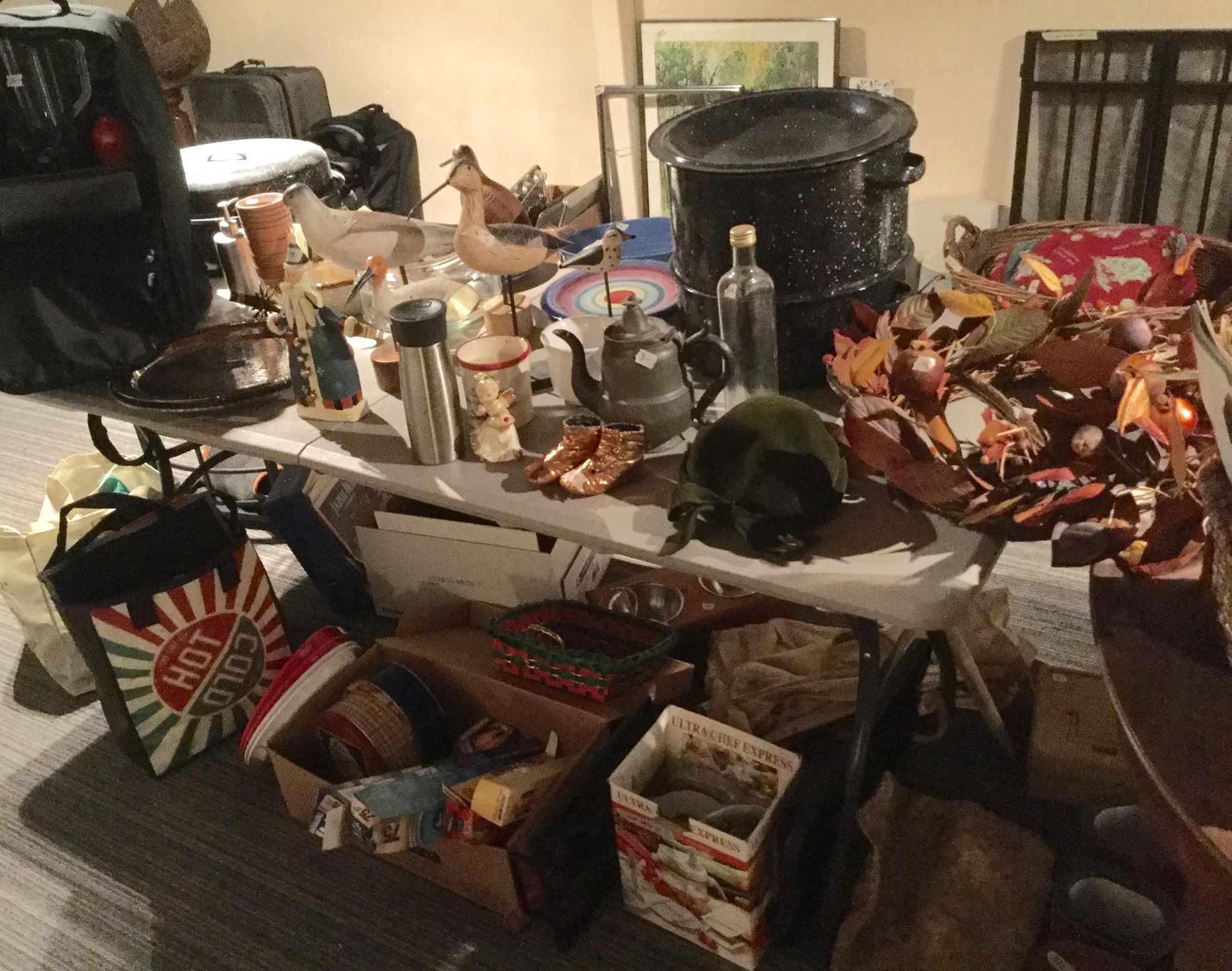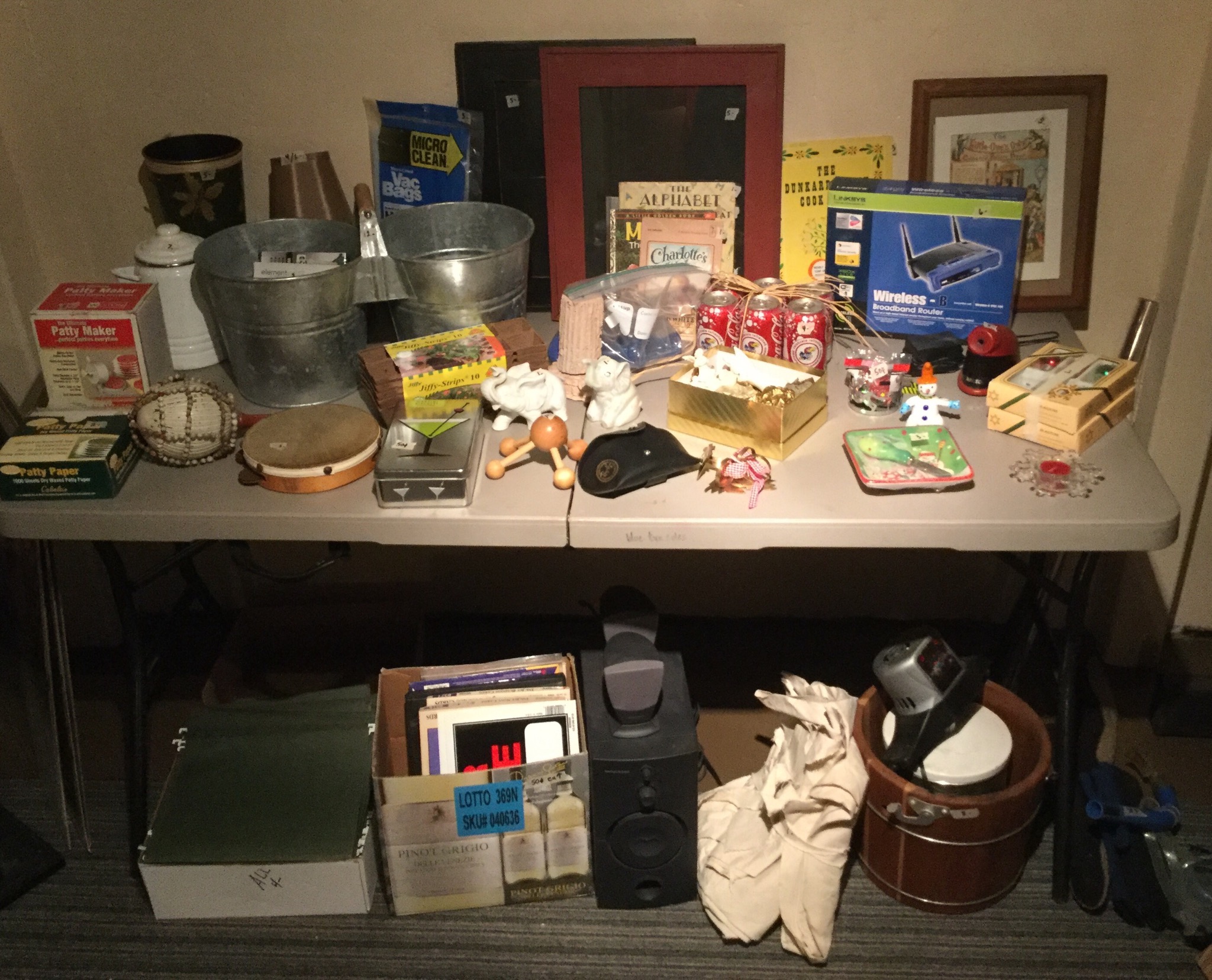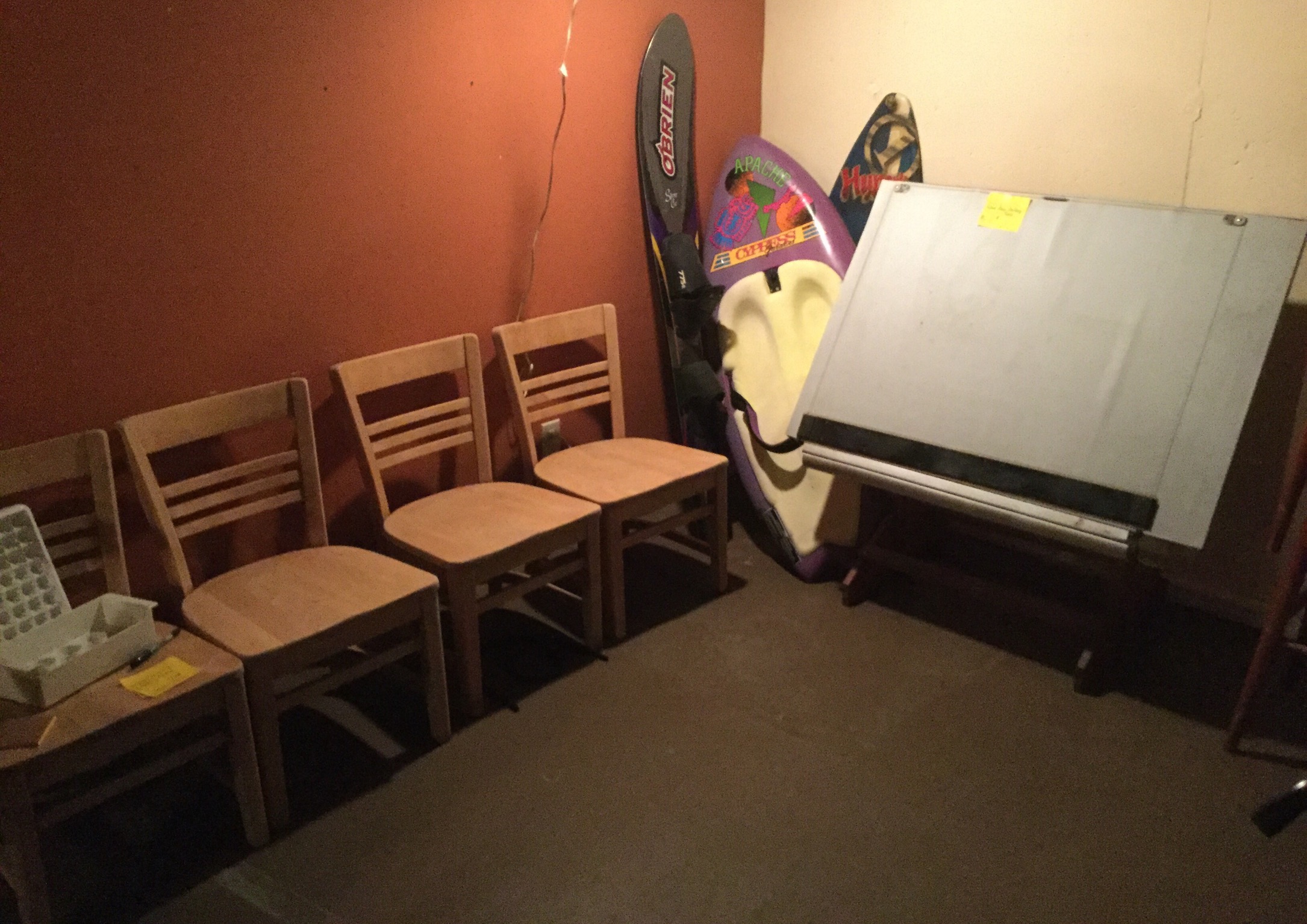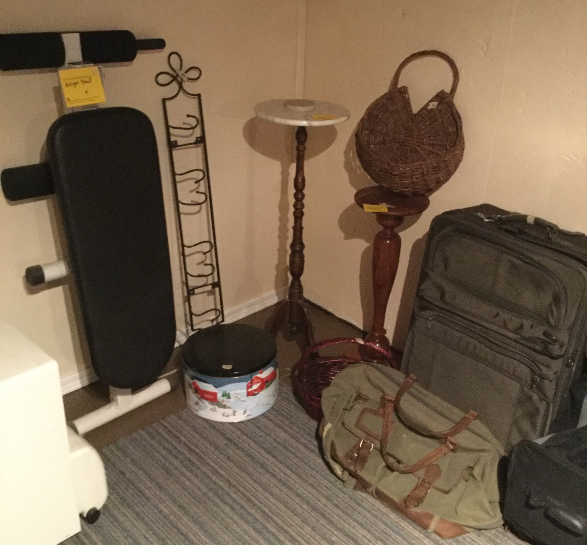 Antique Columbia Grafonola, antique mantel clock, silverplate tea set, 2 Waterford Lismore stems, books, Hon file cab, old trombone, 4 wood library chairs, wakeboard, slolam ski, homemade wine rack/shoe rack/whatever rack (pvc pipes) …