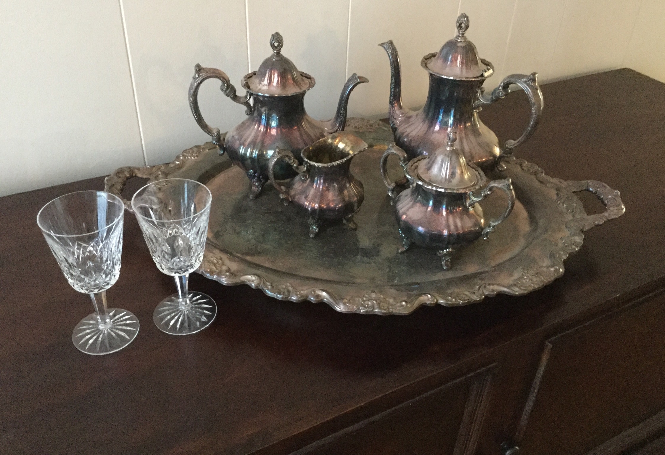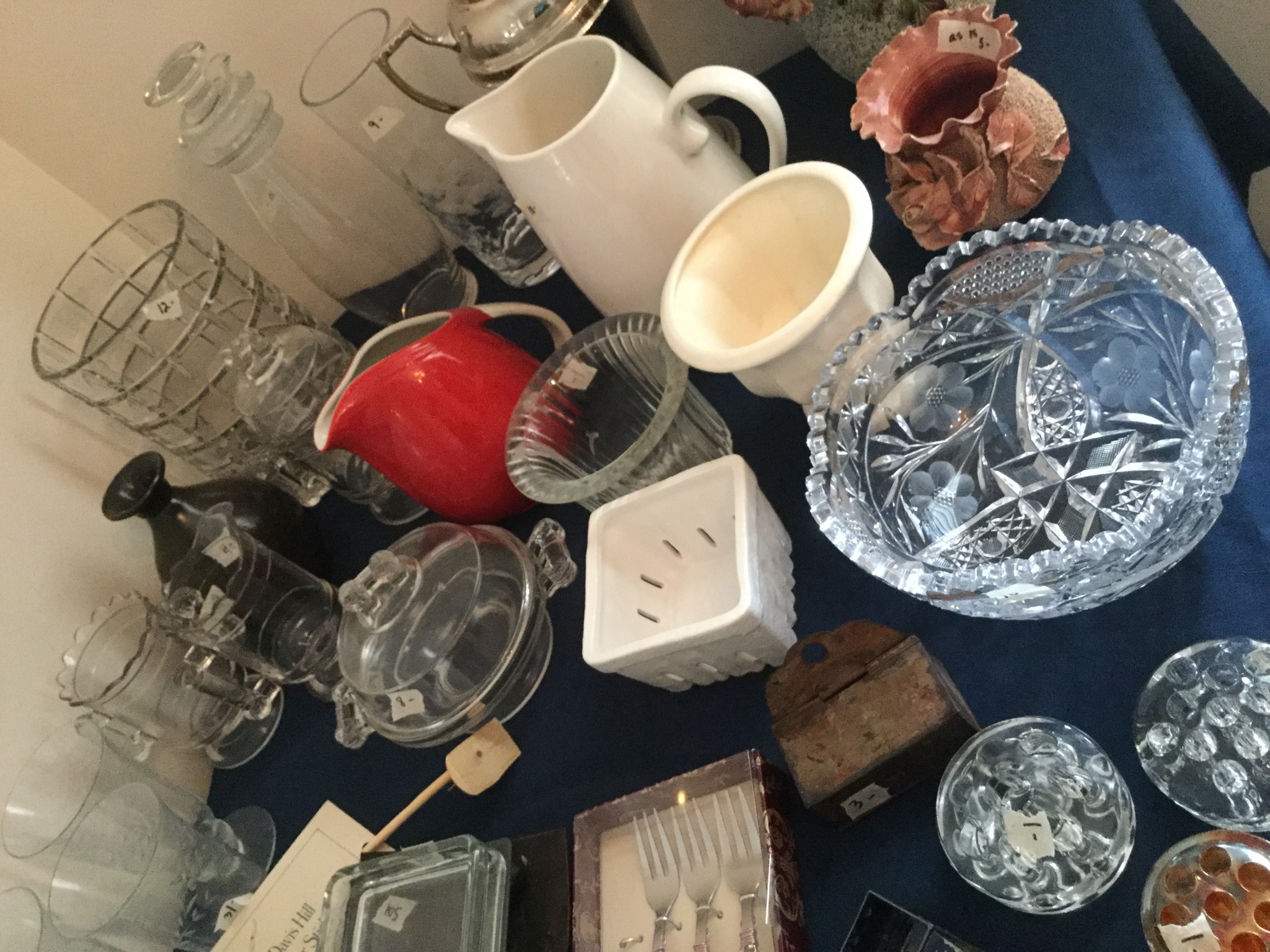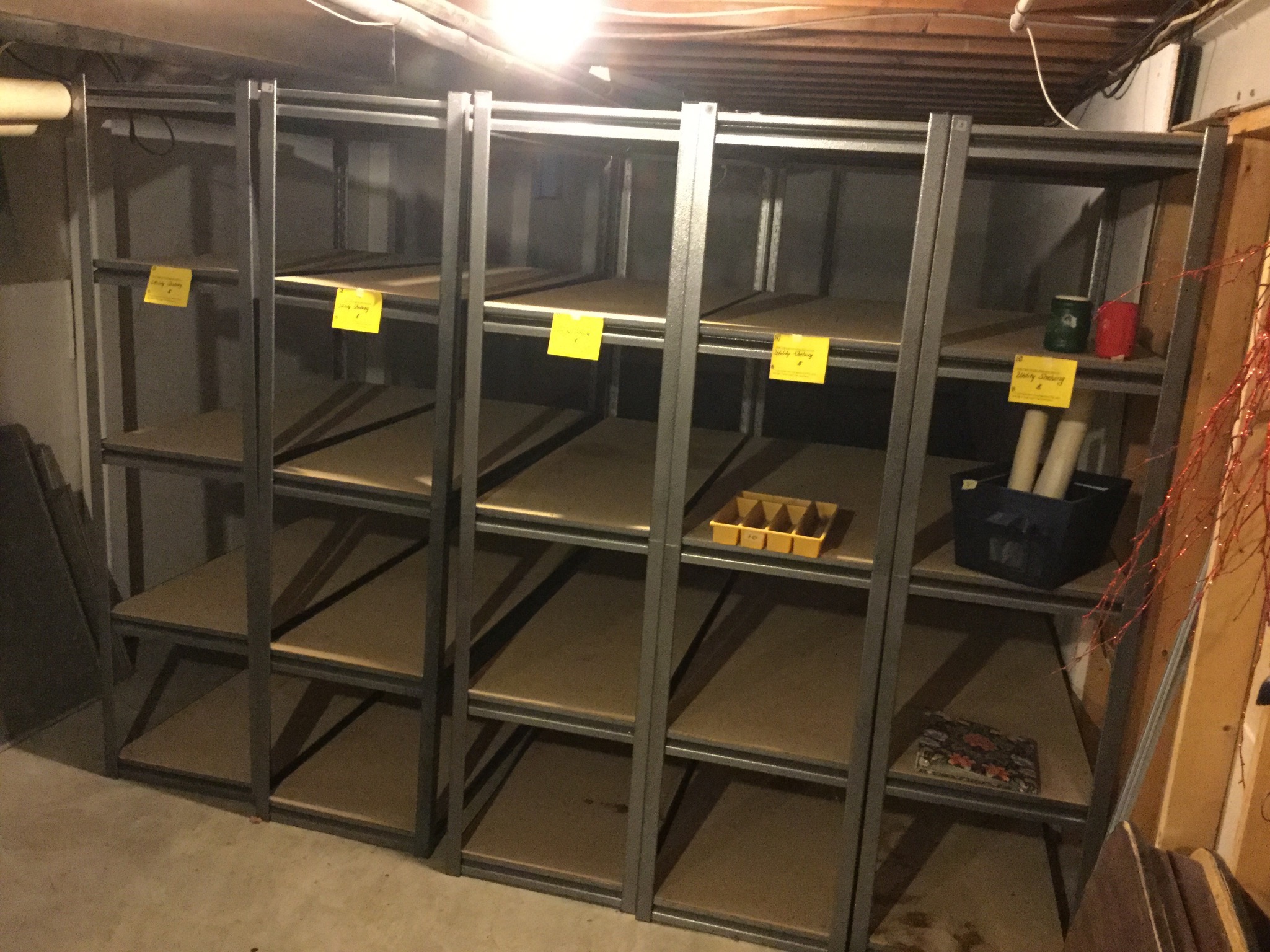 Antique Columbia Grafonola, antique mantel clock, silverplate tea set, 2 Waterford Lismore stems, books, Hon file cab, old trombone, 4 wood library chairs, wakeboard, slolam ski, homemade wine rack/shoe rack/whatever rack (pvc pipes) …