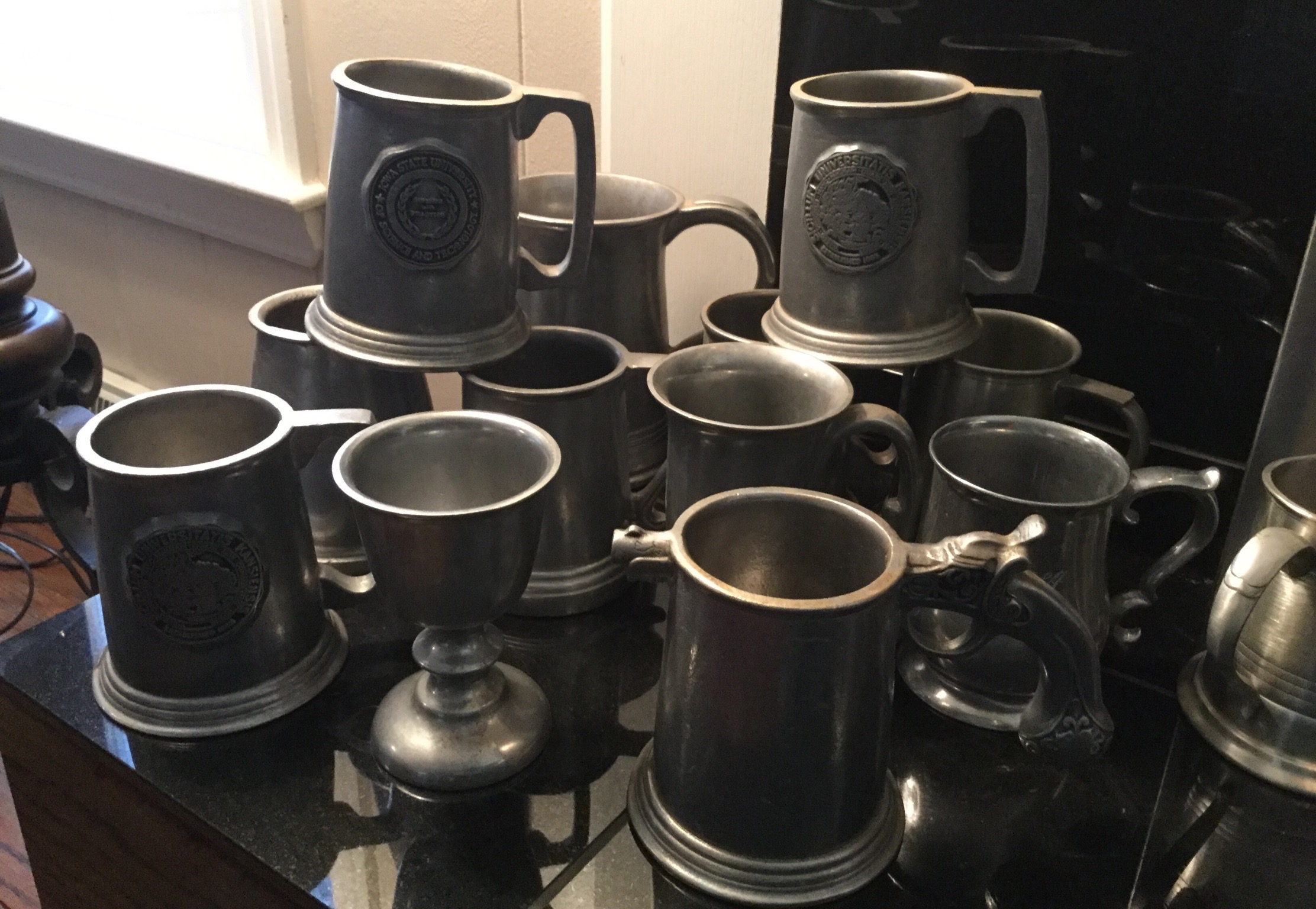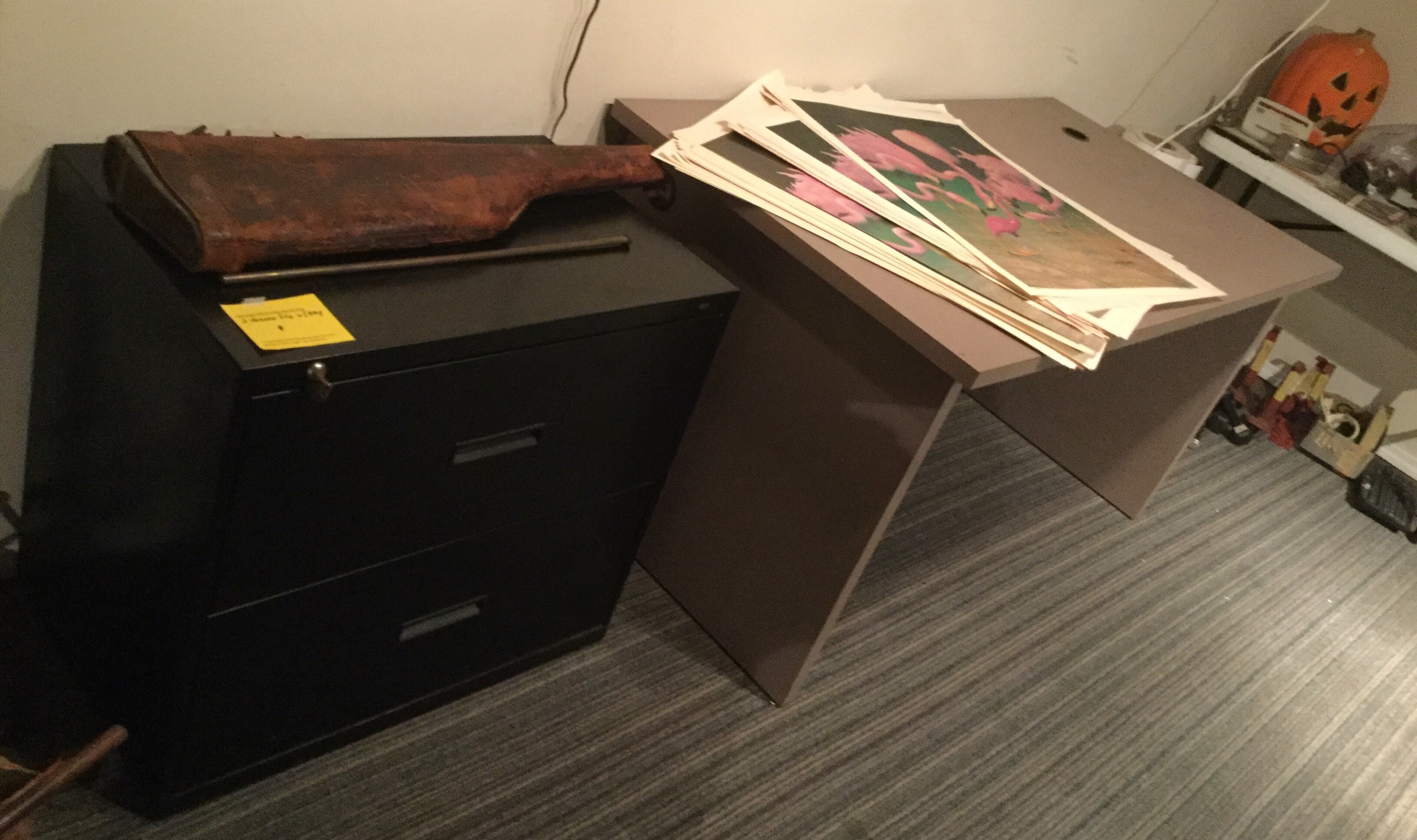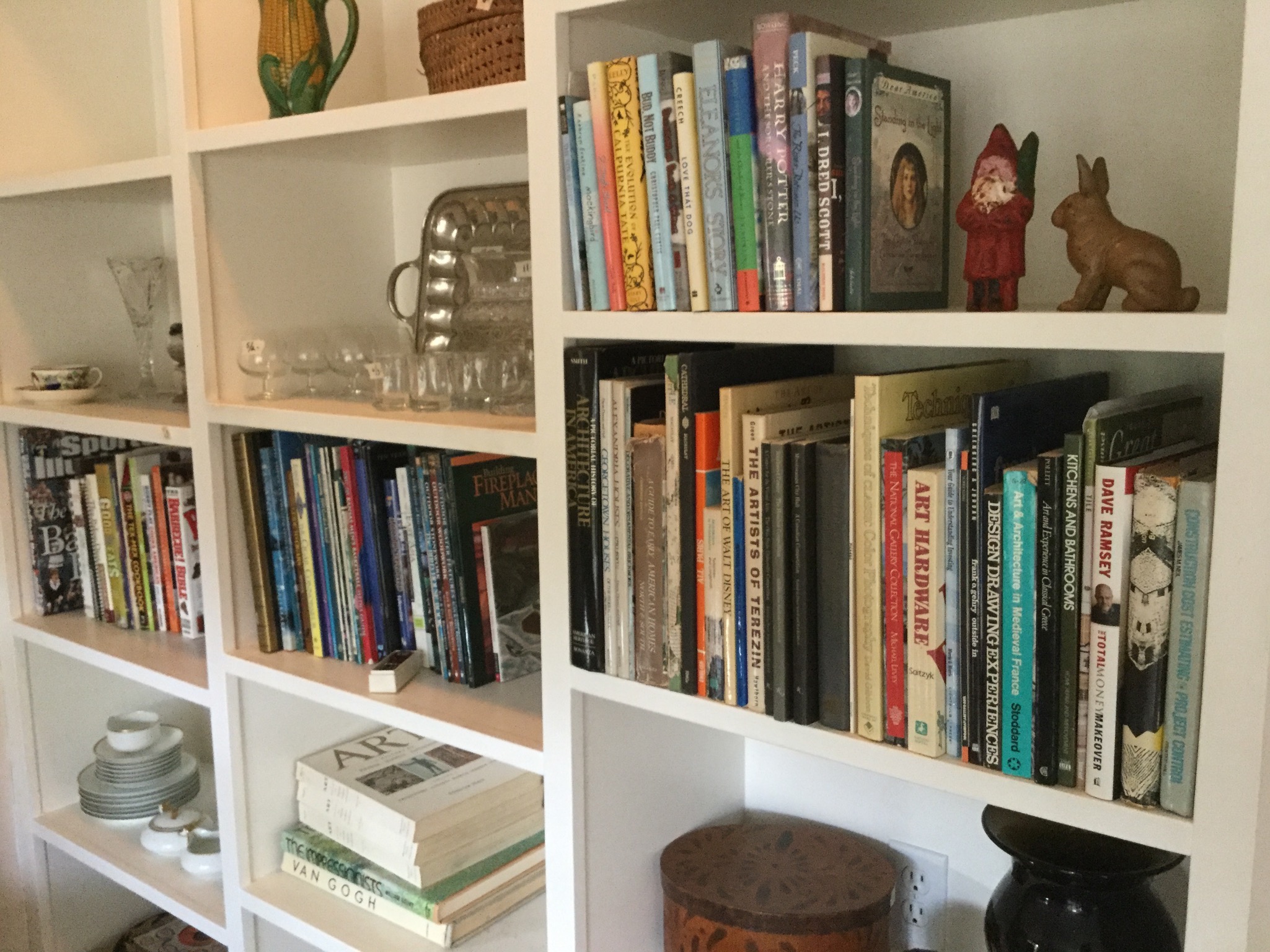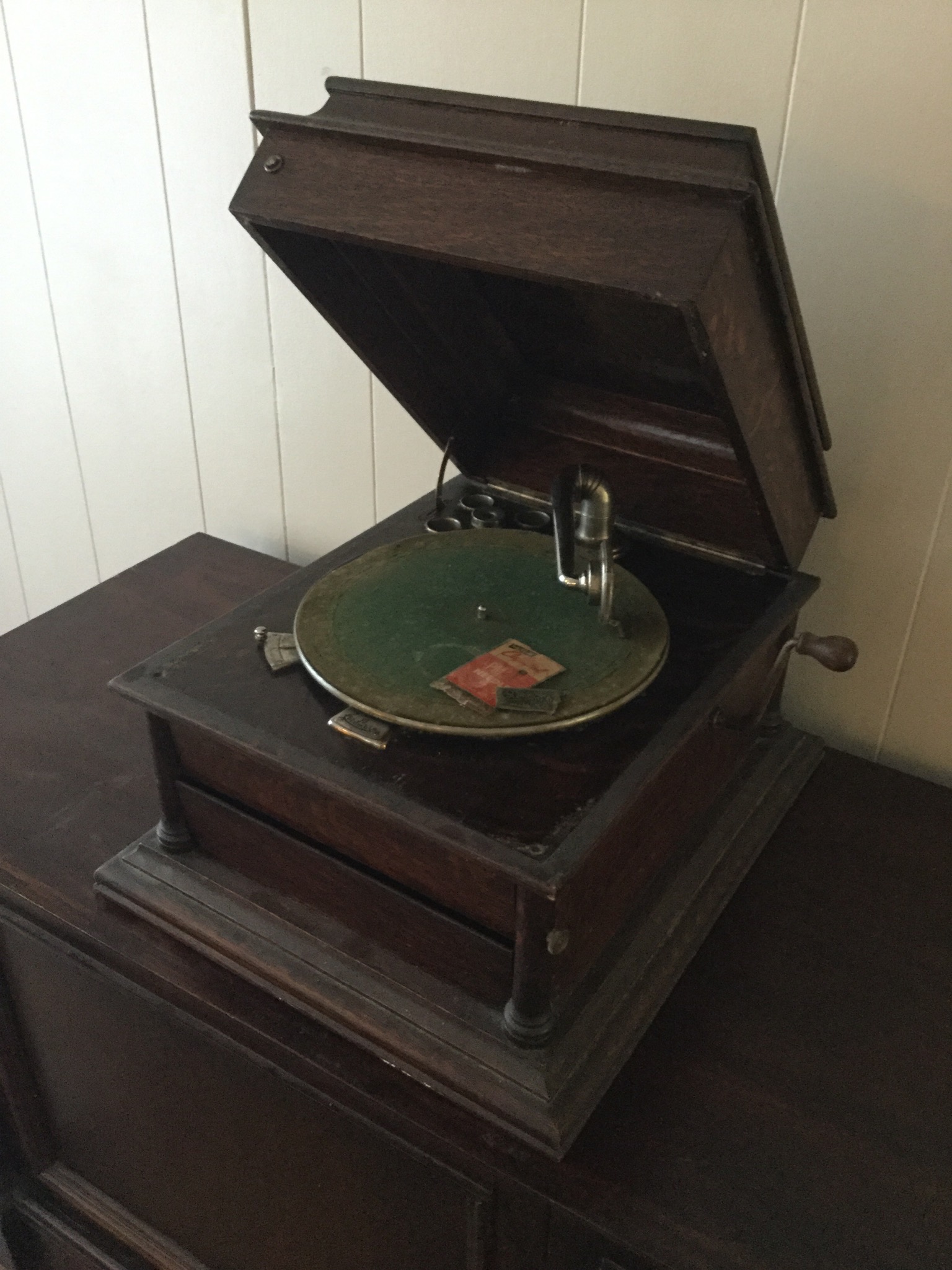 Antique Columbia Grafonola, antique mantel clock, silverplate tea set, 2 Waterford Lismore stems, books, Hon file cab, old trombone, 4 wood library chairs, wakeboard, slolam ski, homemade wine rack/shoe rack/whatever rack (pvc pipes) …